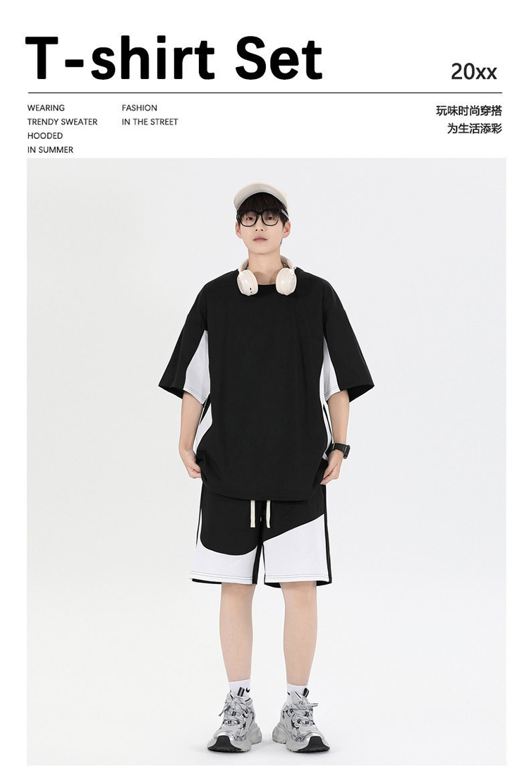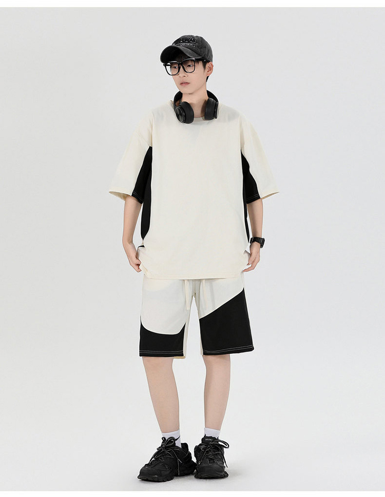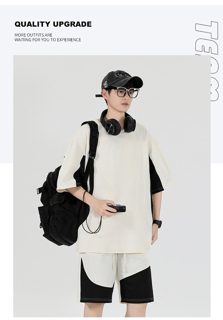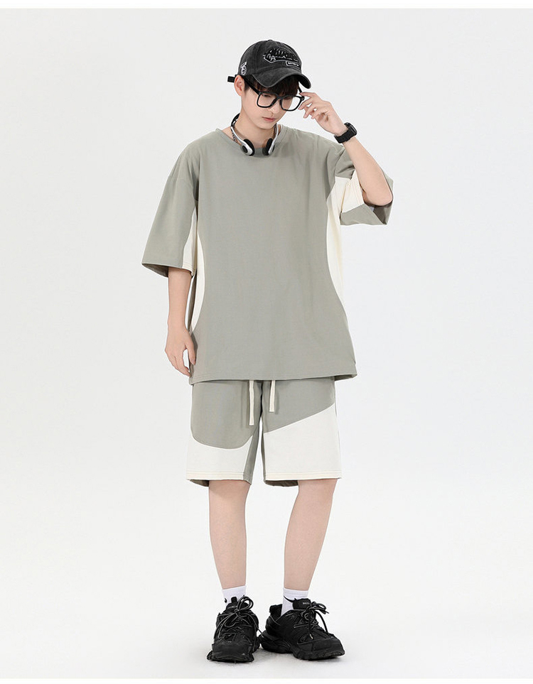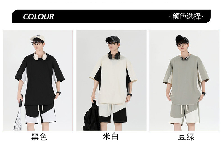 새로운 여름 패치워크 색상 캐주얼 스포츠 슈트 남자 청소년 조수 브랜드 악당 잘 생긴 반팔 반바지 세트