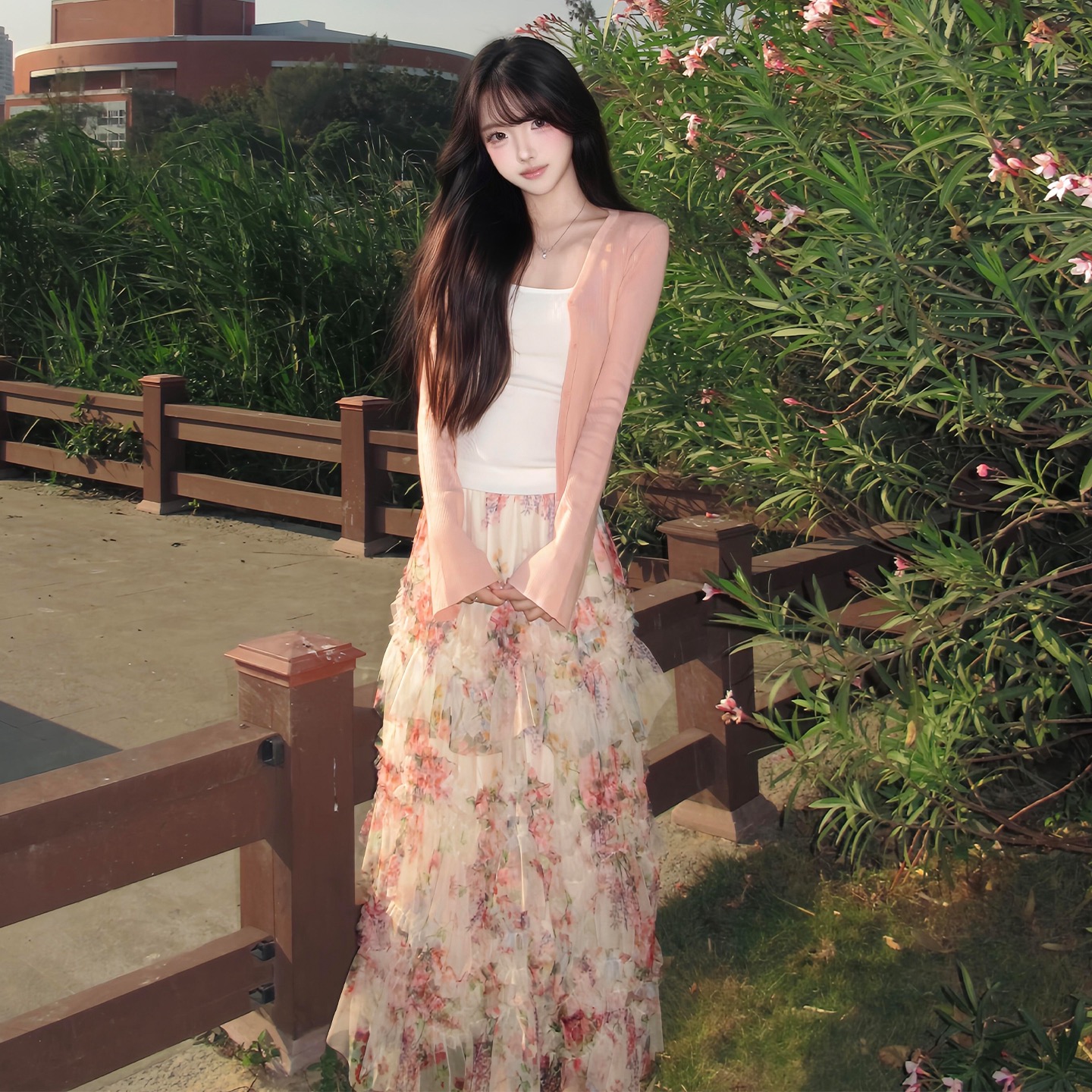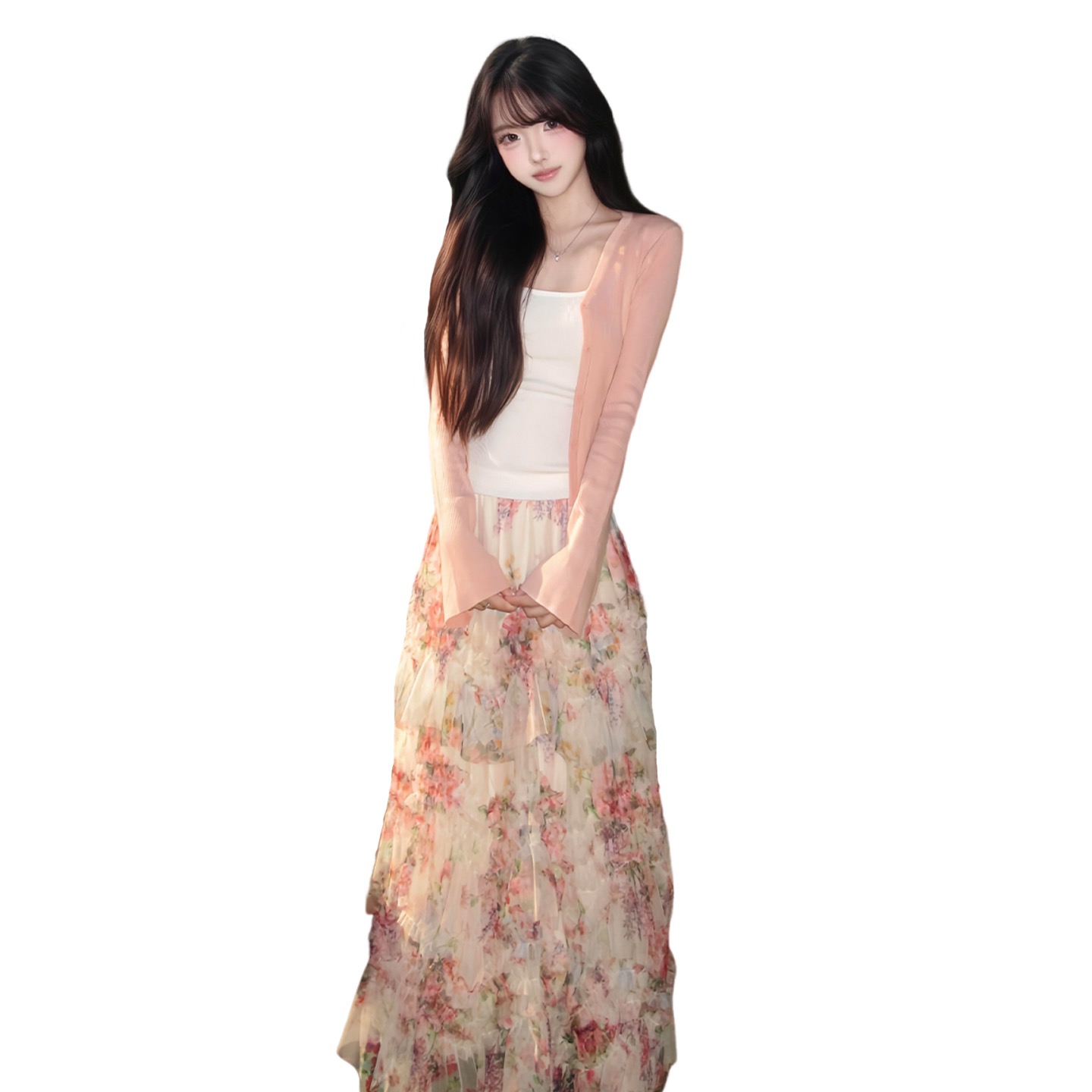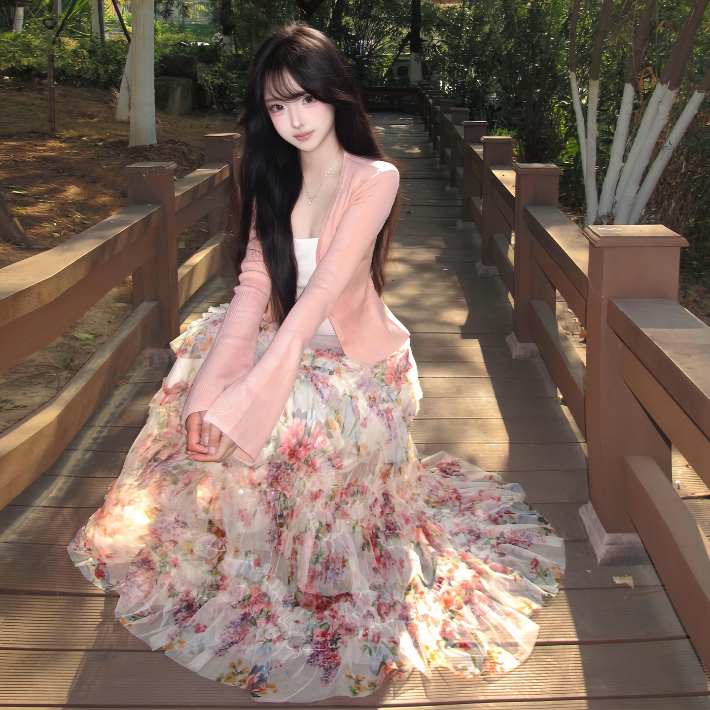 프랑스식 핑크색 꽃무늬 드레스 아이들 이른 봄 2026 슈퍼 화재 착용 가져 가라. 에이즈 환자 세트 니트 오픈 가디건 반신 스커트