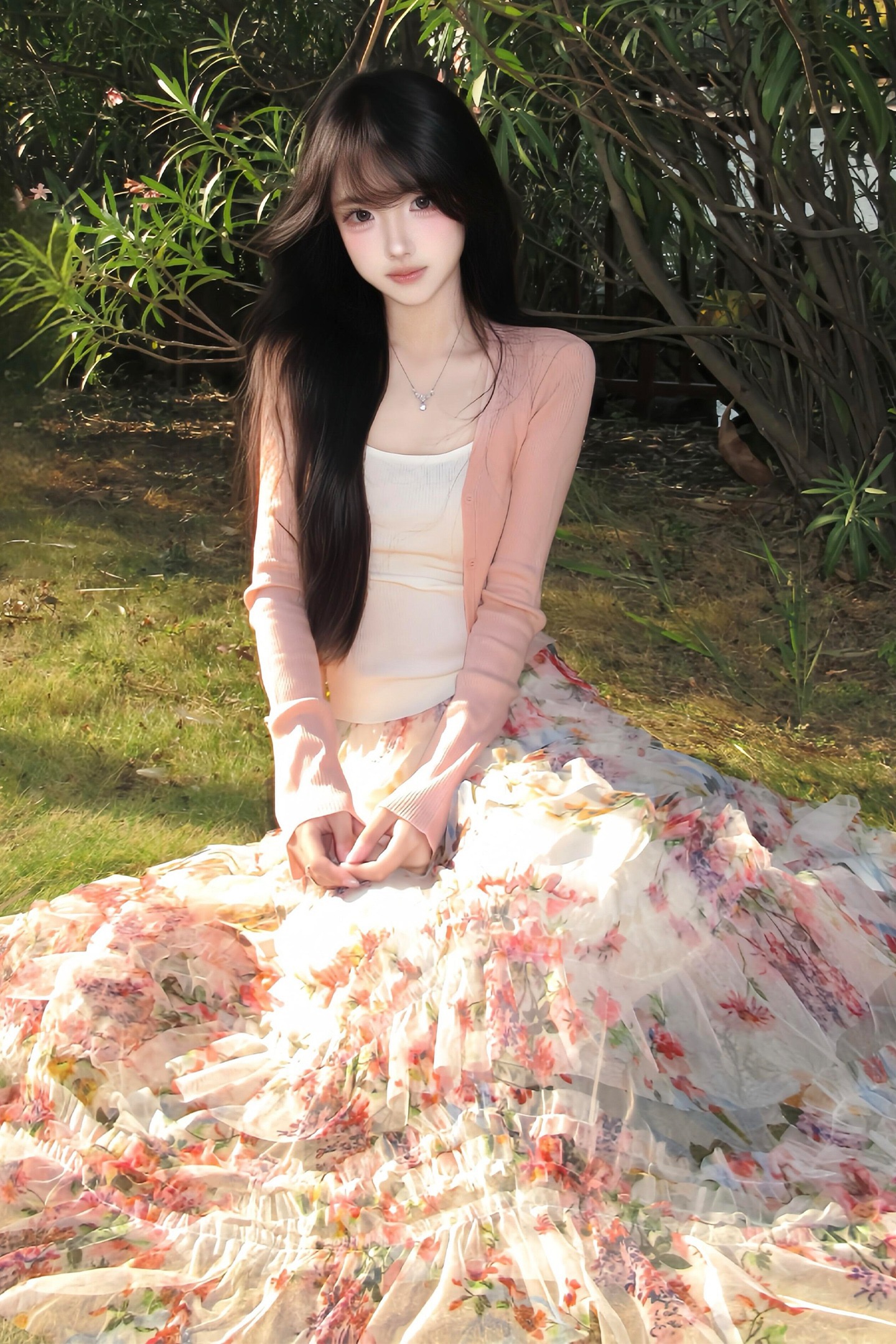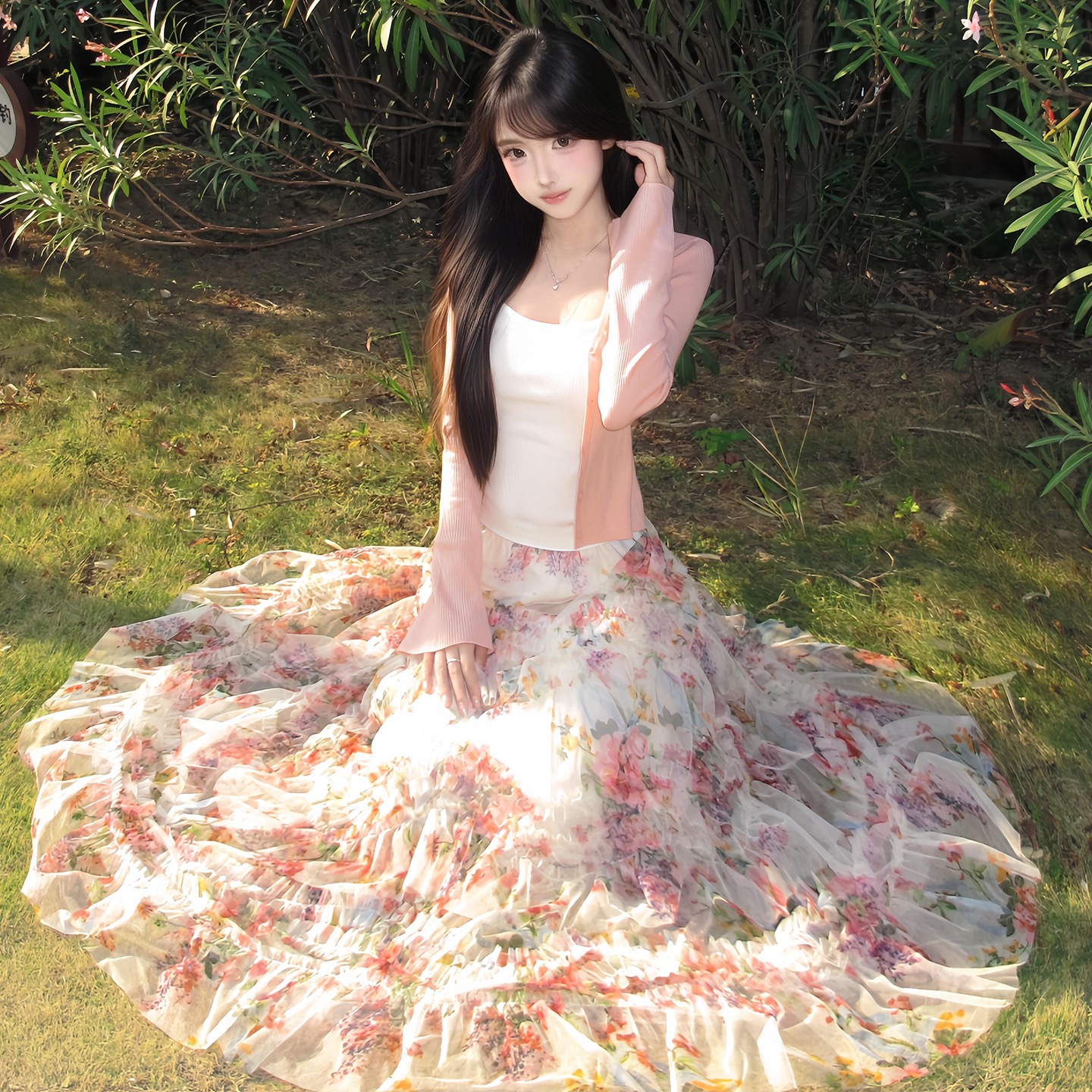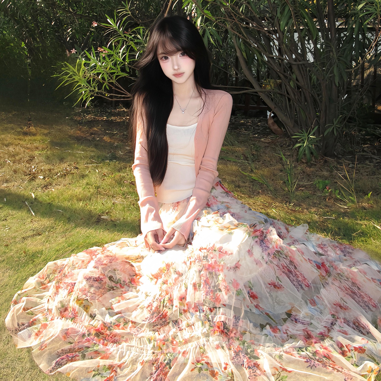 프랑스식 핑크색 꽃무늬 드레스 아이들 이른 봄 2026 슈퍼 화재 착용 가져 가라. 에이즈 환자 세트 니트 오픈 가디건 반신 스커트