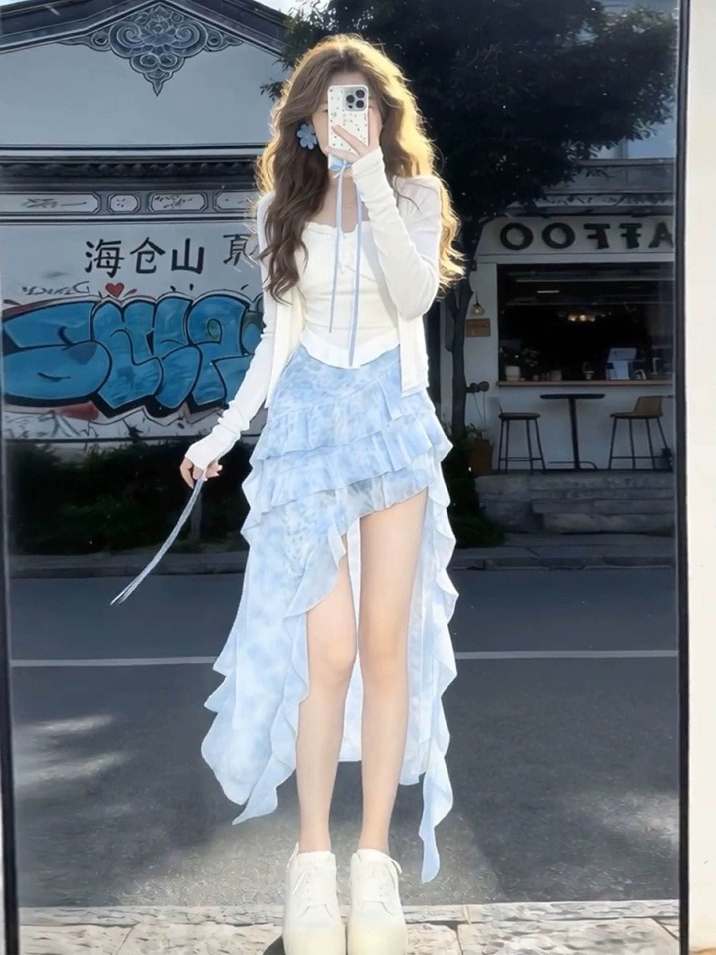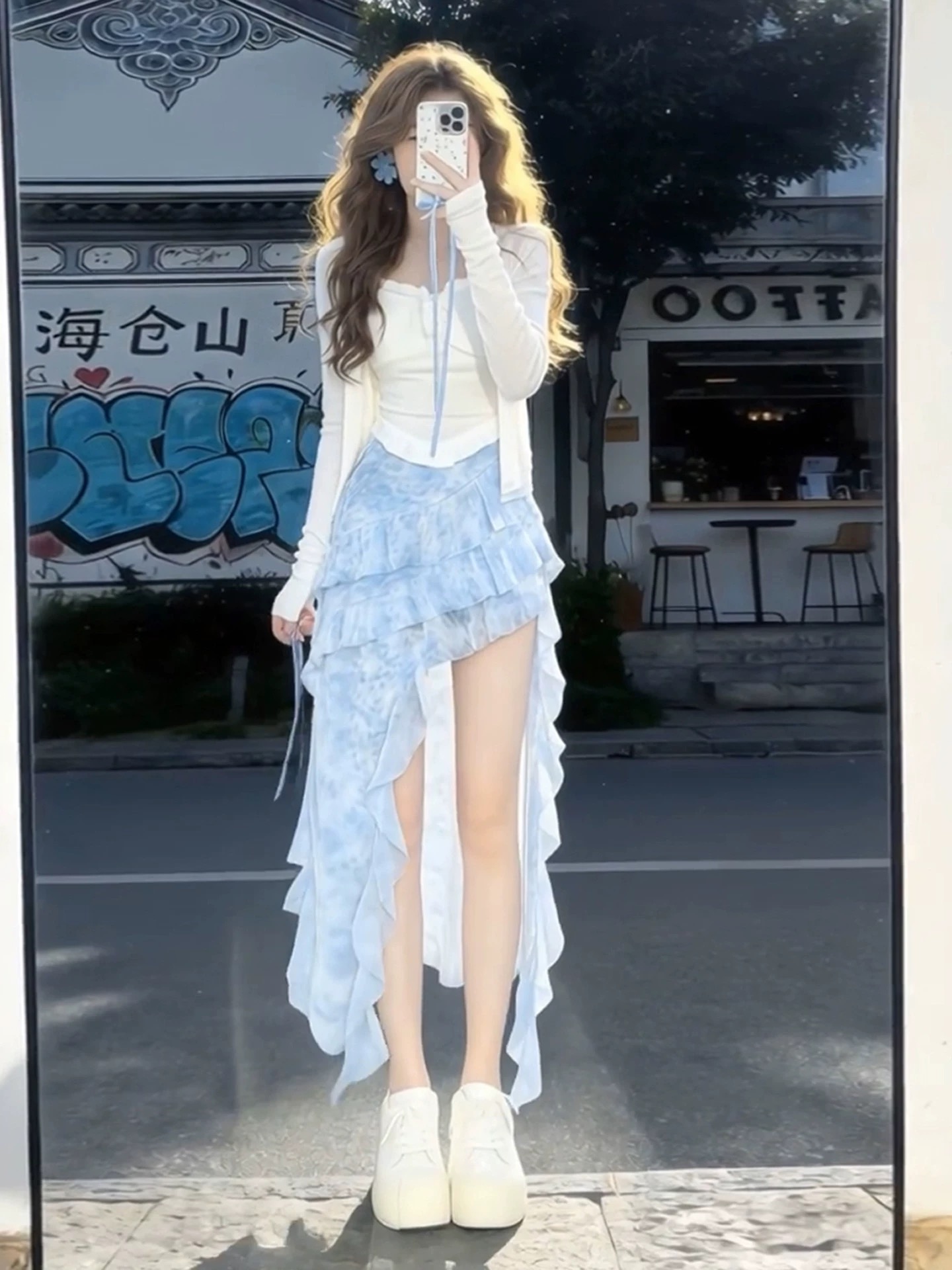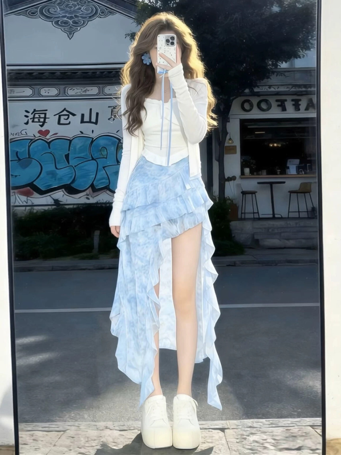 조기 봄 점프 슈트 치마 여성 의류 2026 새로운 부드러운 한 부서 달콤한 자매 착용 가져 가라. 파란색 불규칙 롱 스커트 세트