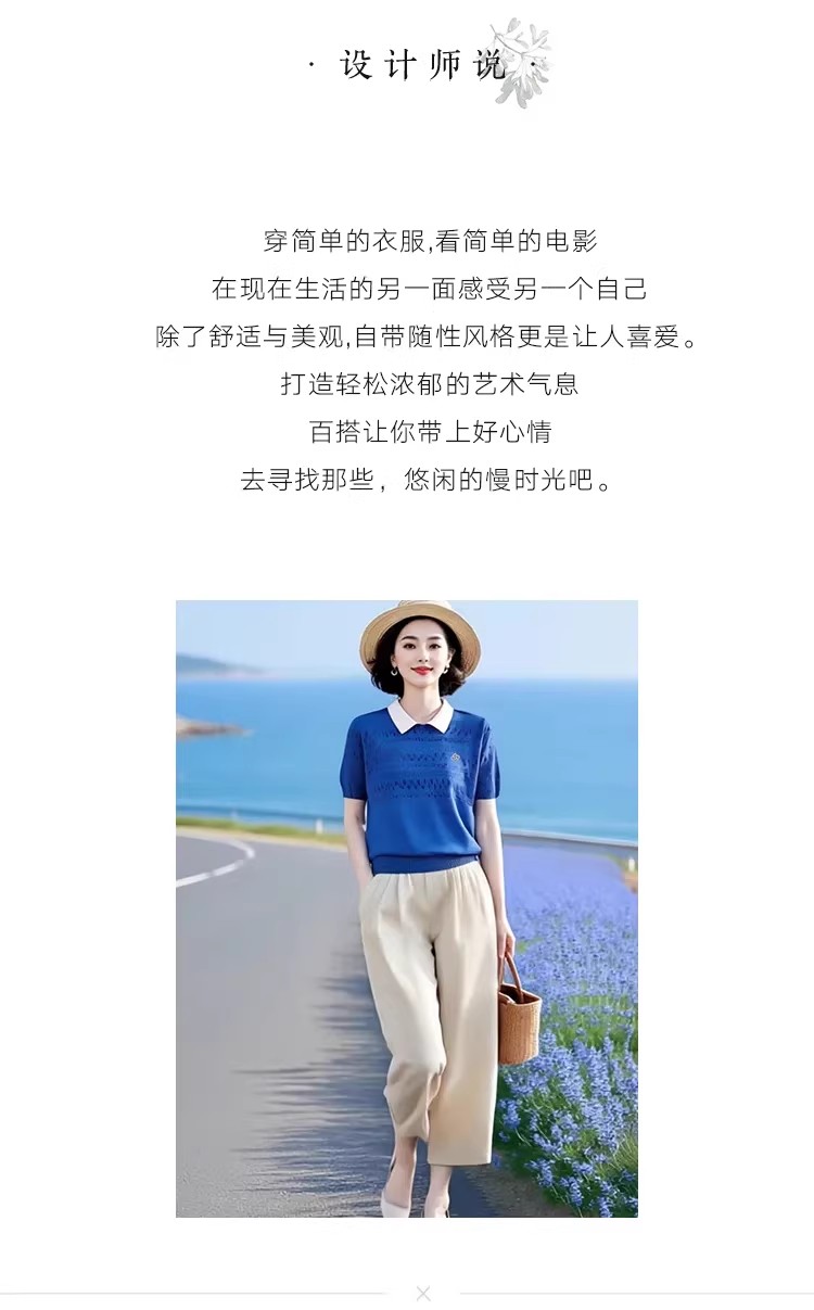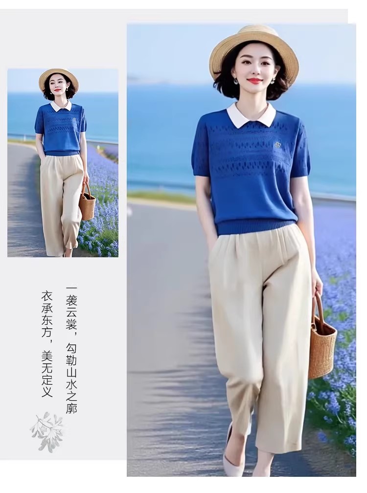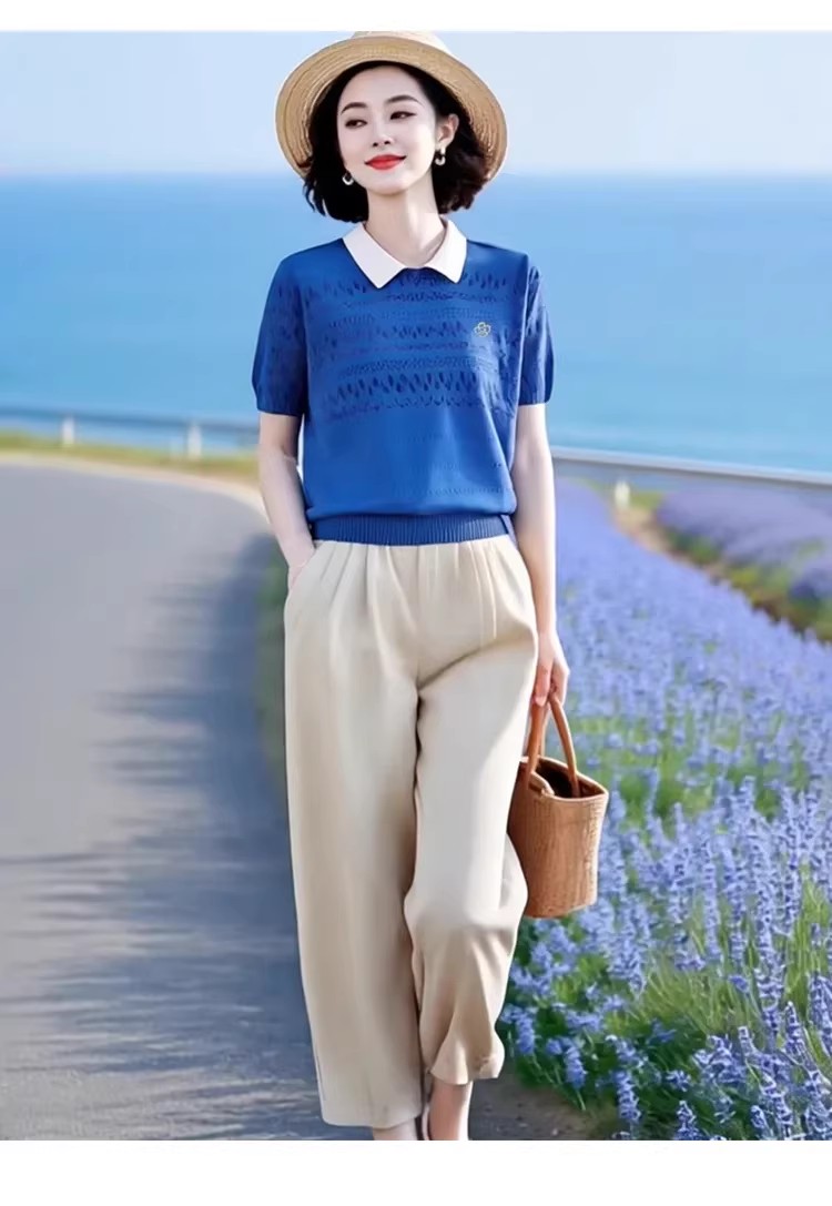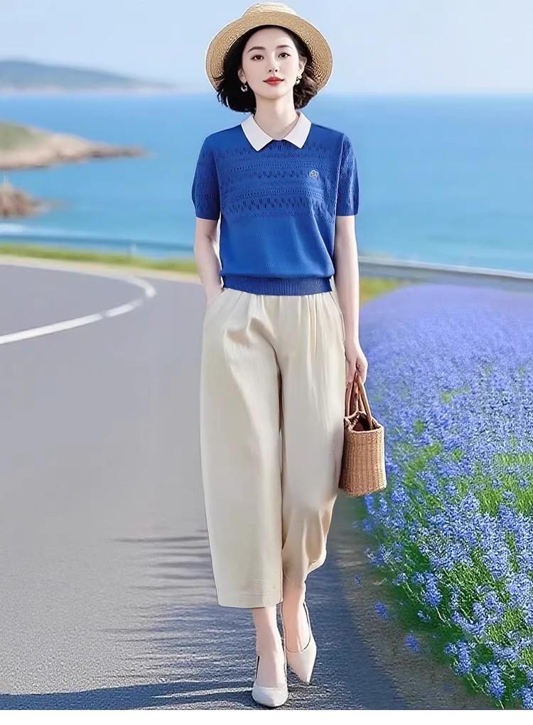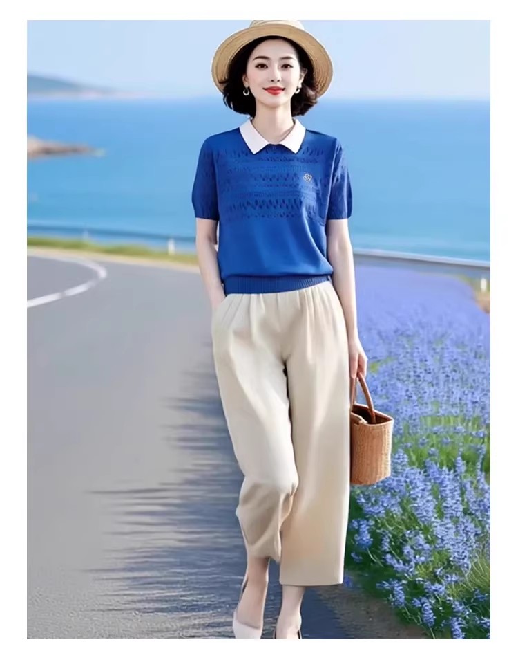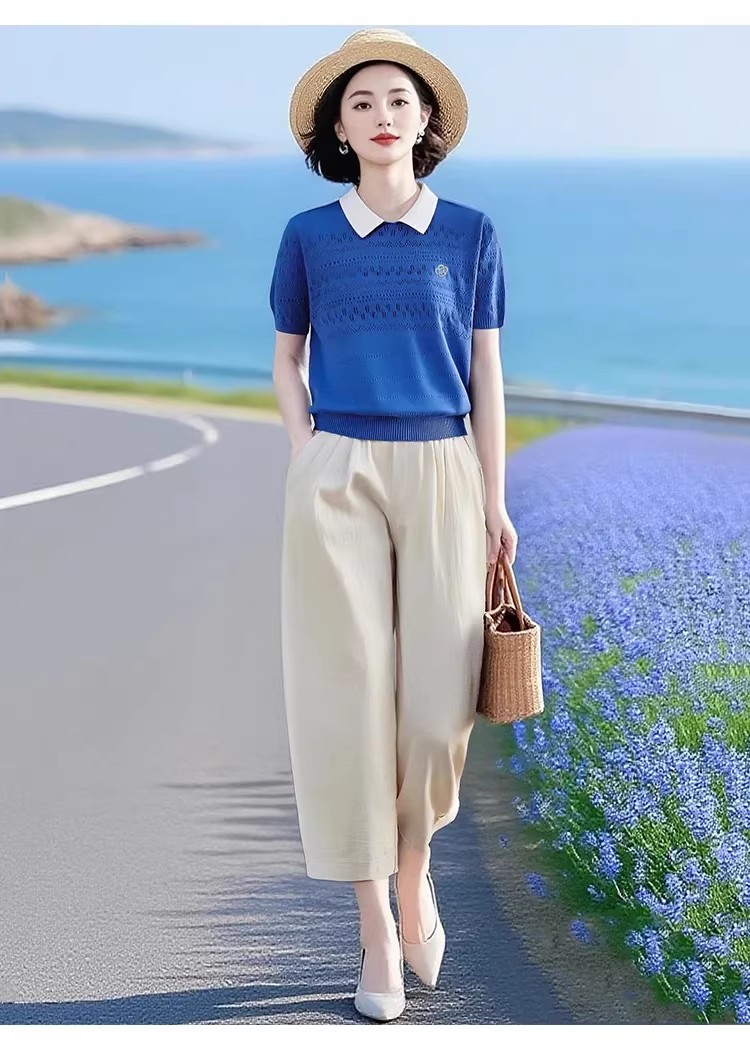 2026 봄 여름 새로운 폴로 칼라 반팔 니트 스웨터 허리밴드 9 포인트 하렘 바지 패션 세트