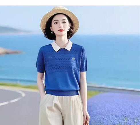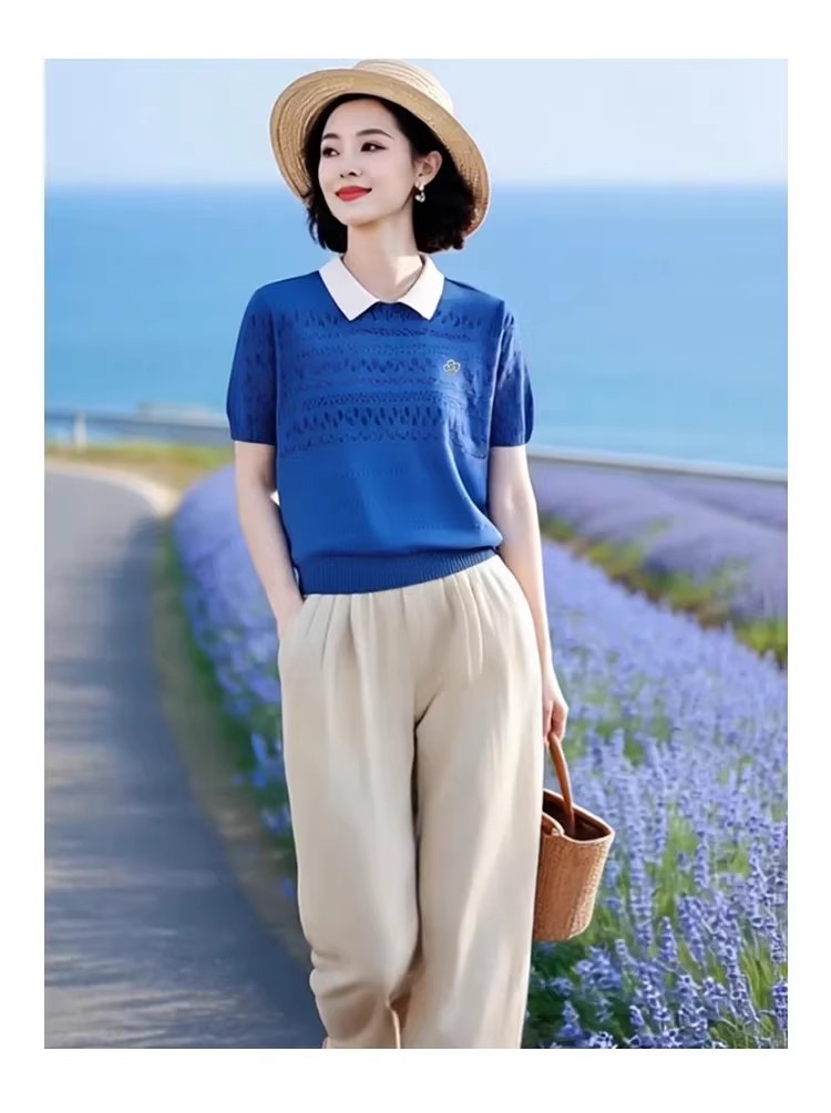 여름 새로운 POLO 칼라 품격 니트 반팔 티셔츠 미니멀리즘 miu 부서 니트 스웨터 여성
