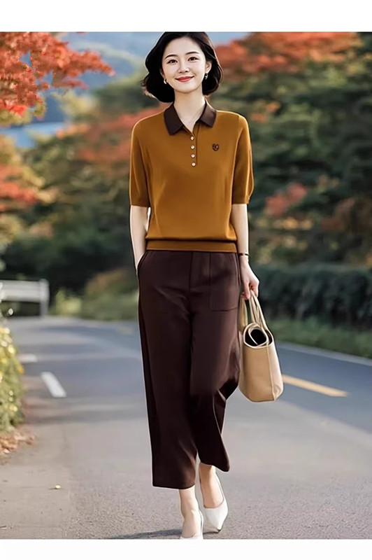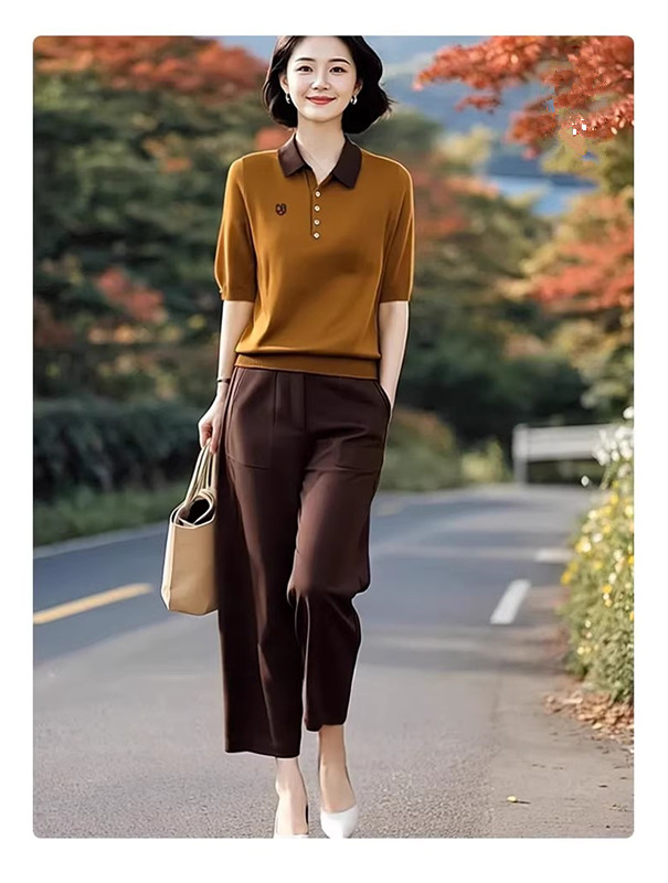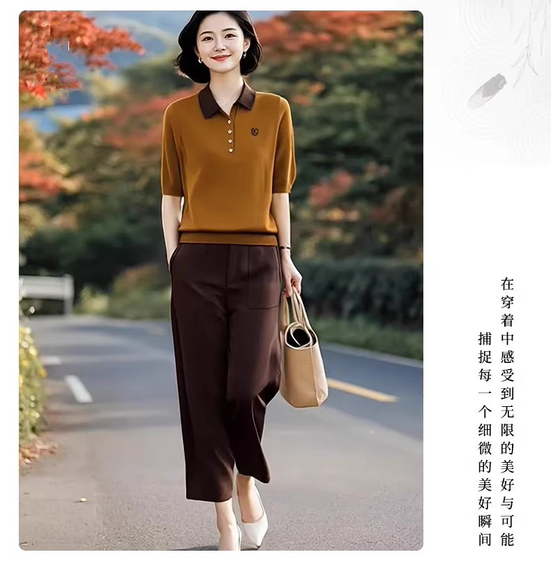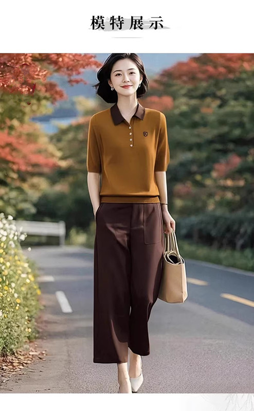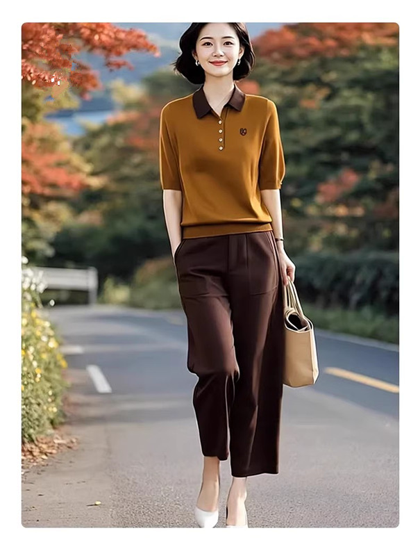 2026 봄 여름 새로운 폴로 칼라 반팔 니트 스웨터 허리밴드 9 포인트 하렘 바지 패션 세트