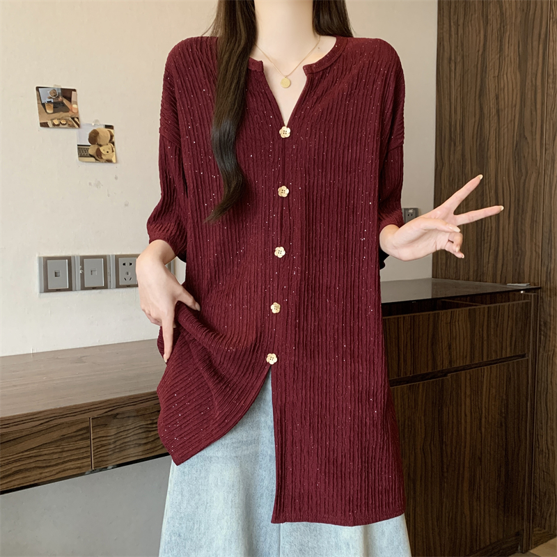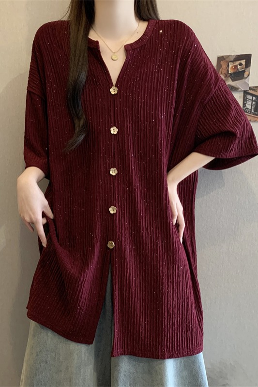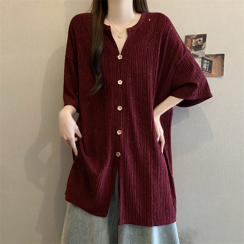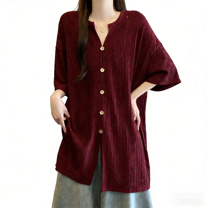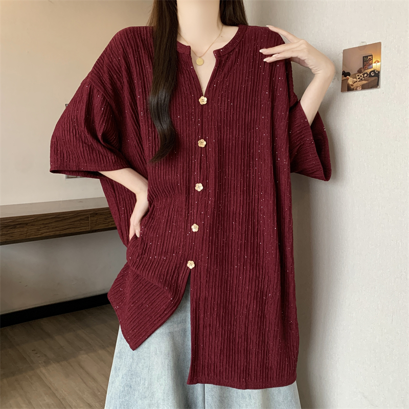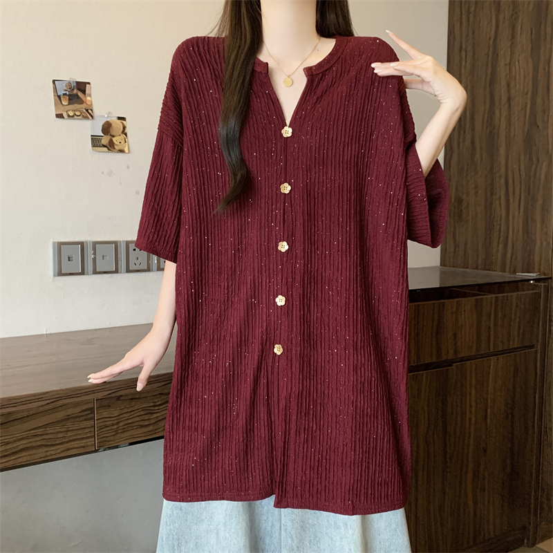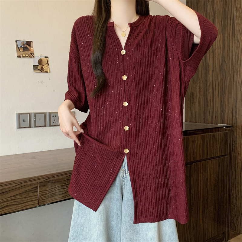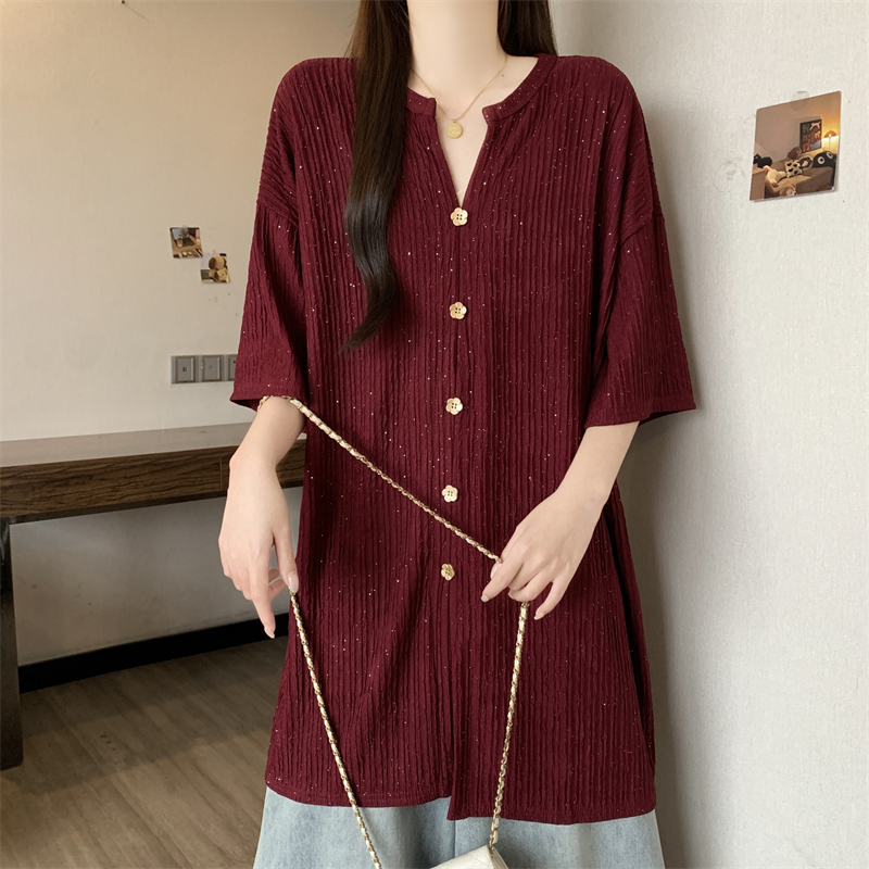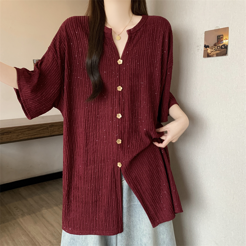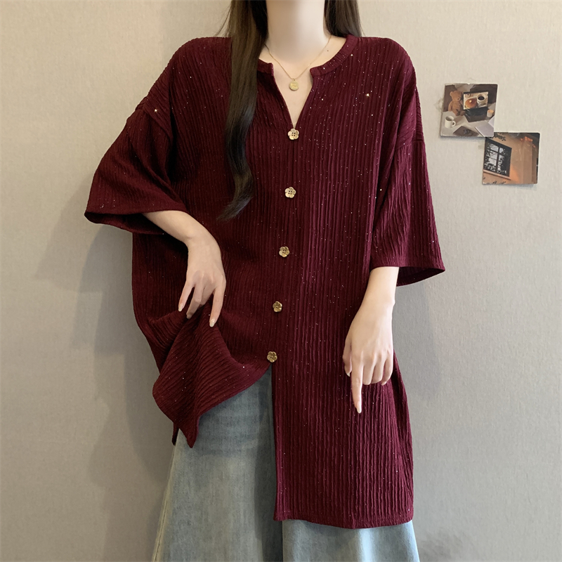 항구 바람 V넥 5 점 소매 여성 셔츠 2026 여름 빅 사이즈 마이크로 지방 mm 숨기기 고기 표지 배 루즈핏 다용도 맨위