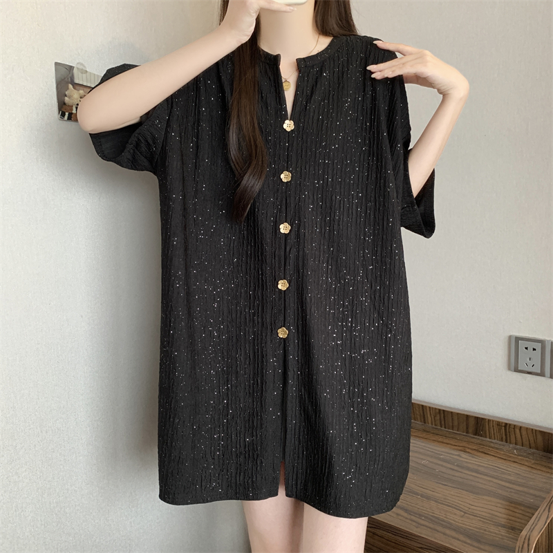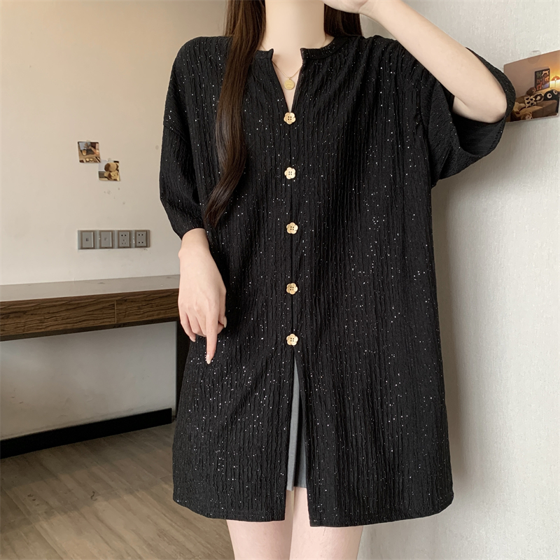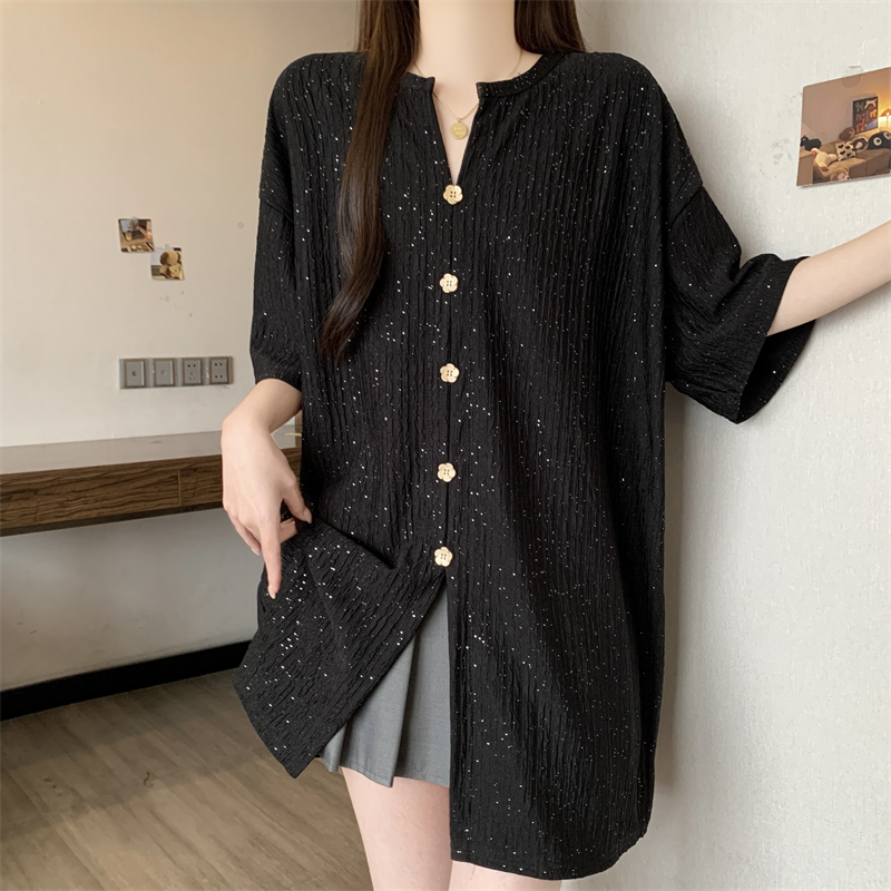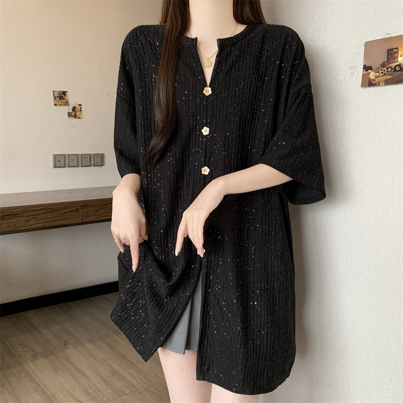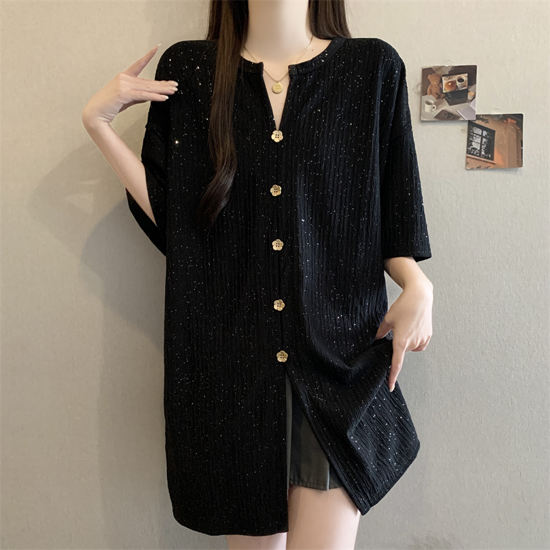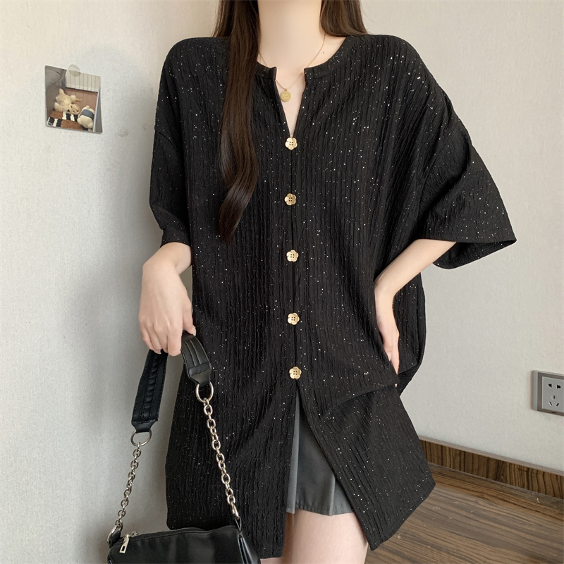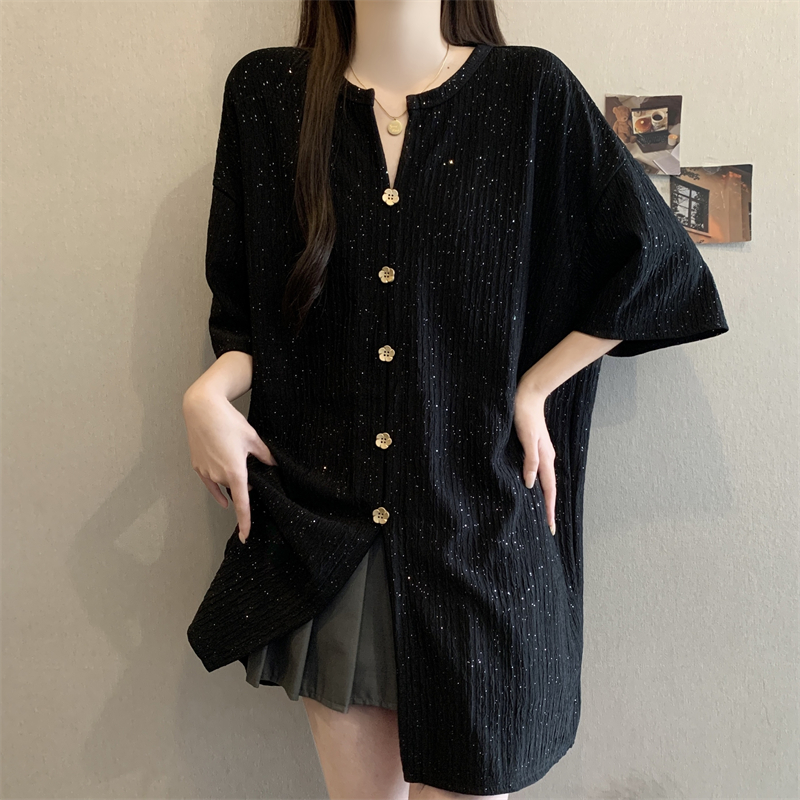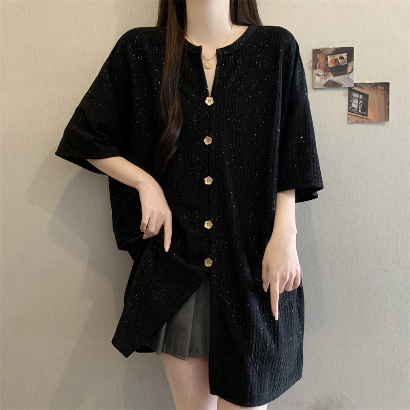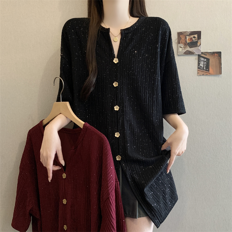 빅 사이즈 반팔 여성 셔츠 여름 새로운 지방 mm 아세트산 새틴 디자인 센스 작은 대중 불규칙 V넥 맨위