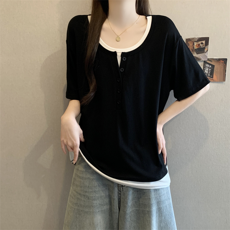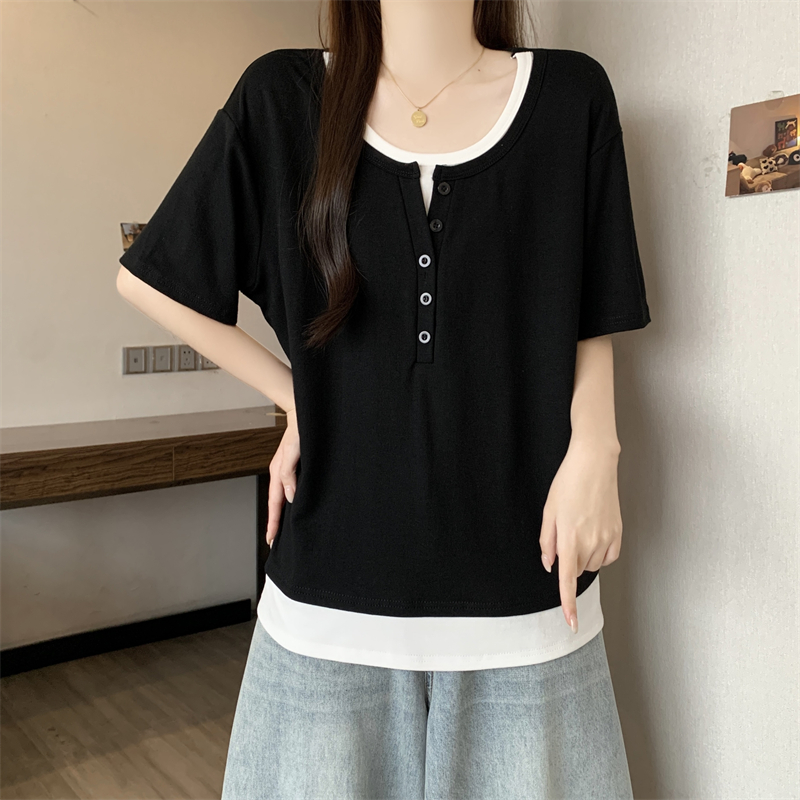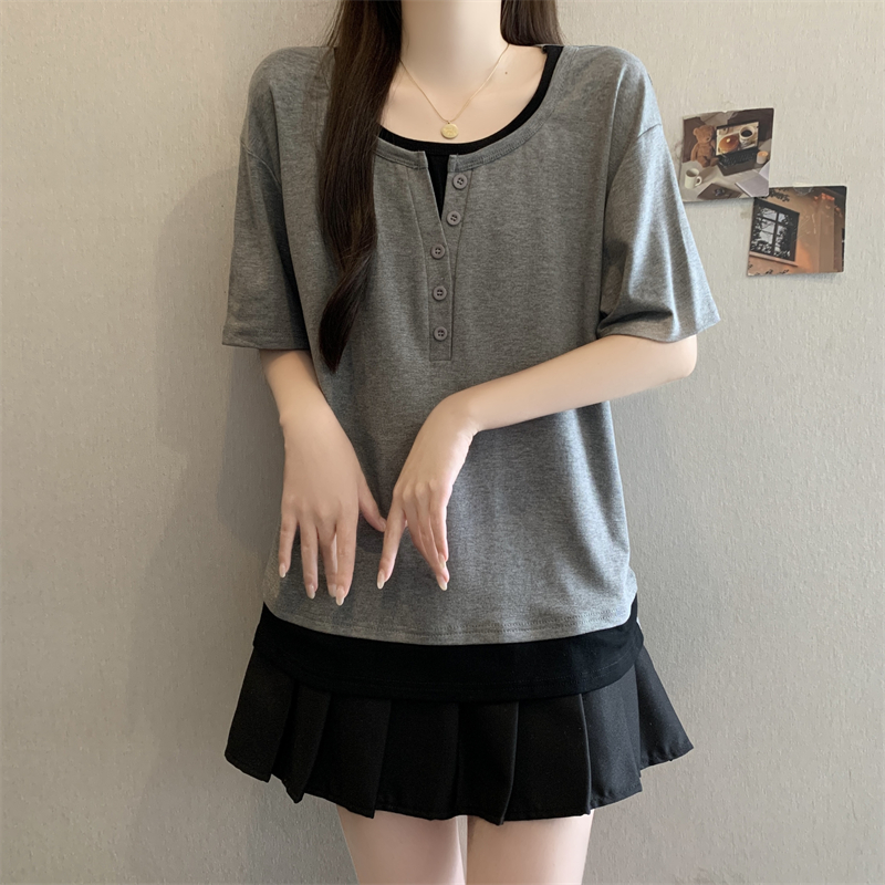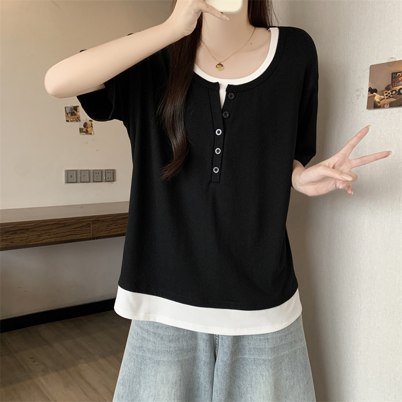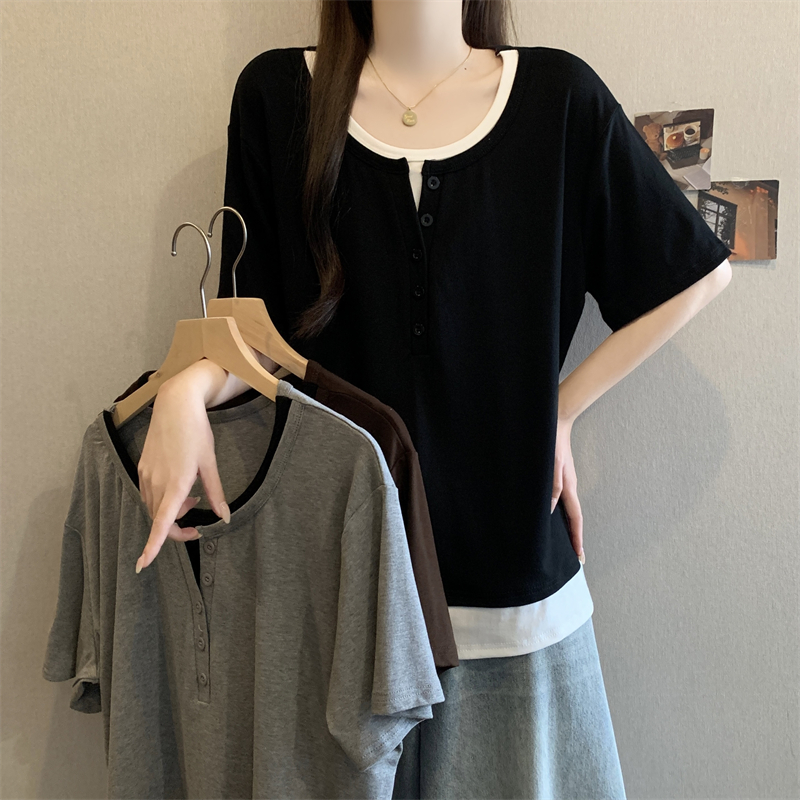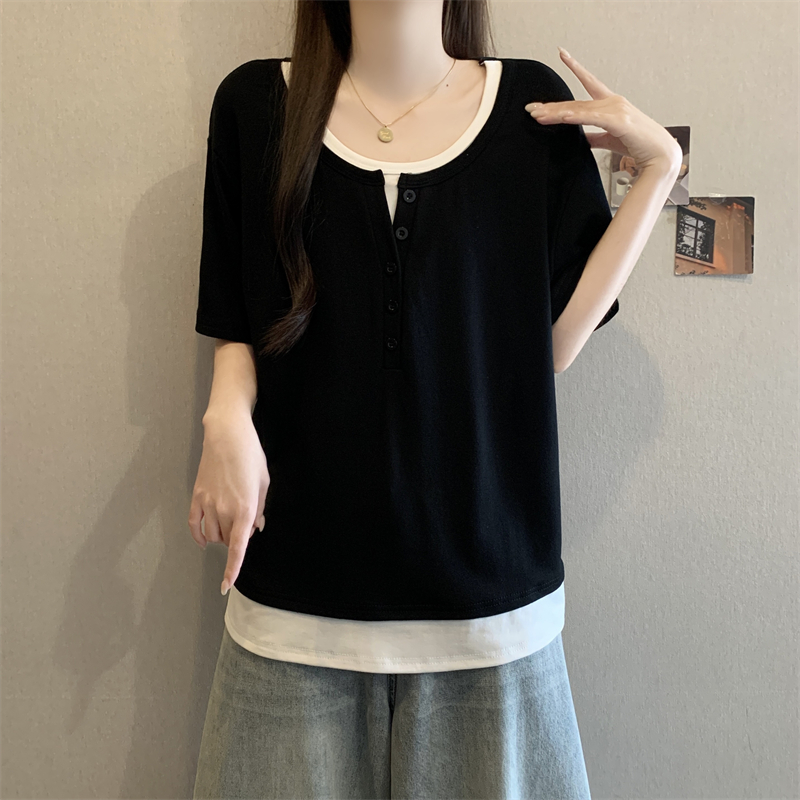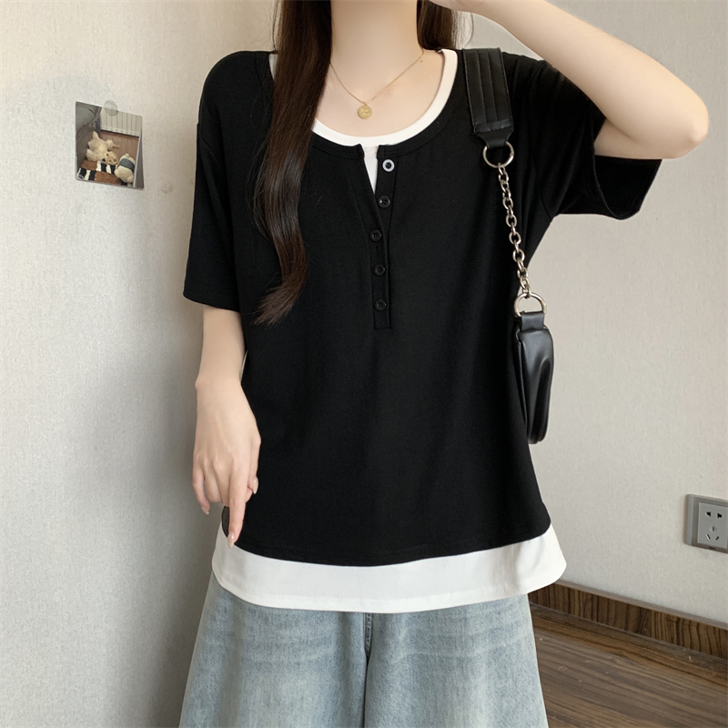 레트로 표지 배 느긋한 바람 페이크 레이어드 반팔 티셔츠 여성 여름 마이크로 지방 자매 빅 사이즈 루즈핏 다용도 맨위