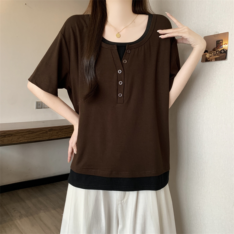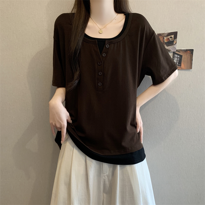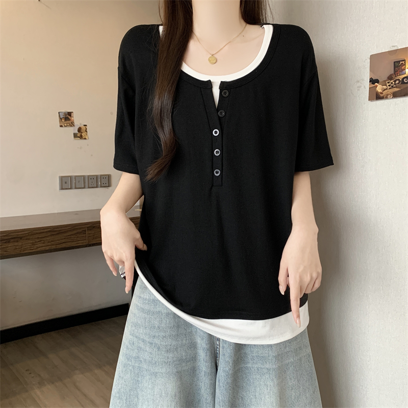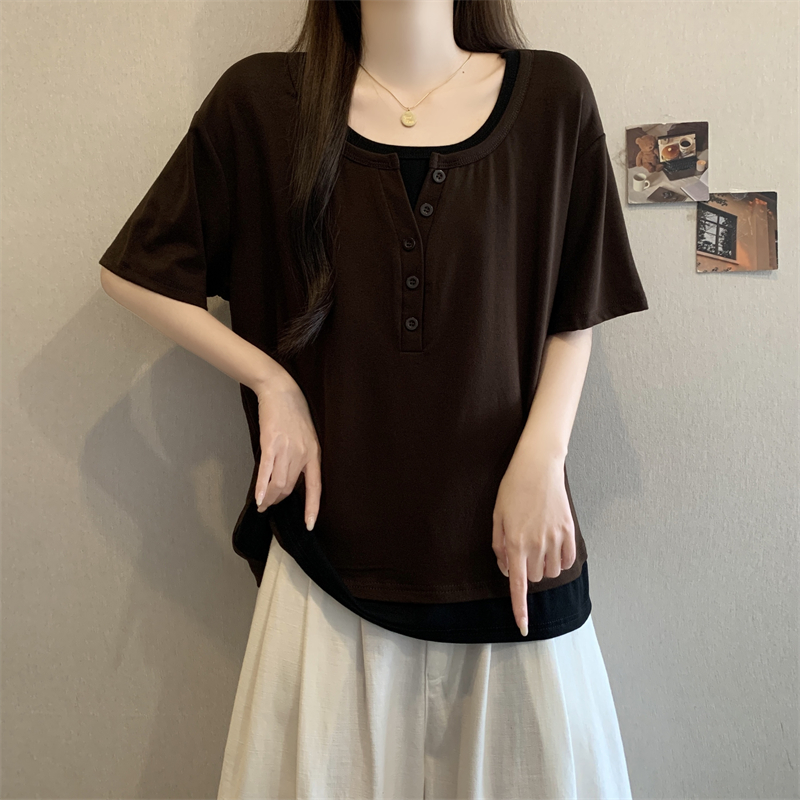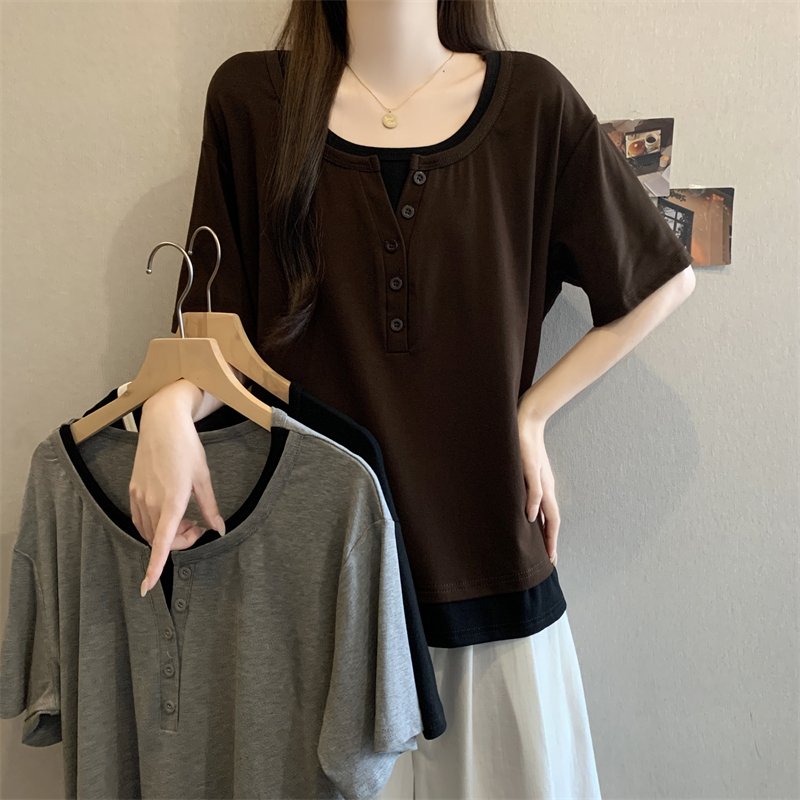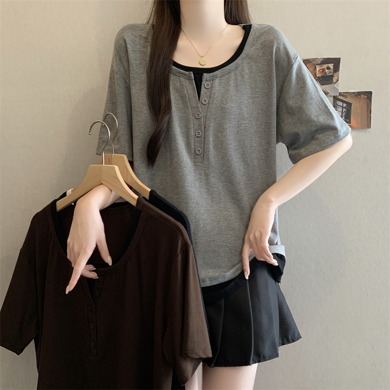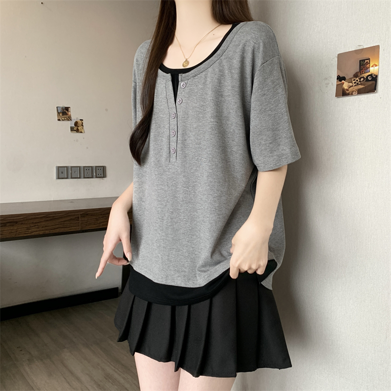 레트로 표지 배 느긋한 바람 페이크 레이어드 반팔 티셔츠 여성 여름 마이크로 지방 자매 빅 사이즈 루즈핏 다용도 맨위