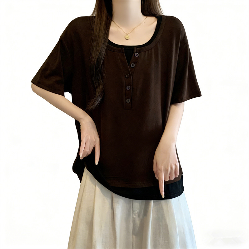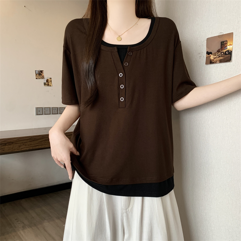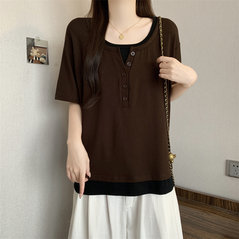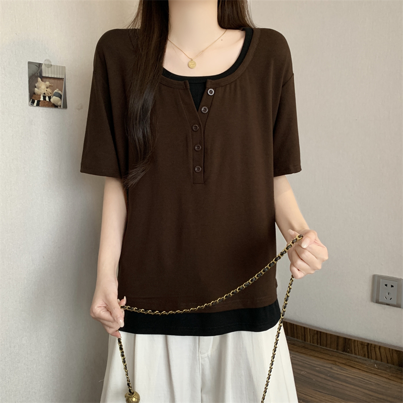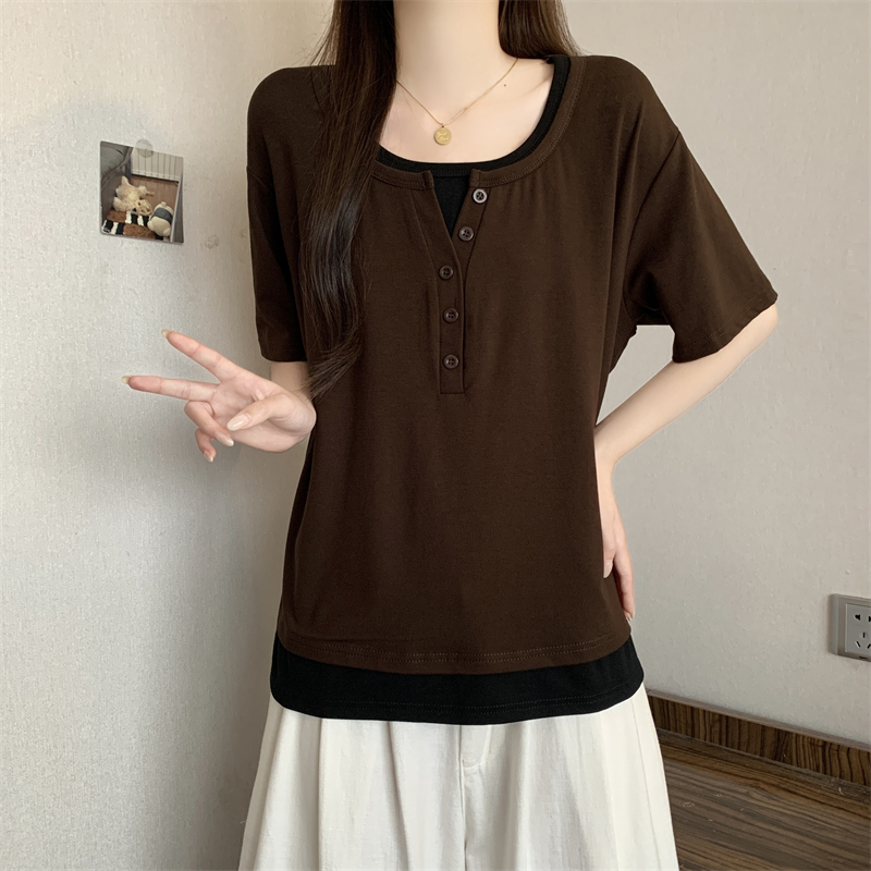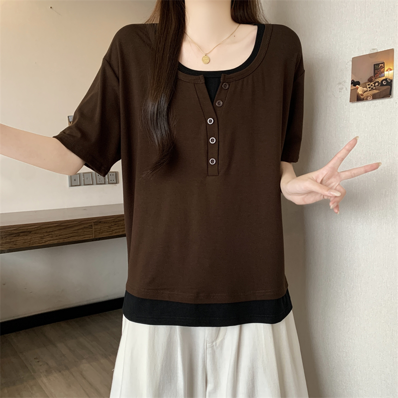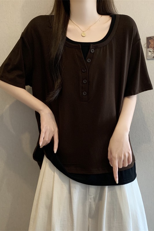 레트로 표지 배 느긋한 바람 페이크 레이어드 반팔 티셔츠 여성 여름 마이크로 지방 자매 빅 사이즈 루즈핏 다용도 맨위