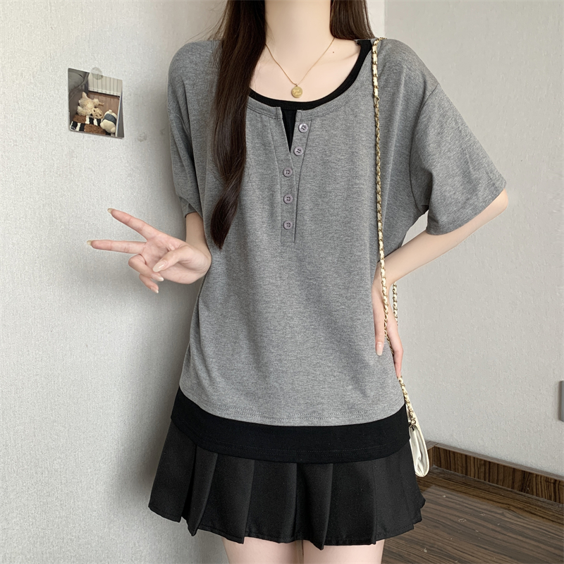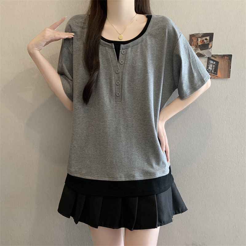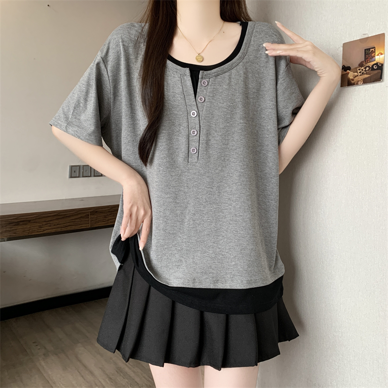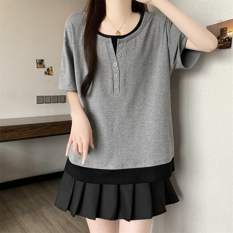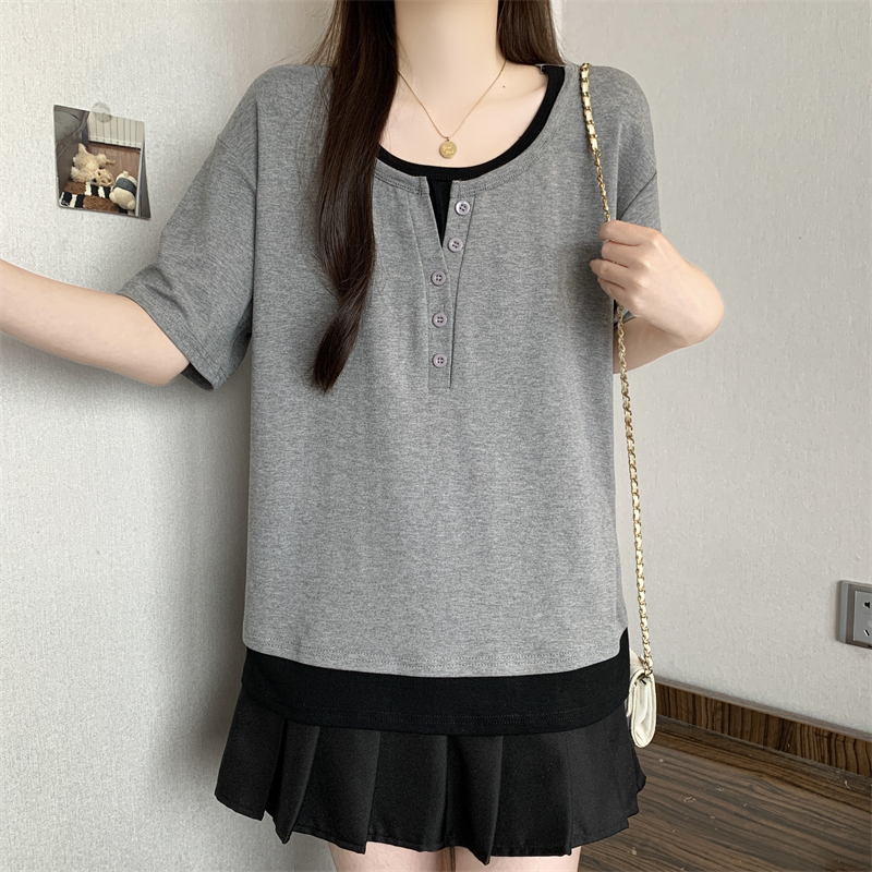 빅 사이즈 여성 의류 여름 디자인 센스 페이크 레이어드 회색 긍정적 인 어깨 반팔 티셔츠 마이크로 지방 mm 표지 배 슬림해 보이는 V넥 맨위