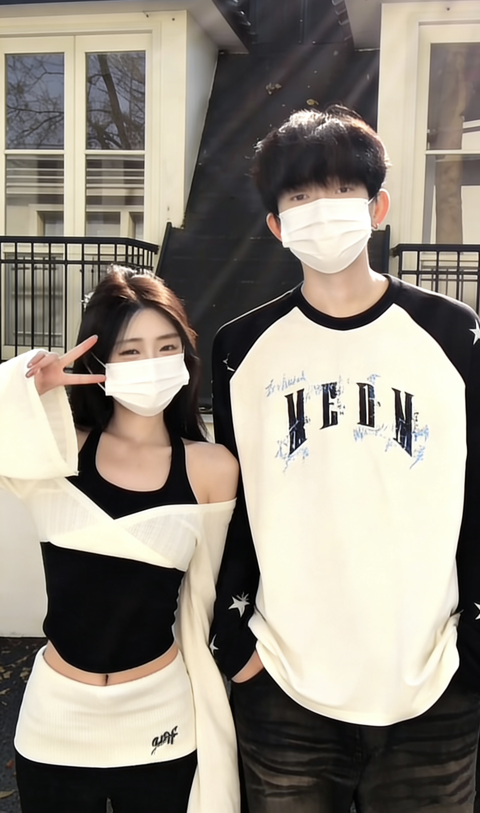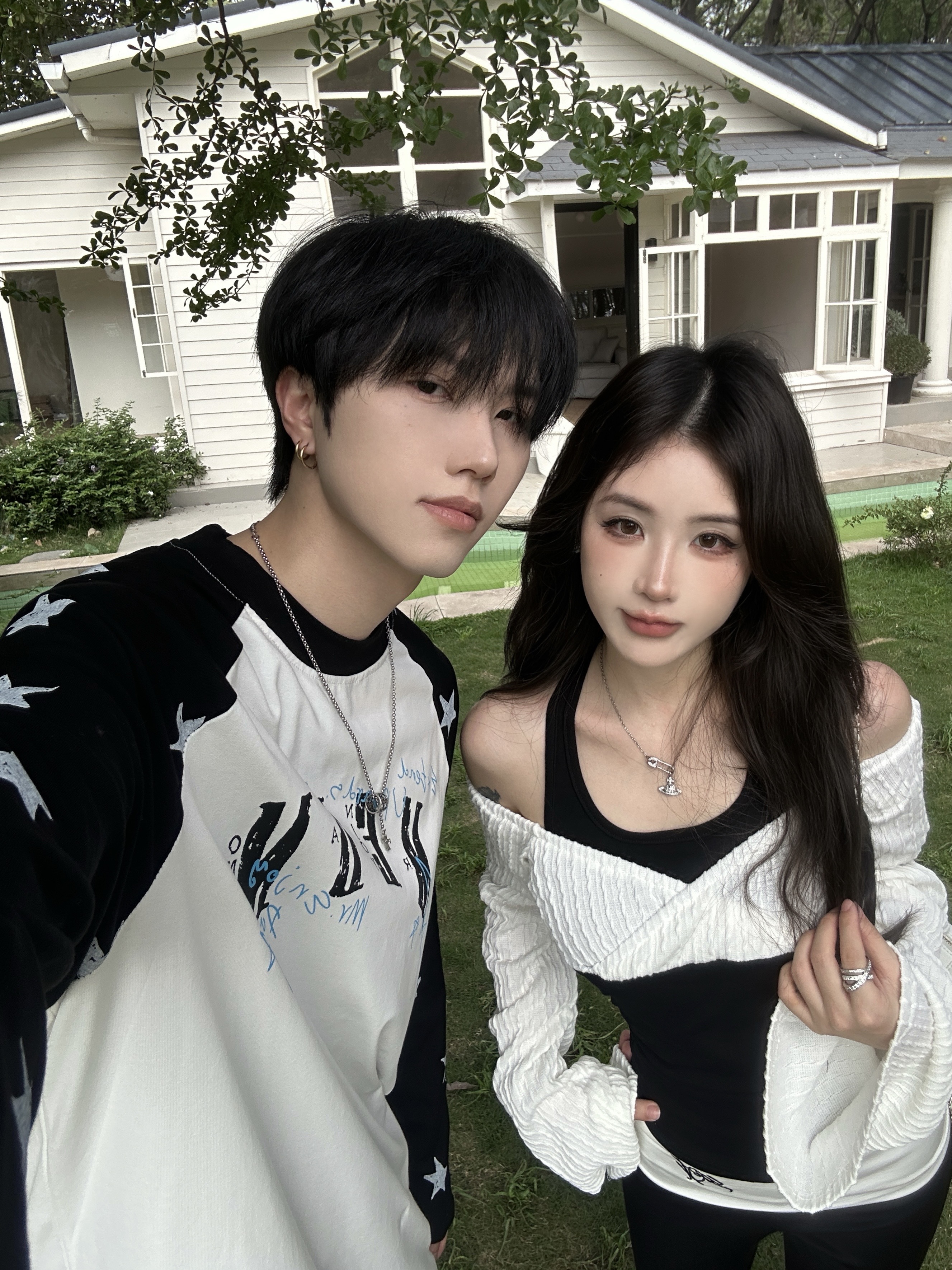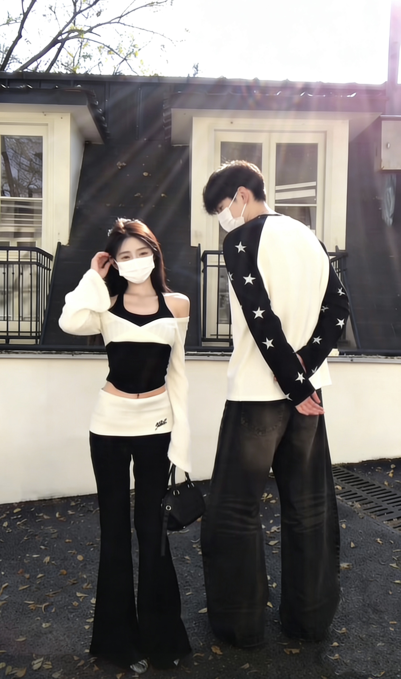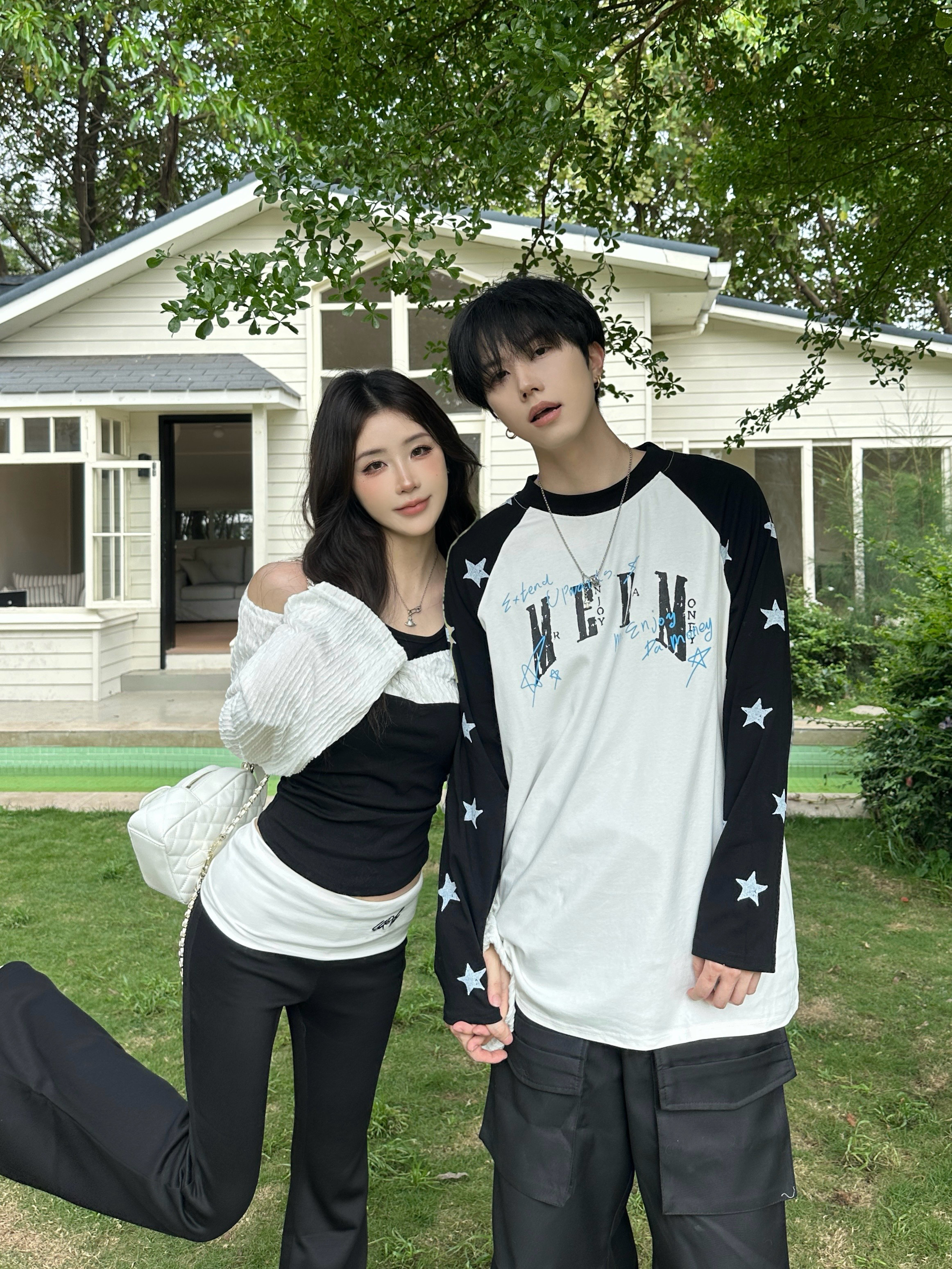실사 순수한 욕망 바람 페이크 레이어드 행침 목 오프숄더 긴팔 맨위 여성 봄 슬림해 보이는 캐주얼 바지 세트 커플룩