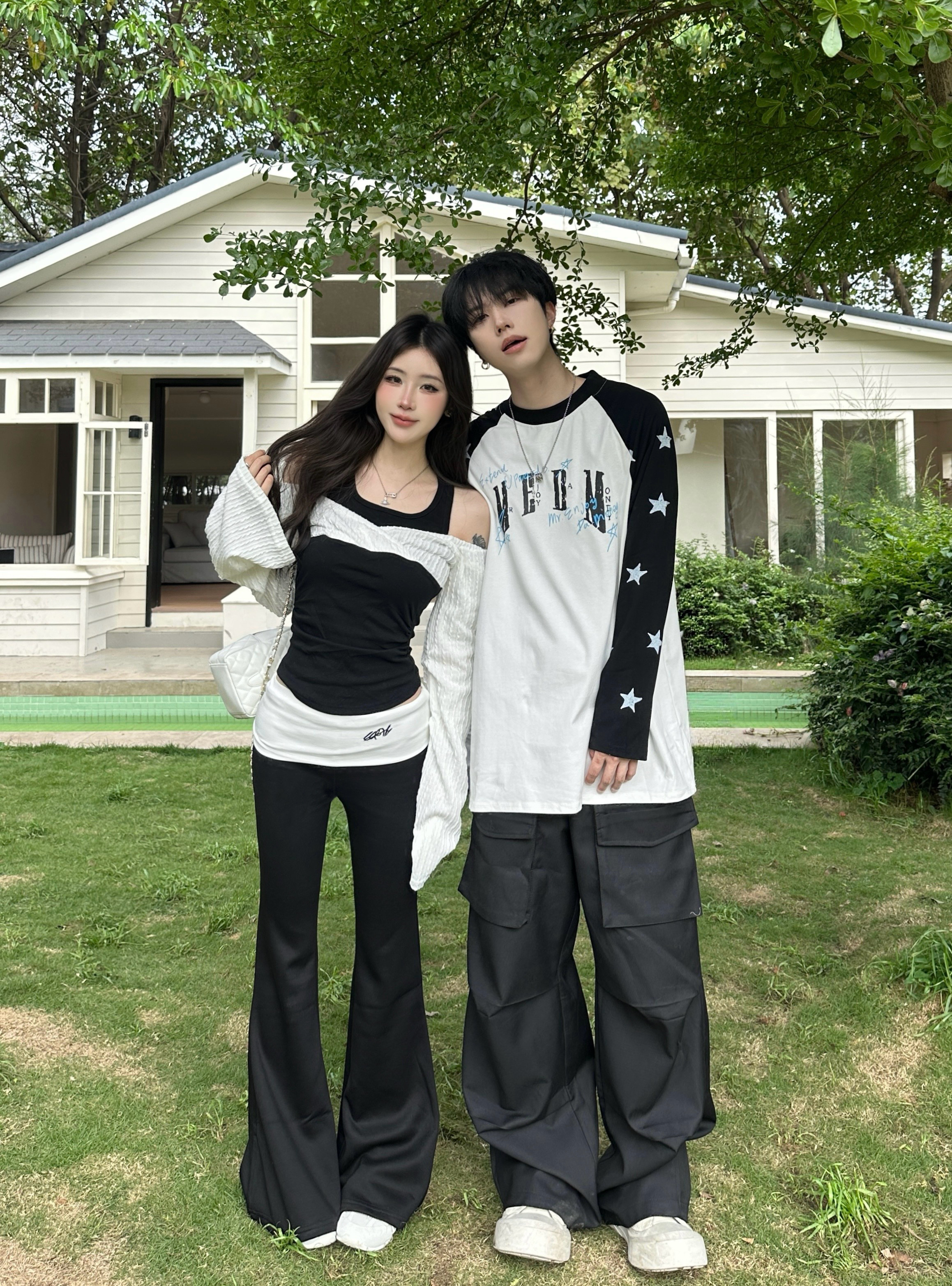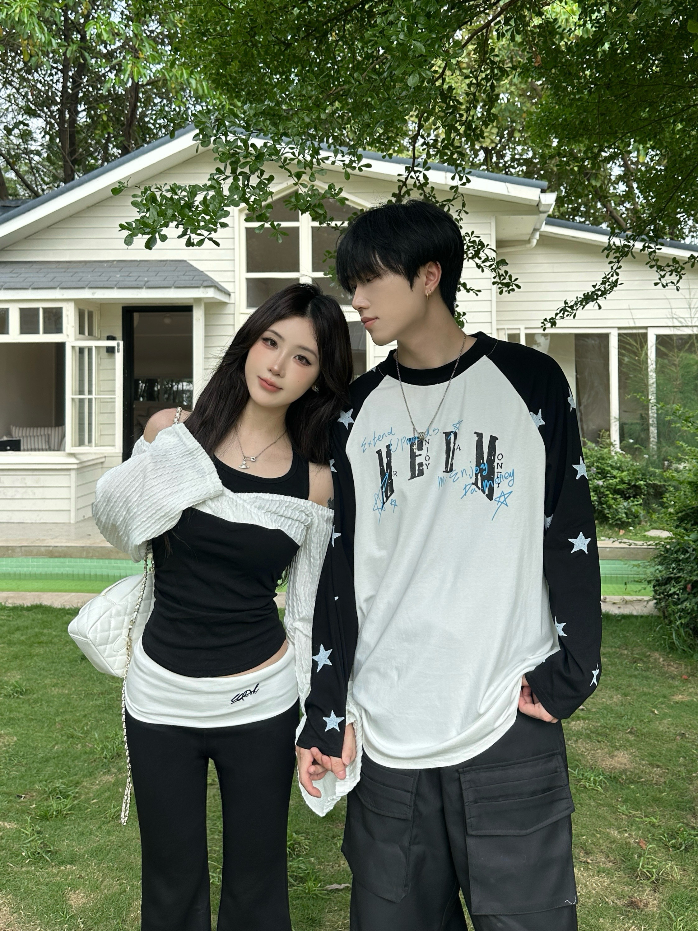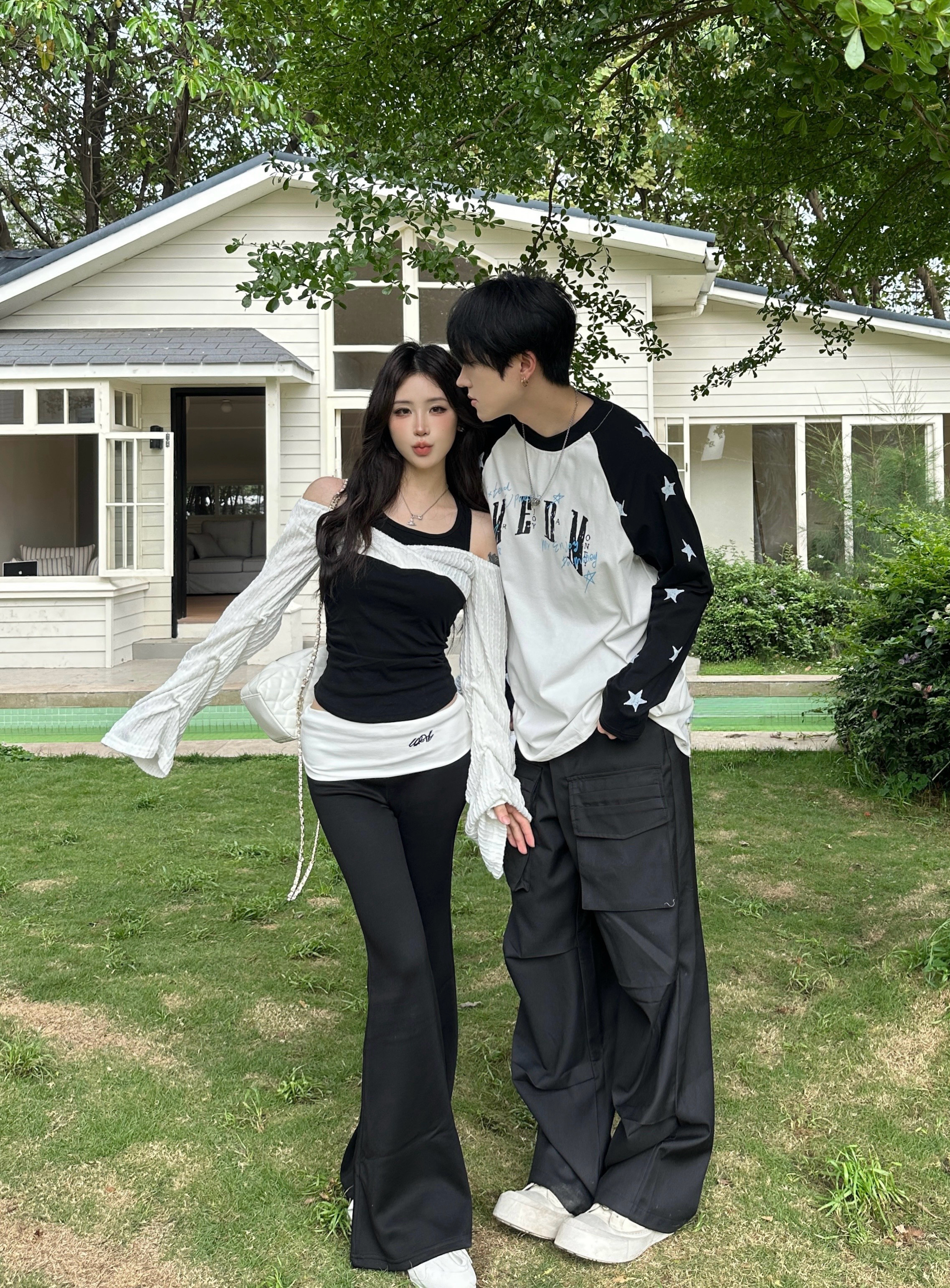 실사 달콤한 핫걸 알파벳 프린트 쇼트 스타일 조끼 여성 디자인 센스 밑단 펌프 로프 커플룩 세트
