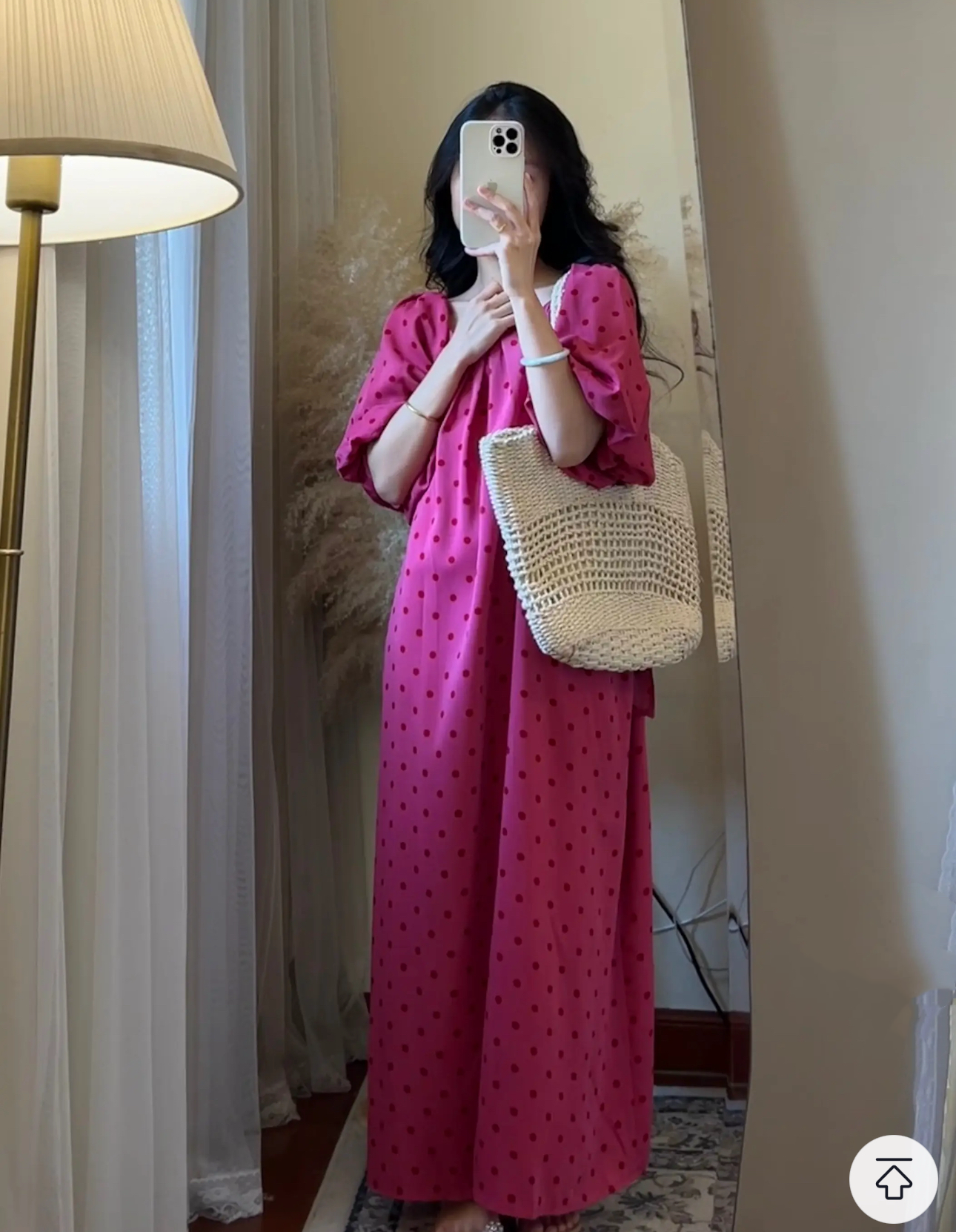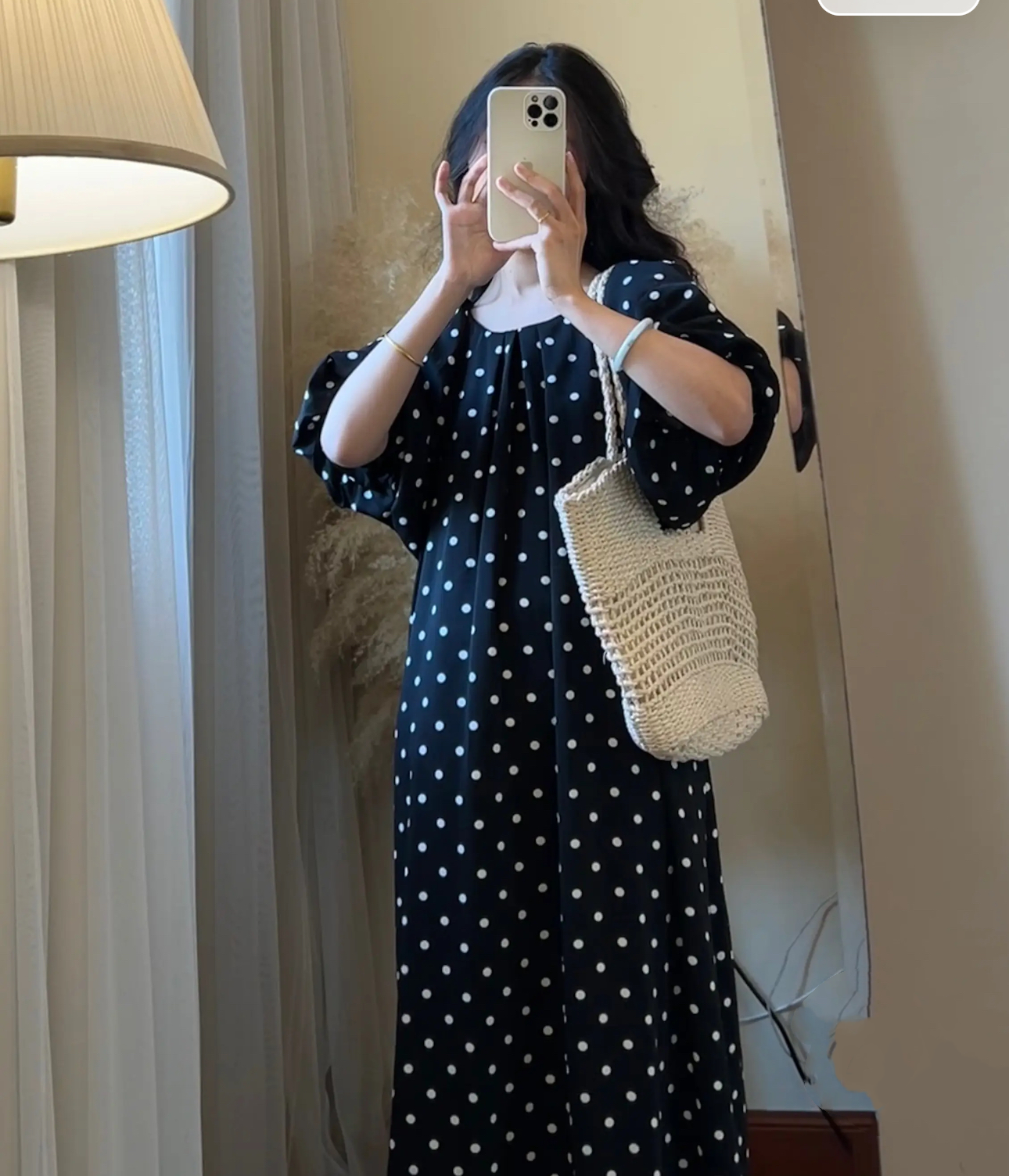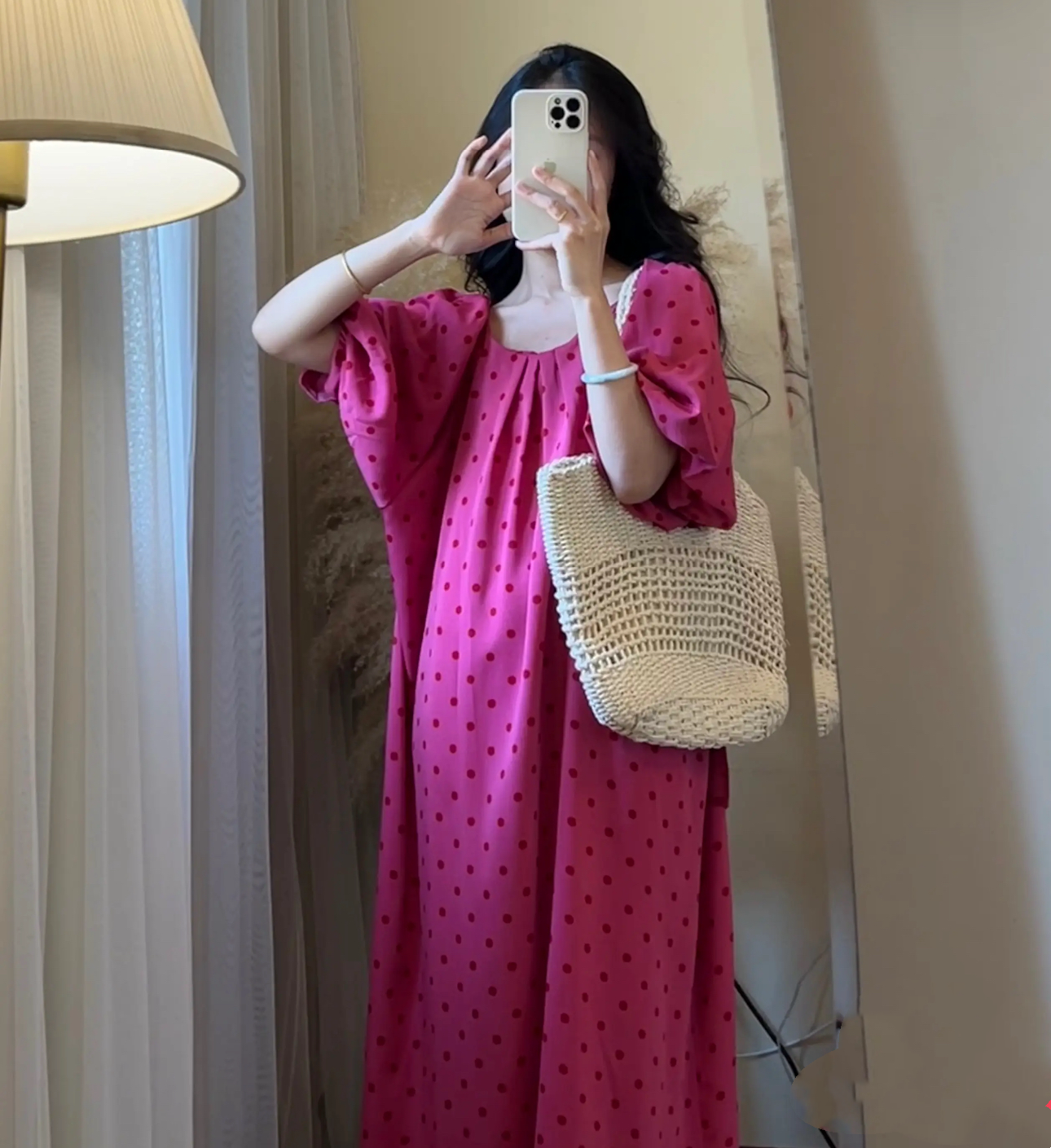 실사 2026 여름 미니멀리즘 도트 무늬 끈 클래식 라운드 넥 몸매 가꾸기 임산부 반팔 게으른 드레스