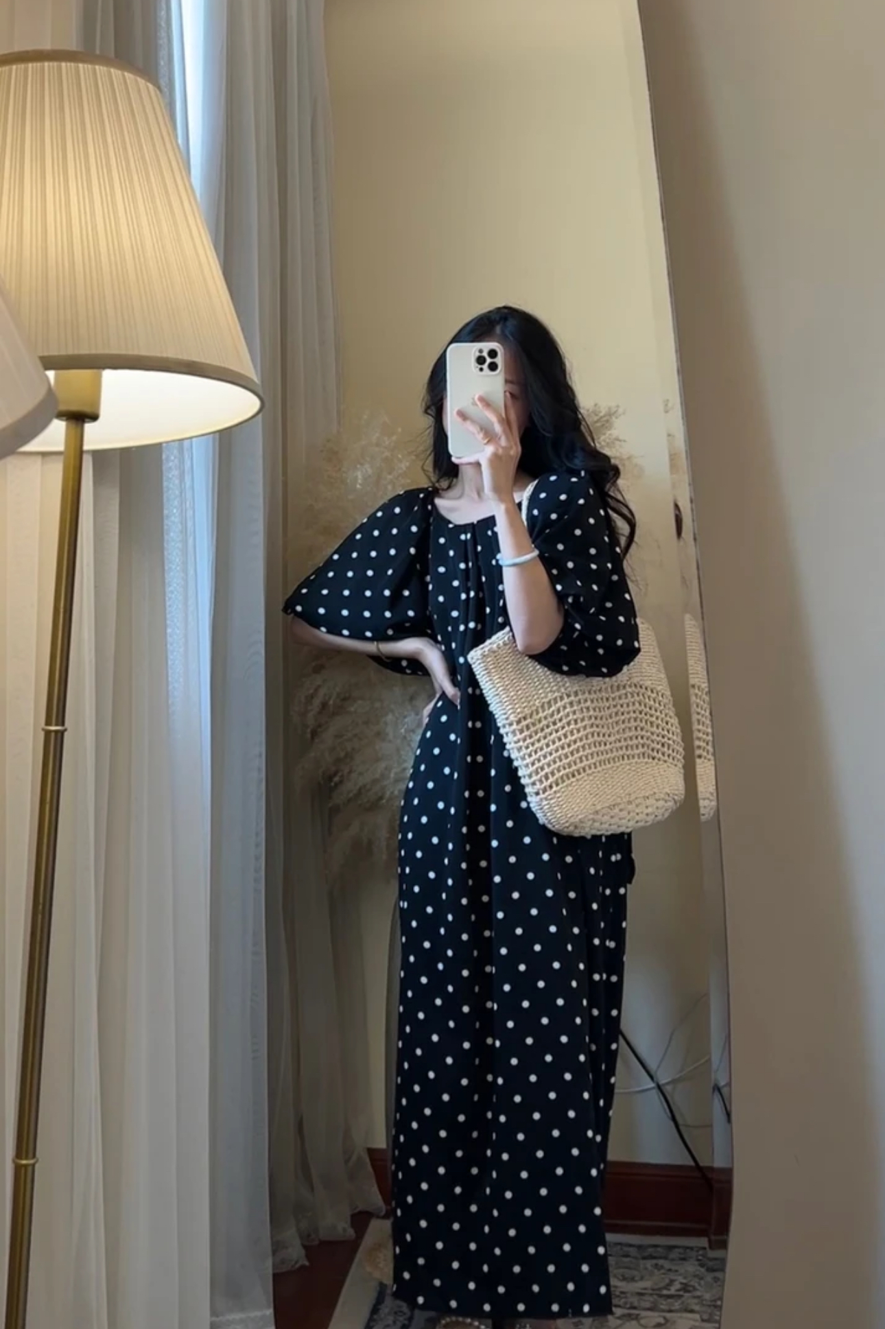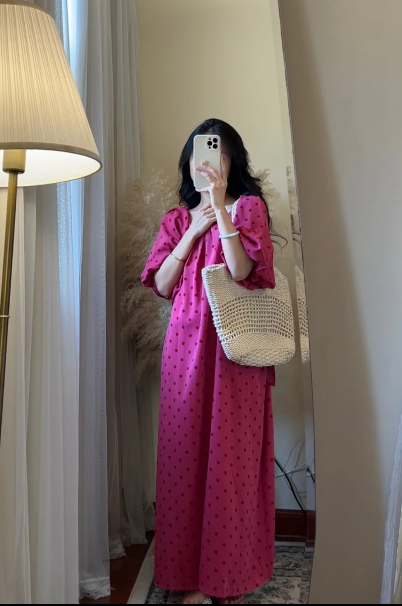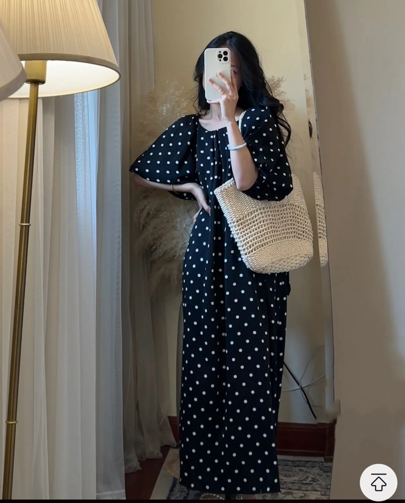 실사 2026 여름 미니멀리즘 도트 무늬 끈 클래식 라운드 넥 몸매 가꾸기 임산부 반팔 게으른 드레스