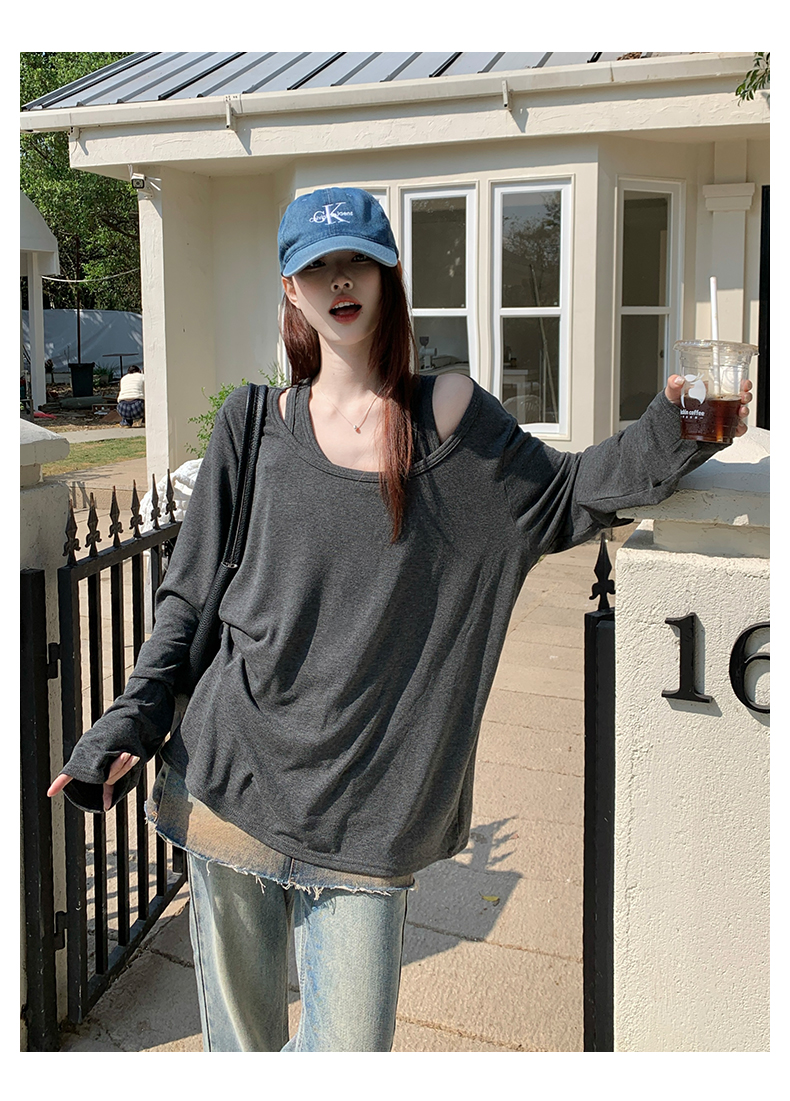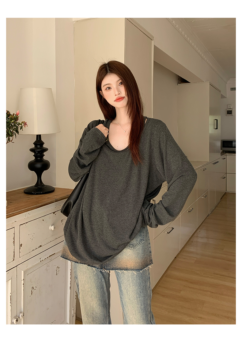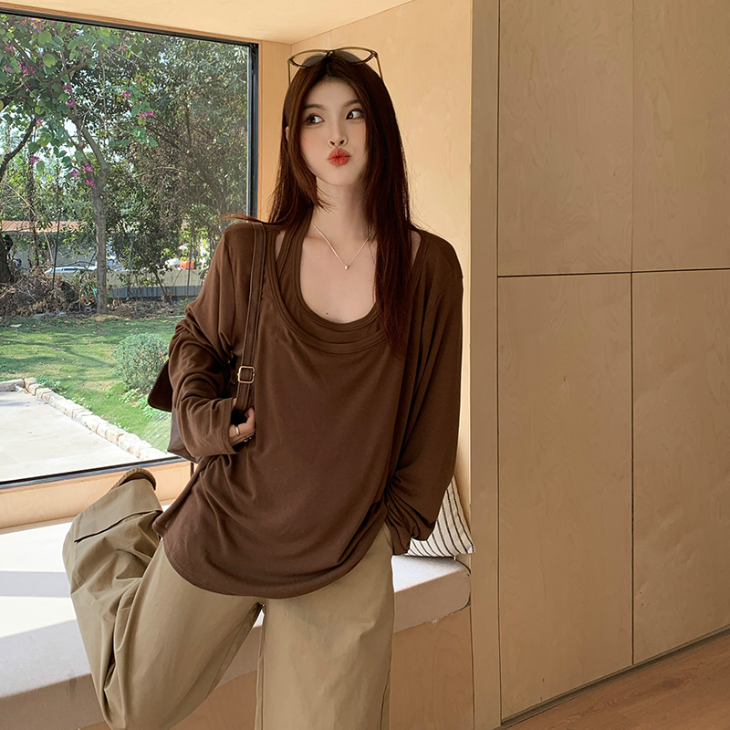 빅 사이즈 여성 의류 페이크 레이어드 긴팔 티셔츠 빅 사이즈 루즈핏 미니멀리즘 맨위
