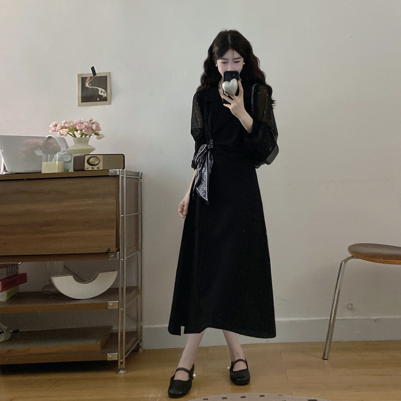 실사 여름 ootd 빅 사이즈 여성 의류 마이크로 지방 mm 슬림해 보이는 작은 검은 드레스 한 부서 패션 꼬집기 허리 드레스
