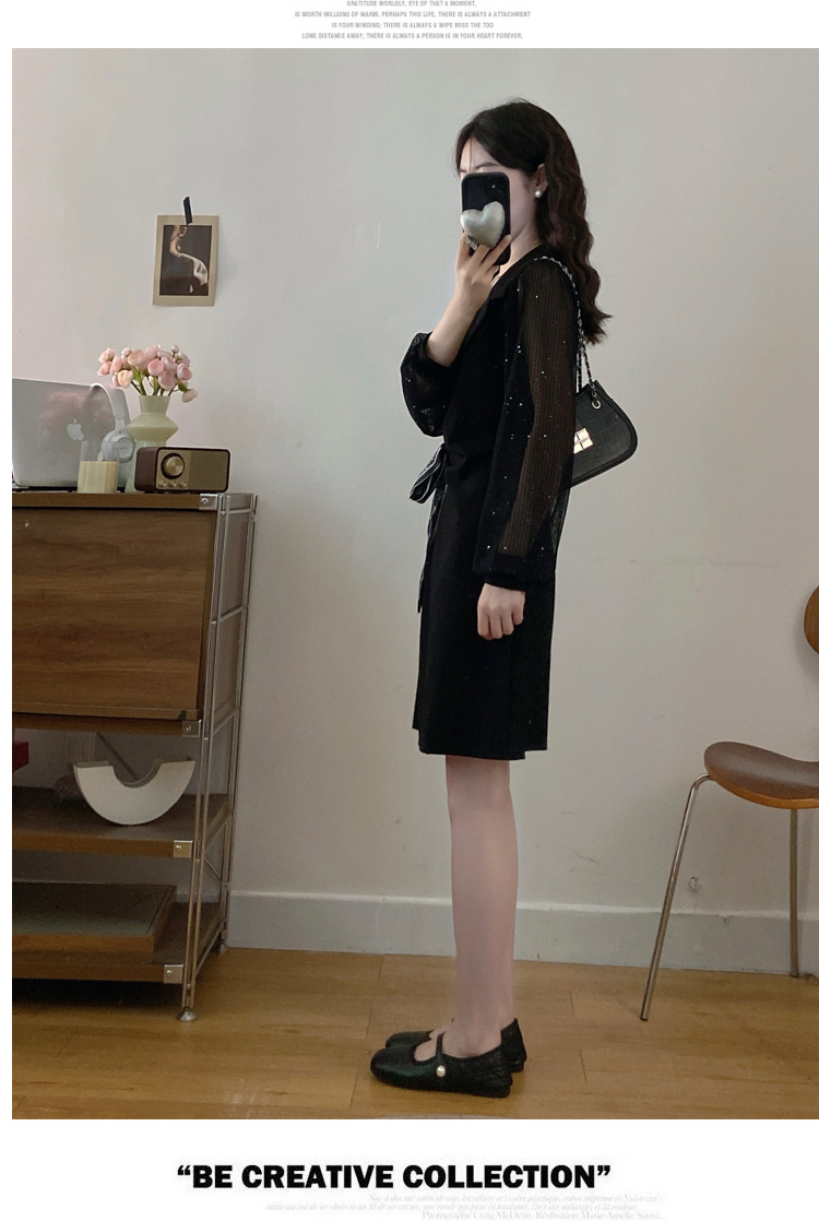 실사 빅 사이즈 봄 드레스 섹션 그는 벤 바람 검정색 V넥 드레스 고급 센스 순수한 욕망 바람 허리 수축 슬림해 보이는 인어 꼬리 스커트