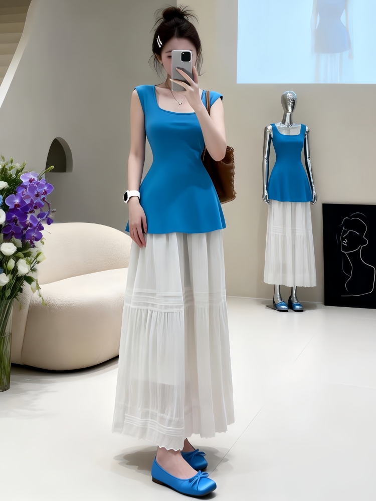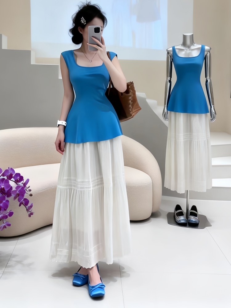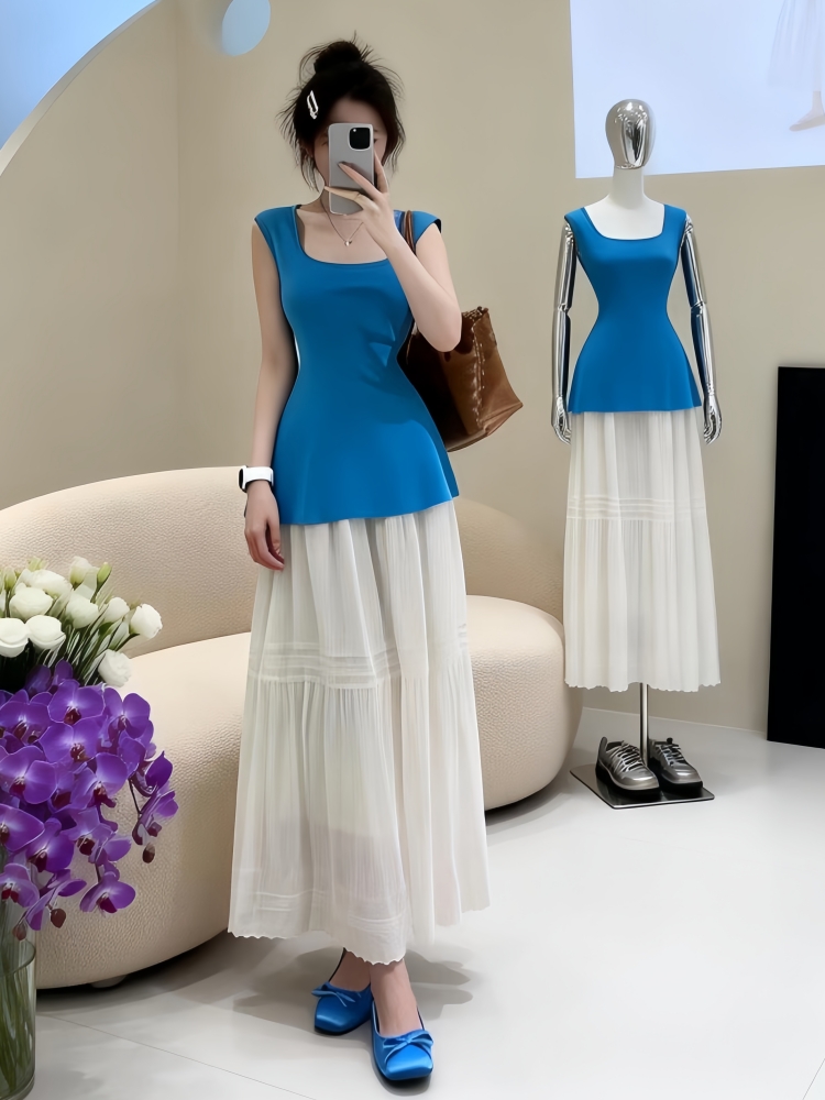 분위기 센스 캐주얼 세트 여성 2026 여름 순수한 욕망 바람 민소매 니트 맨위 하이웨이스트 케이크 드레스 두 조각 트렌디