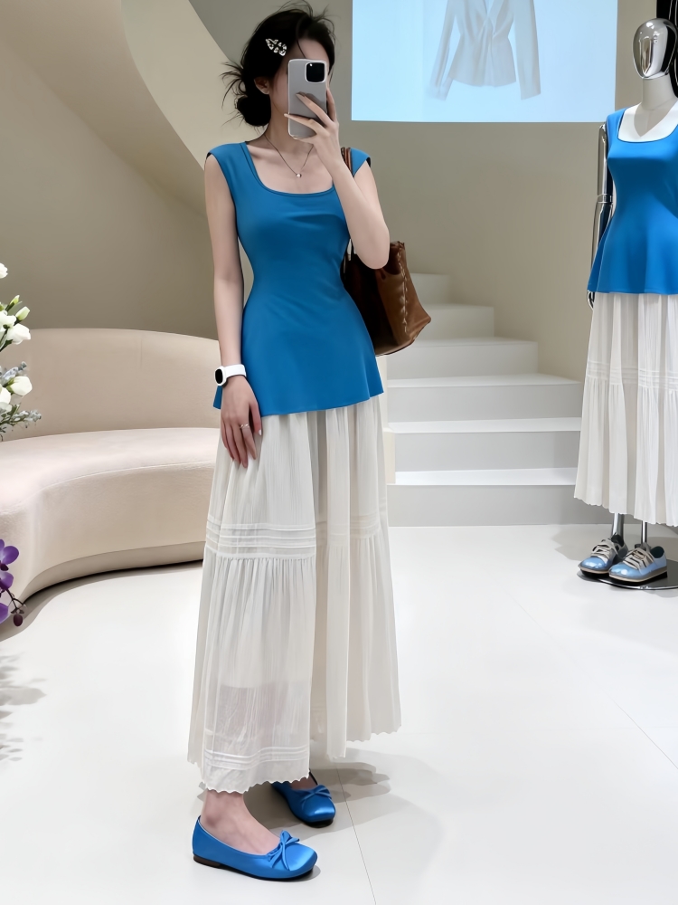 휴가 바람 파란색 행침 목 쉬폰 여성 드레스 2026 여름 새로운 Chic 민소매 A라인 스커트 품격 치마