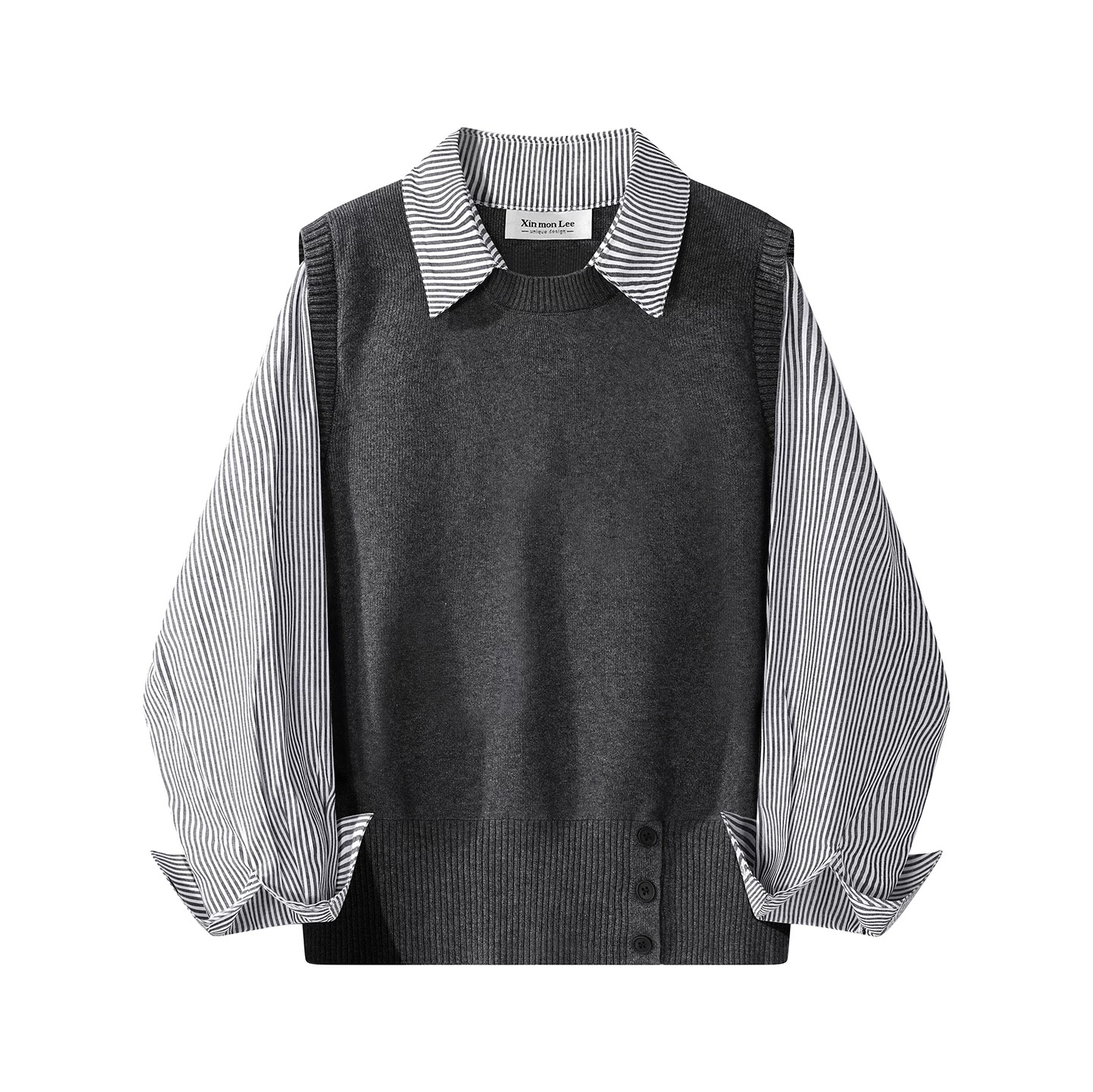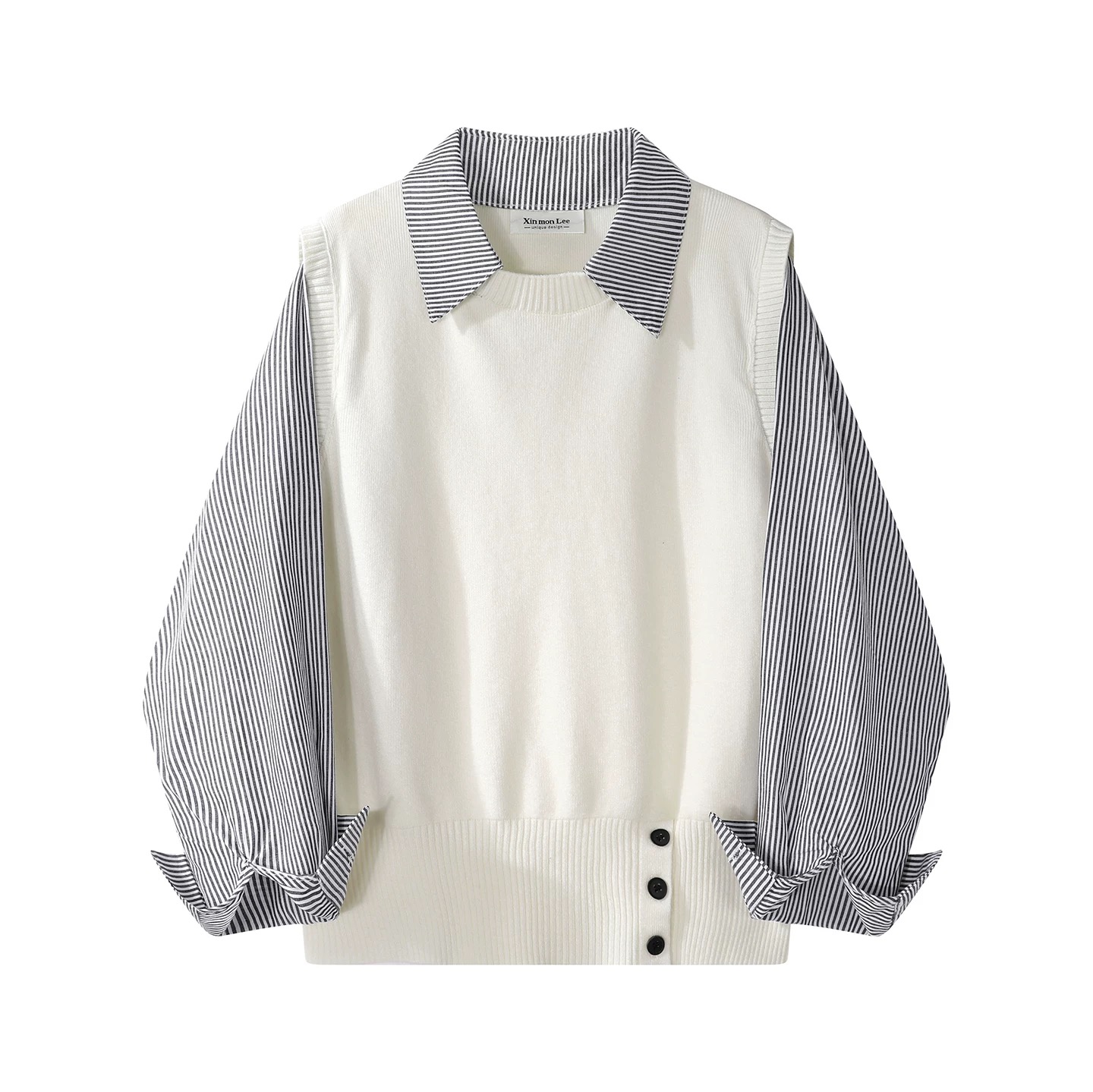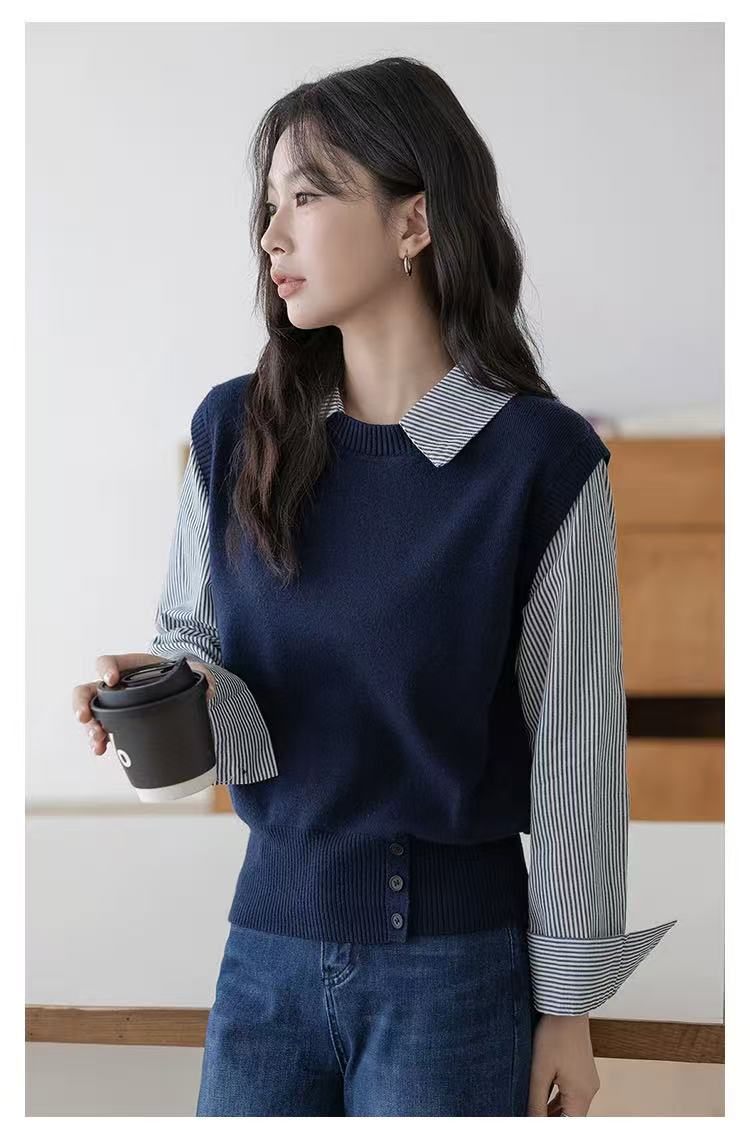 빅 사이즈 한 부서 나비 매듭 라운드 넥 페이크 레이어드 지방 mm 슬림해 보이는 니트 스웨터