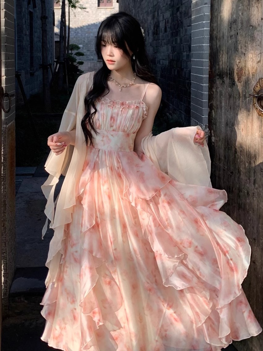 이순신 다이안 유화 헤일로 염색 프린트 허리 수축 프릴 슬립 인터넷 유명인 대외 무역 중 새로운 스타일 한국 스타일 품격 점프 슈트 치마