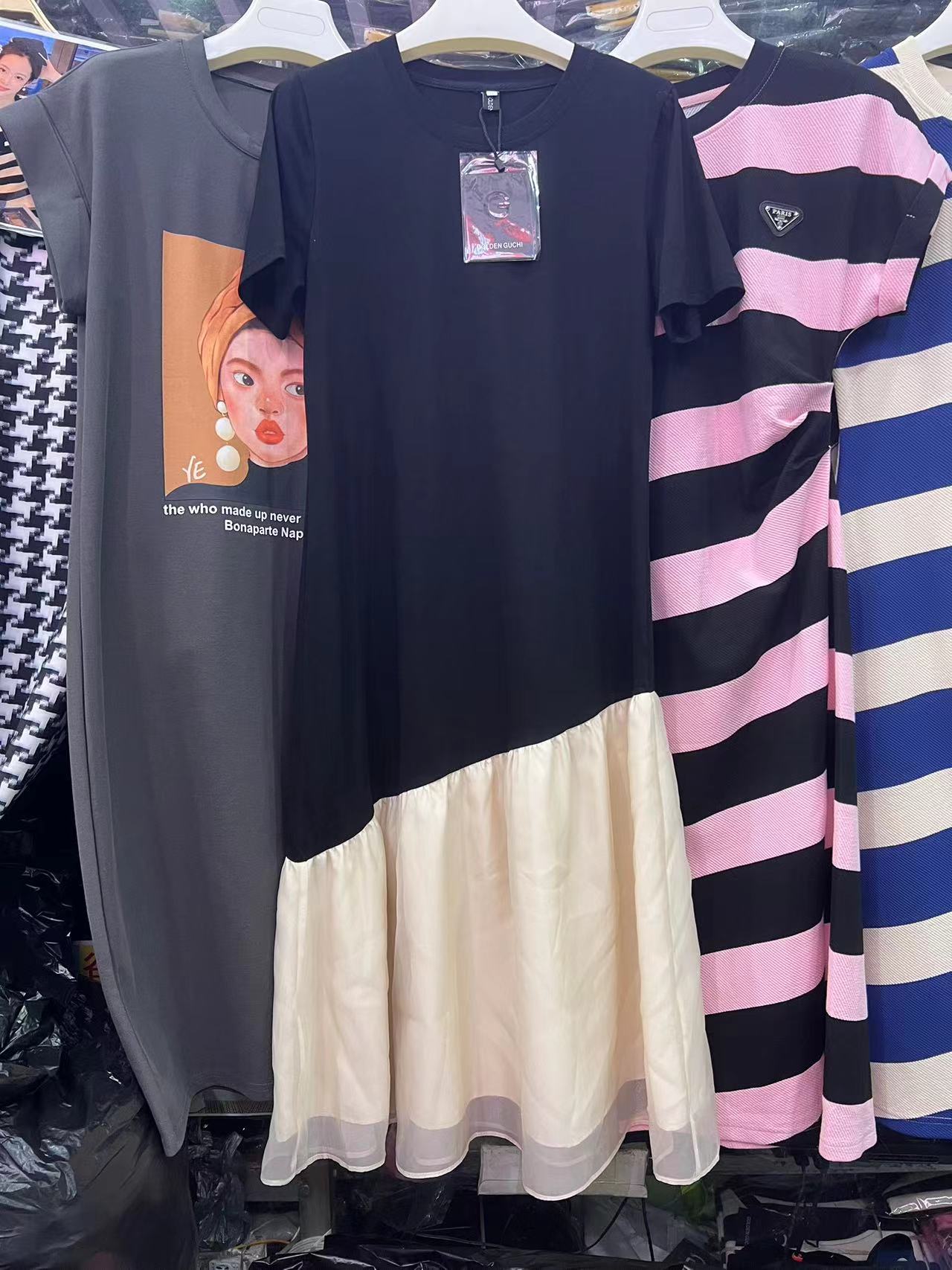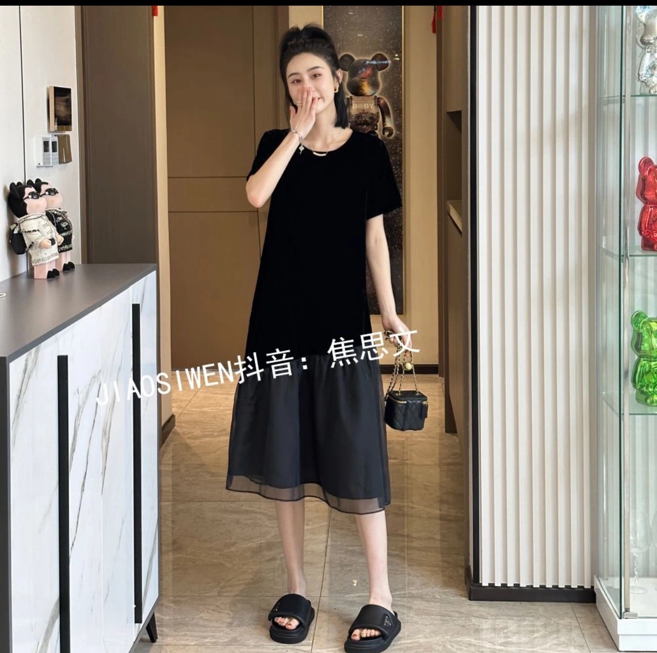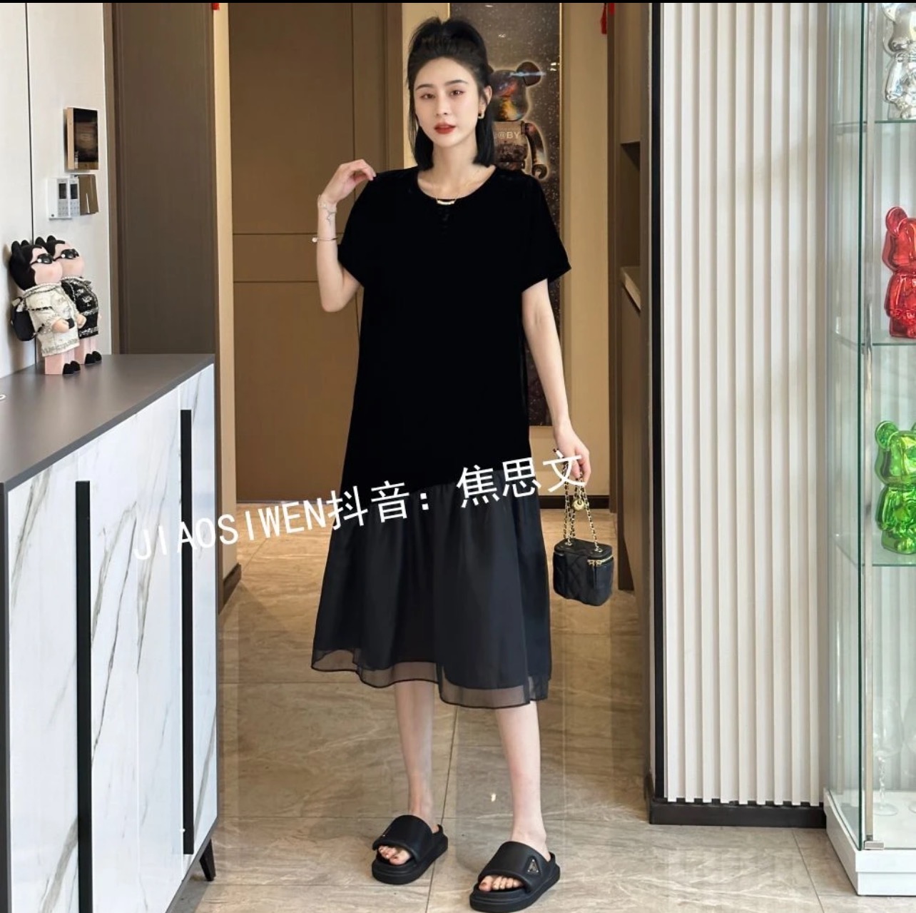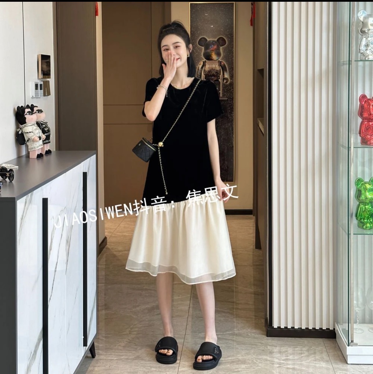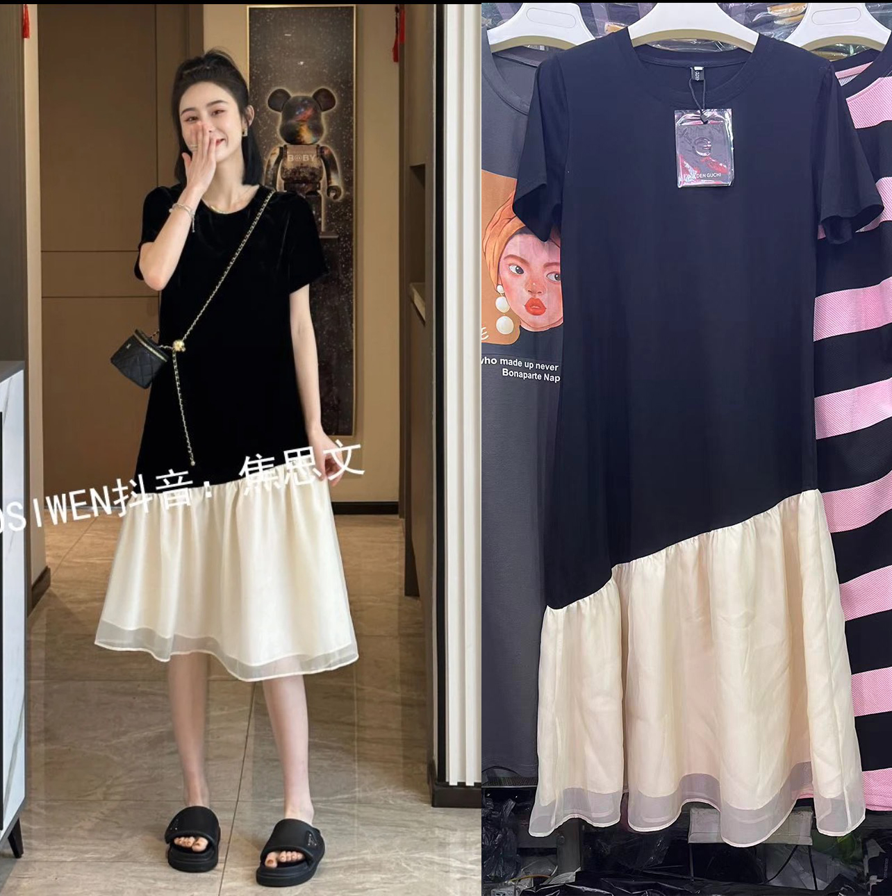 자오시 텍스트 프랑스식 패치워크 색상 페이크 레이어드 여성 드레스 여름 한국 스타일 패션 라운드 넥 루즈핏 스트레이트 중간 길이 스커트