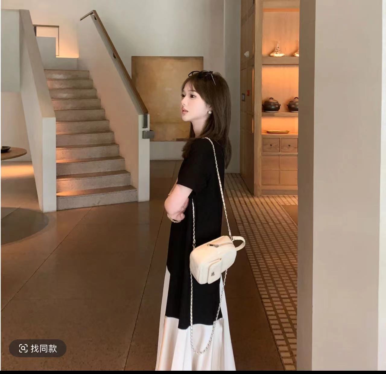 자오시 텍스트 프랑스식 패치워크 색상 페이크 레이어드 여성 드레스 여름 한국 스타일 패션 라운드 넥 루즈핏 스트레이트 중간 길이 스커트