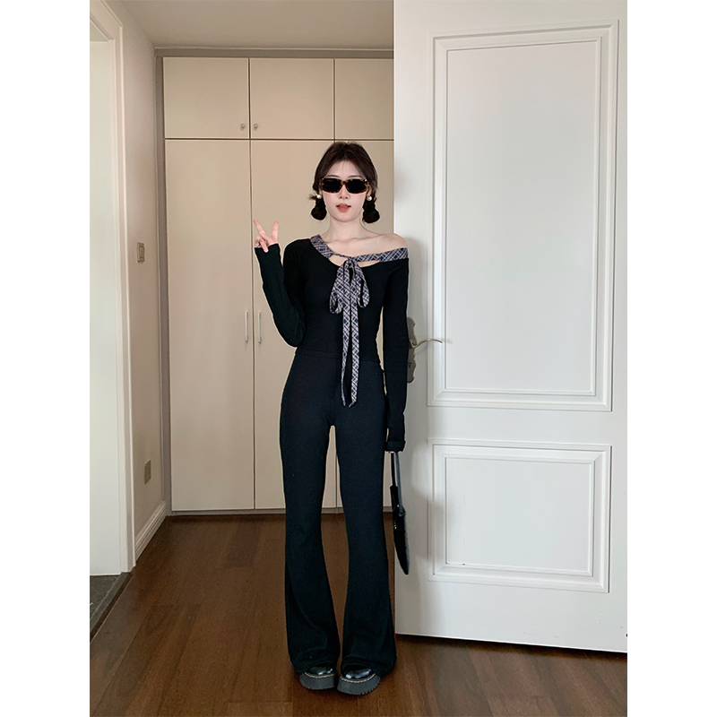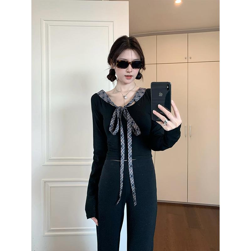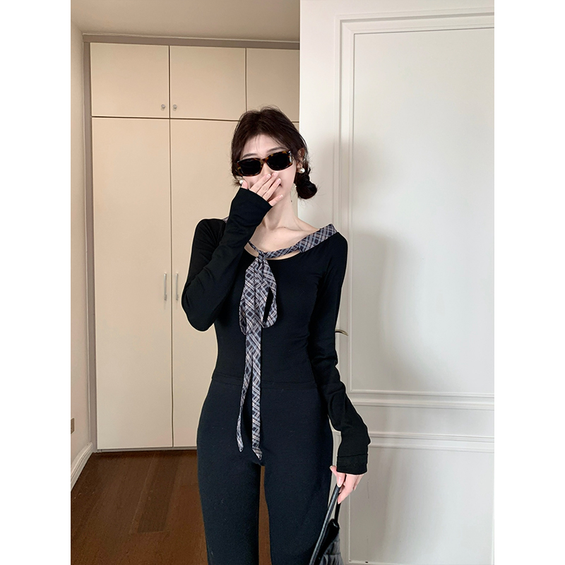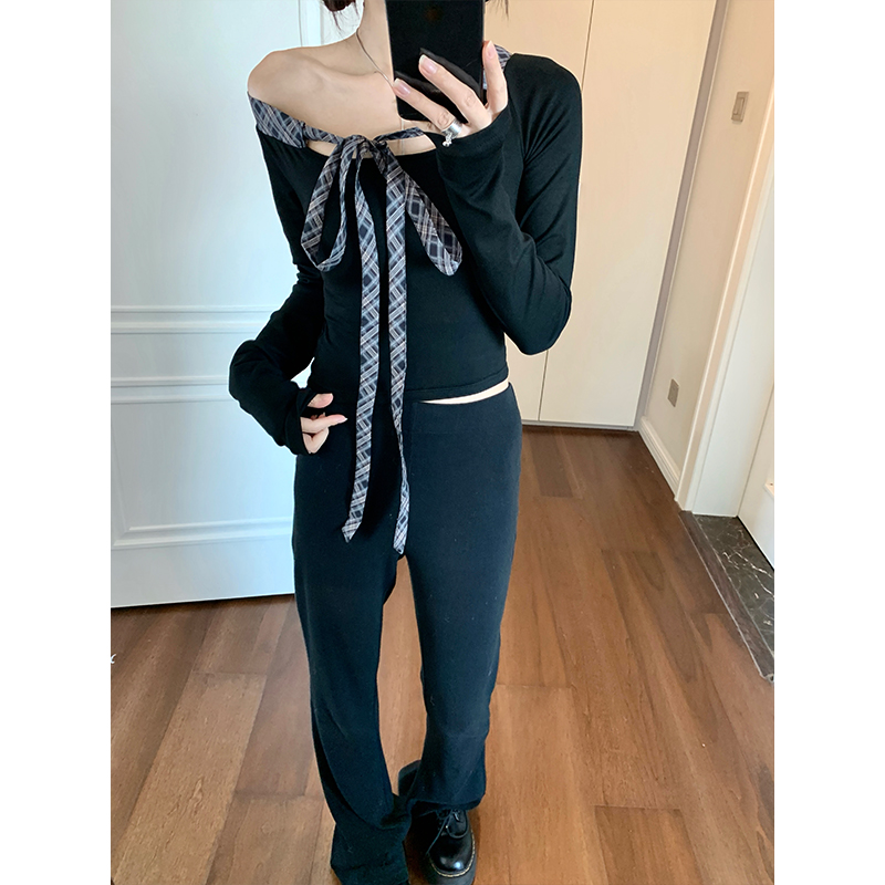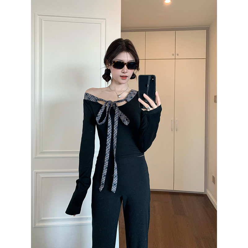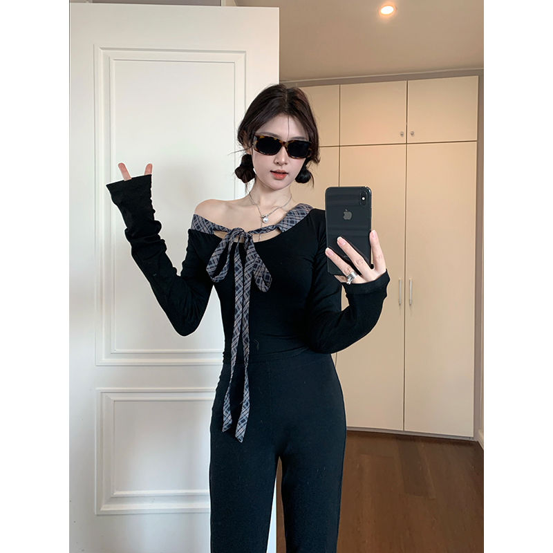 실사 빅 사이즈 여성 의류 통통한 여동생 V넥 오프숄더 긴팔 티셔츠 디자인 센스 패치워크 슬림해 보이는 나비 매듭 맨위