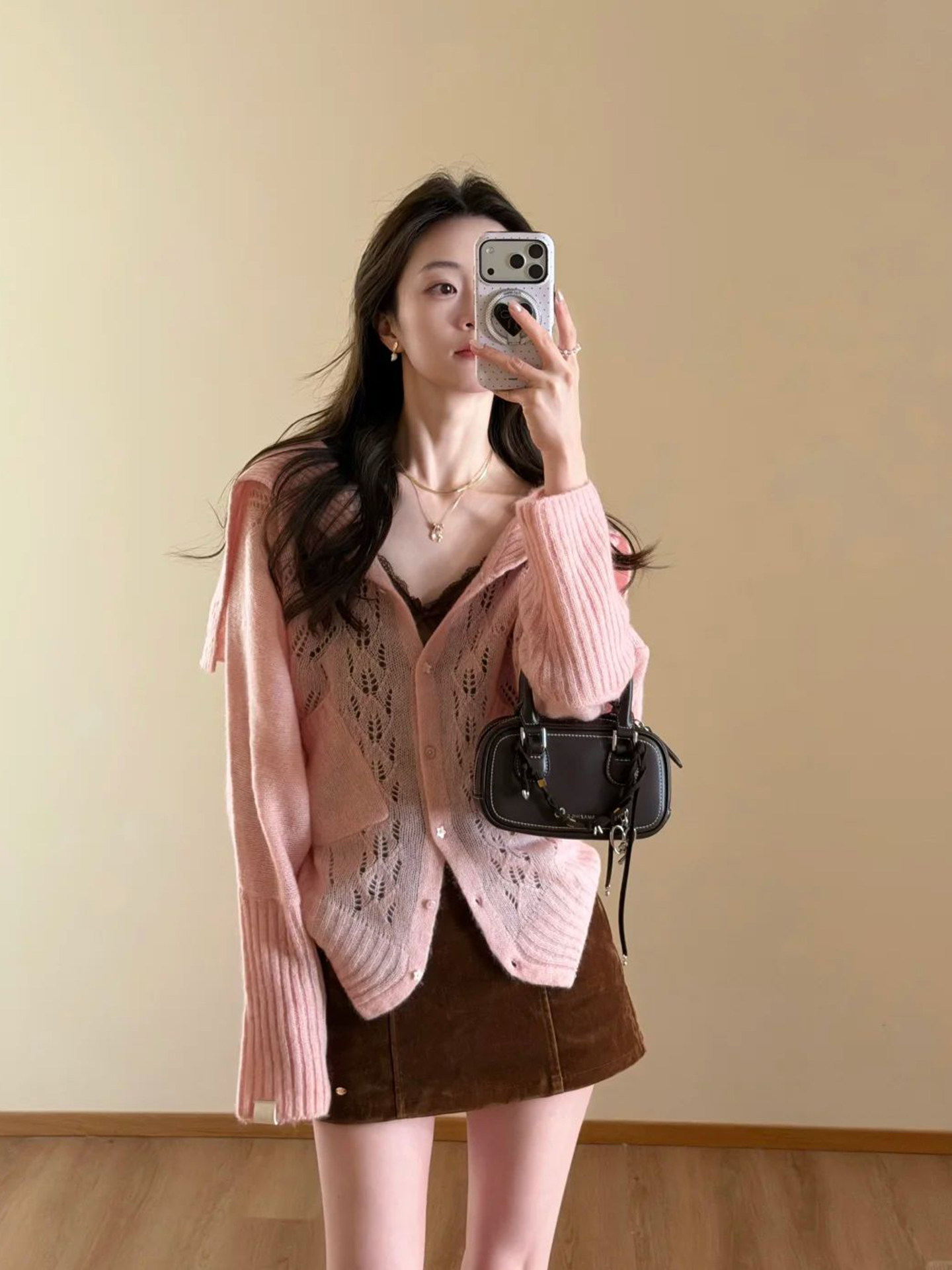 박하 녹색 니트 홀로우 아웃 긴팔 가을 의상 여자 2025 년 새로운 이른 가을 분위기 센스 착용 가져 가라. 작은 샤넬 스타일 맨위