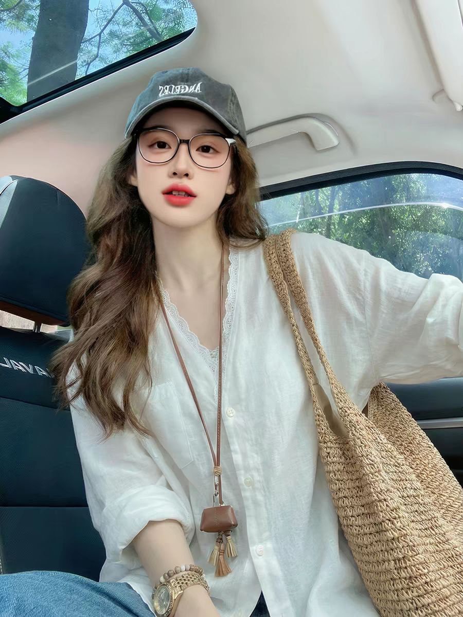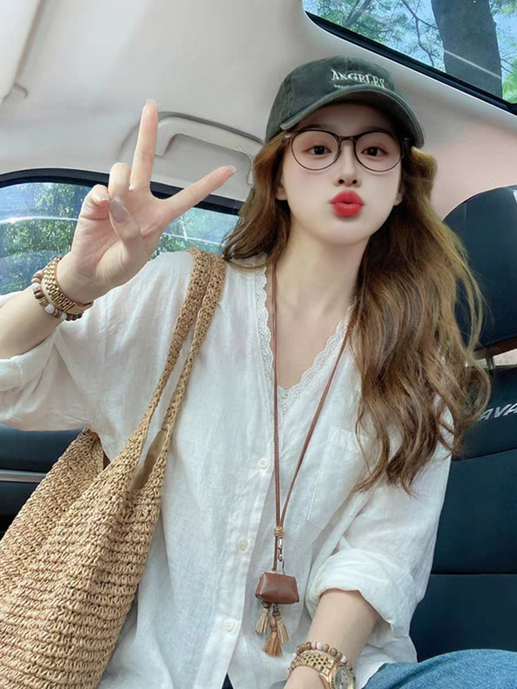제직 섬 느슨함 느긋한 프랑스식 낭만주의 100 아마 수공 프릴 V넥 스트랩 여성 셔츠 2026 봄