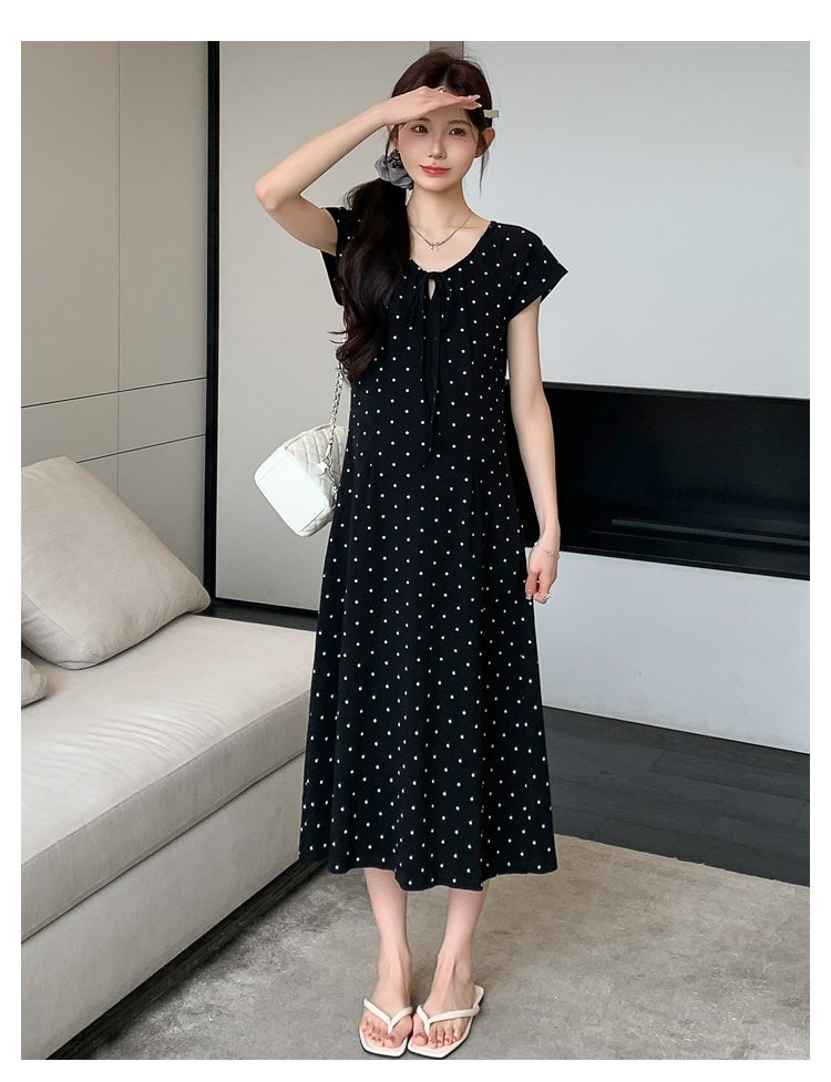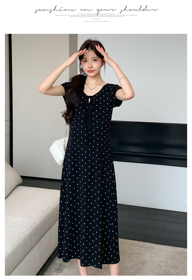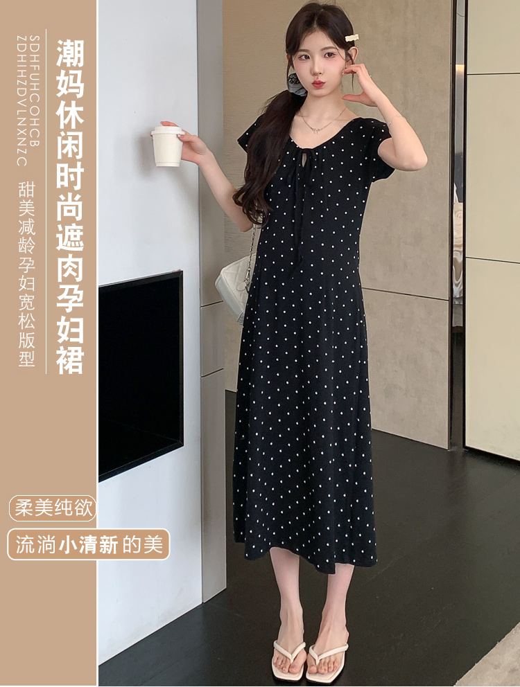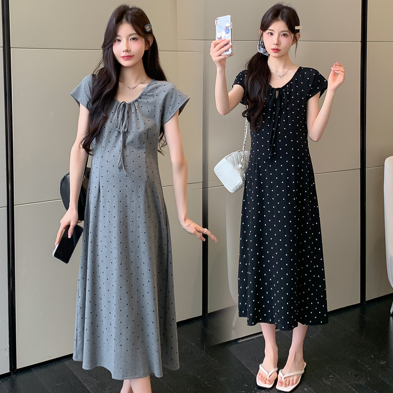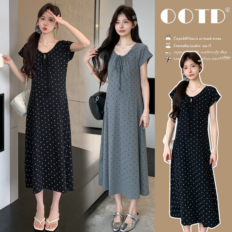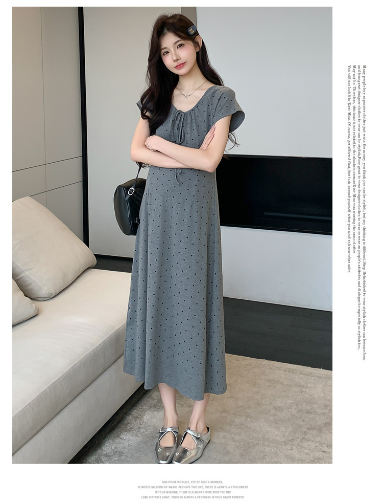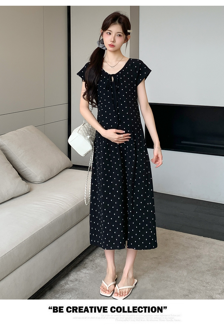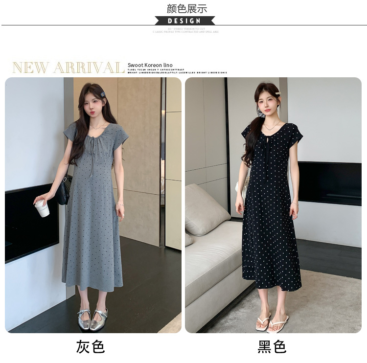 실사 2026 여름 미니멀리즘 도트 무늬 끈 클래식 라운드 넥 몸매 가꾸기 임산부 반팔 게으른 드레스