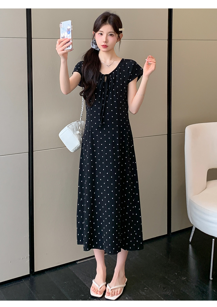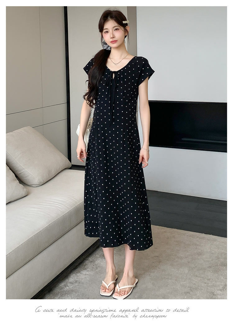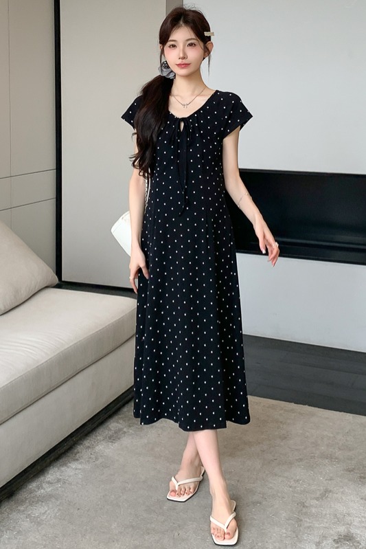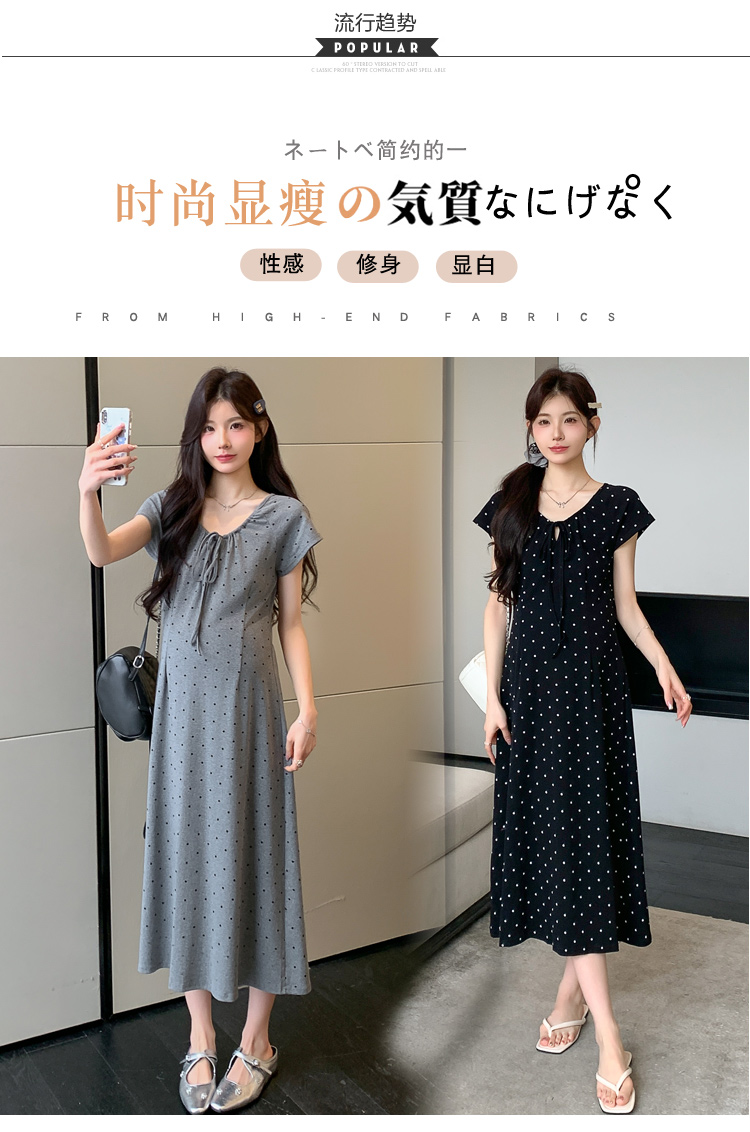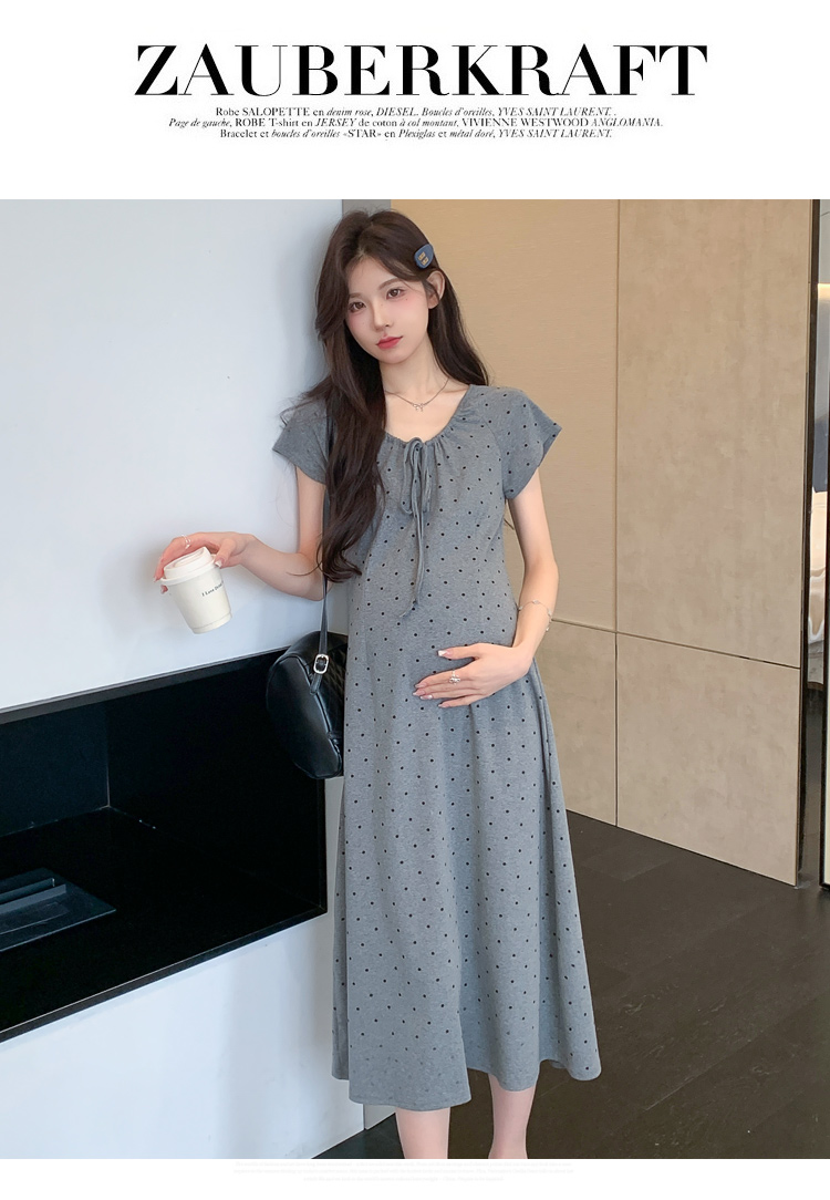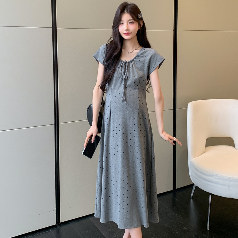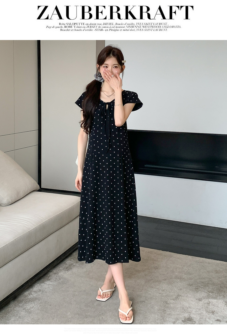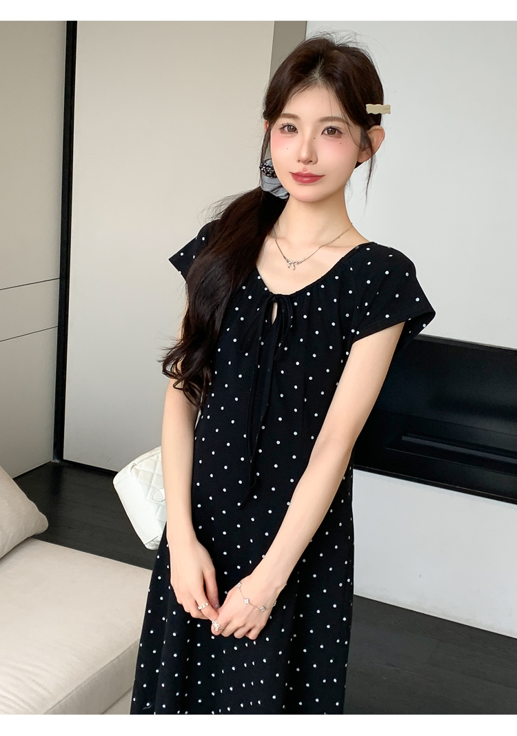 실사 2026 여름 미니멀리즘 도트 무늬 끈 클래식 라운드 넥 몸매 가꾸기 임산부 반팔 게으른 드레스
