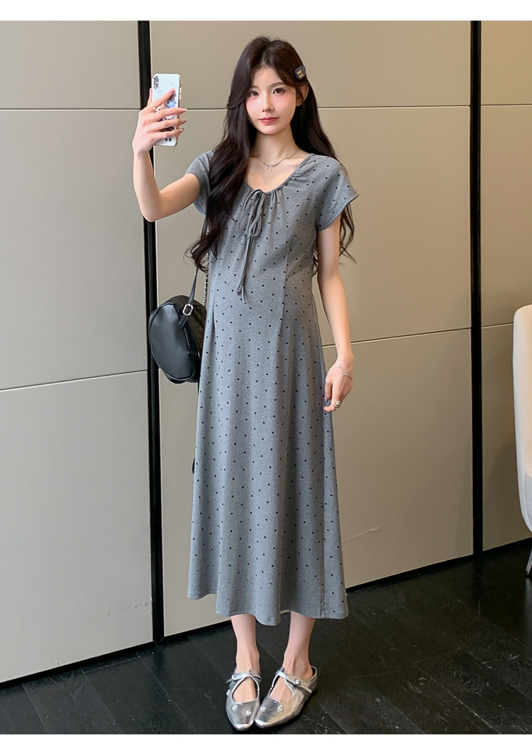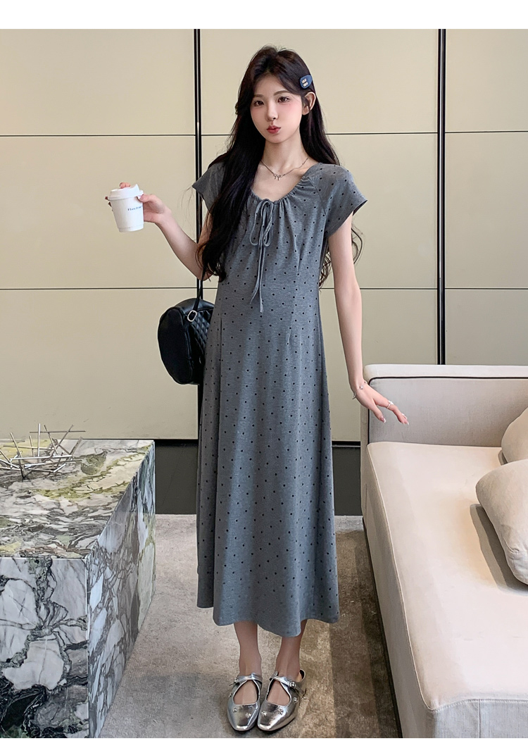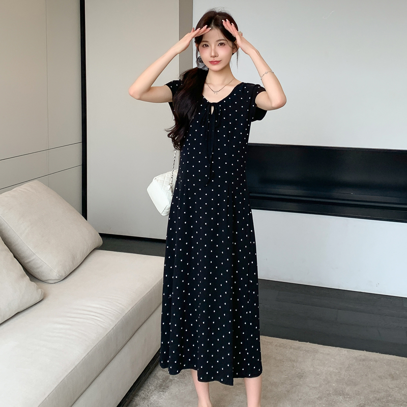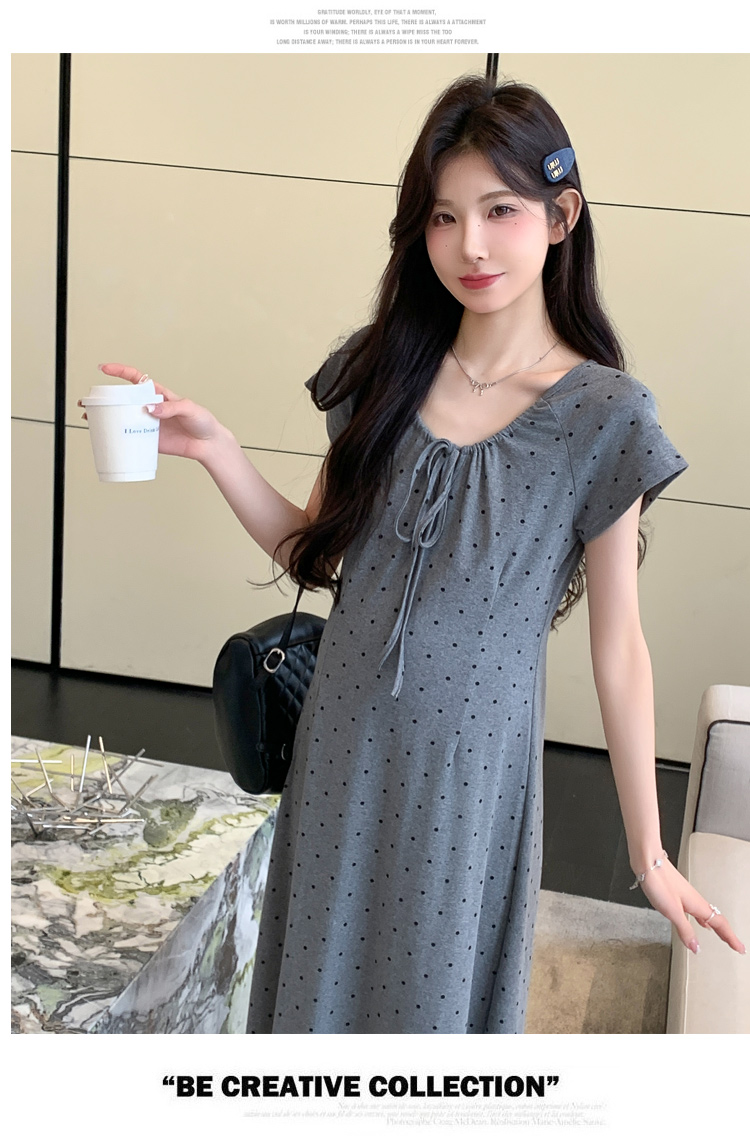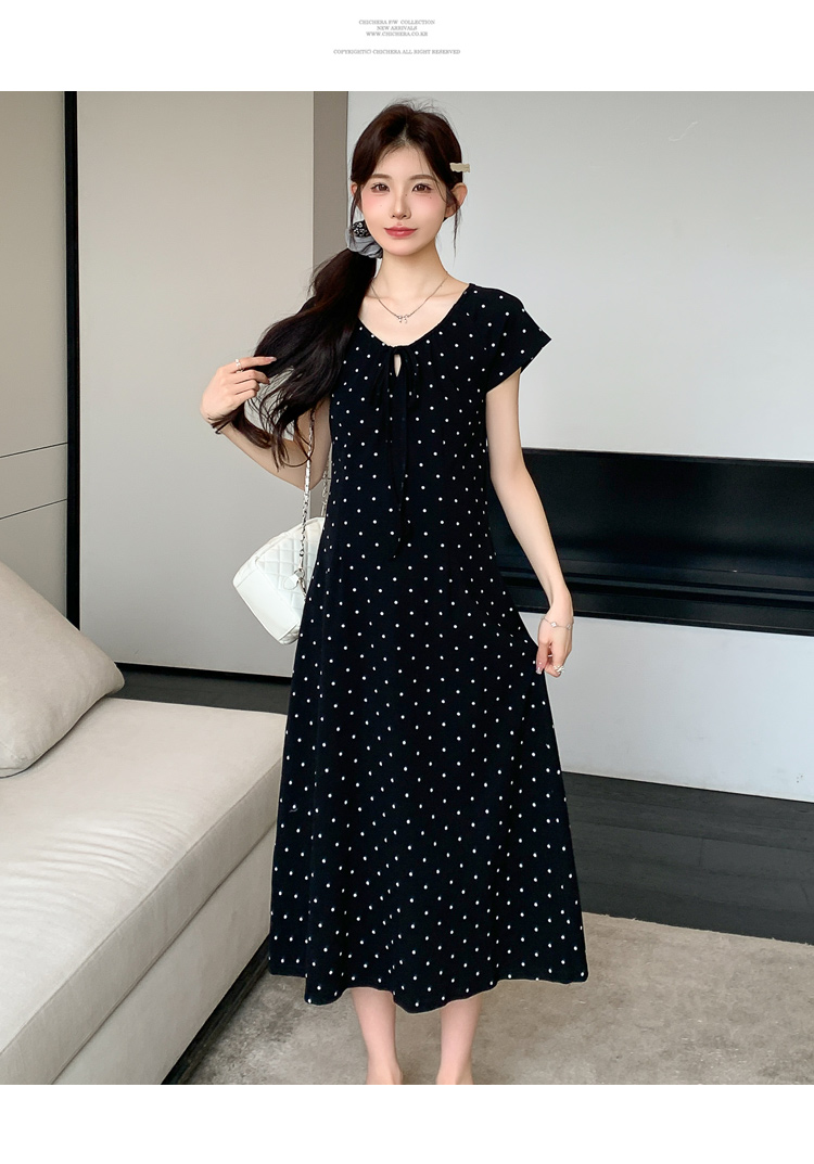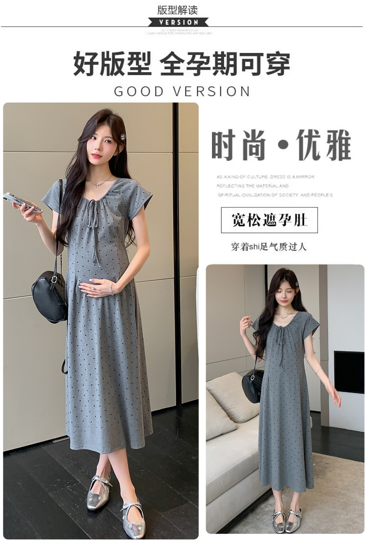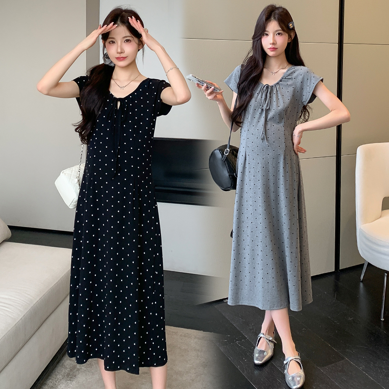 실사 2026 여름 미니멀리즘 도트 무늬 끈 클래식 라운드 넥 몸매 가꾸기 임산부 반팔 게으른 드레스