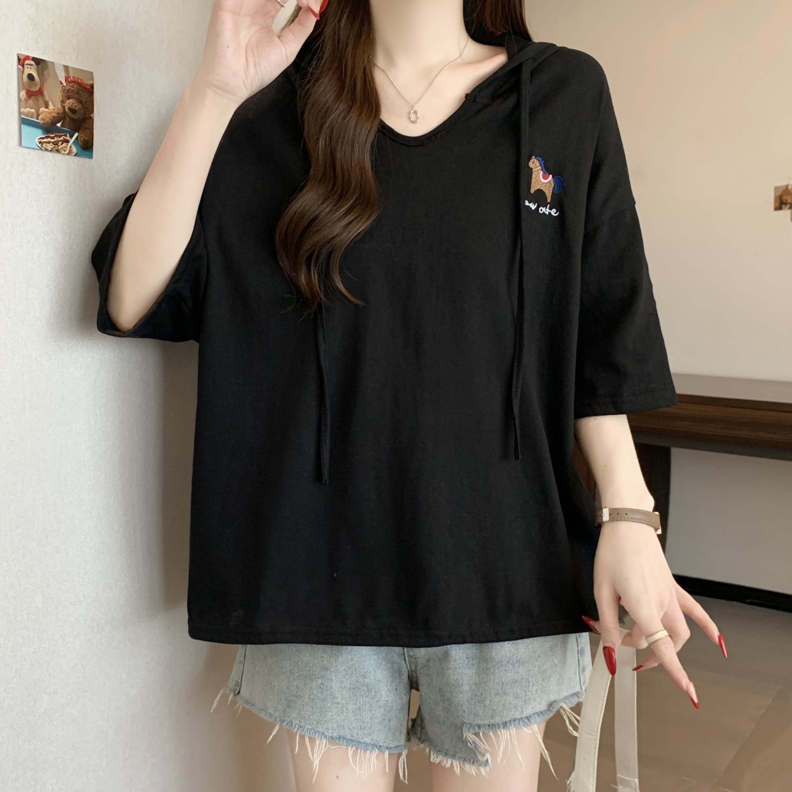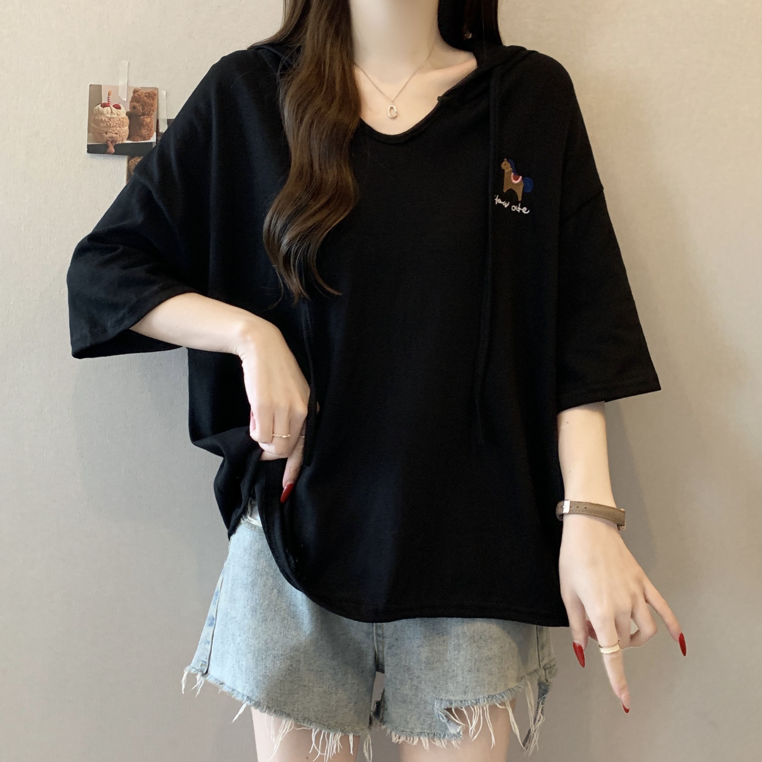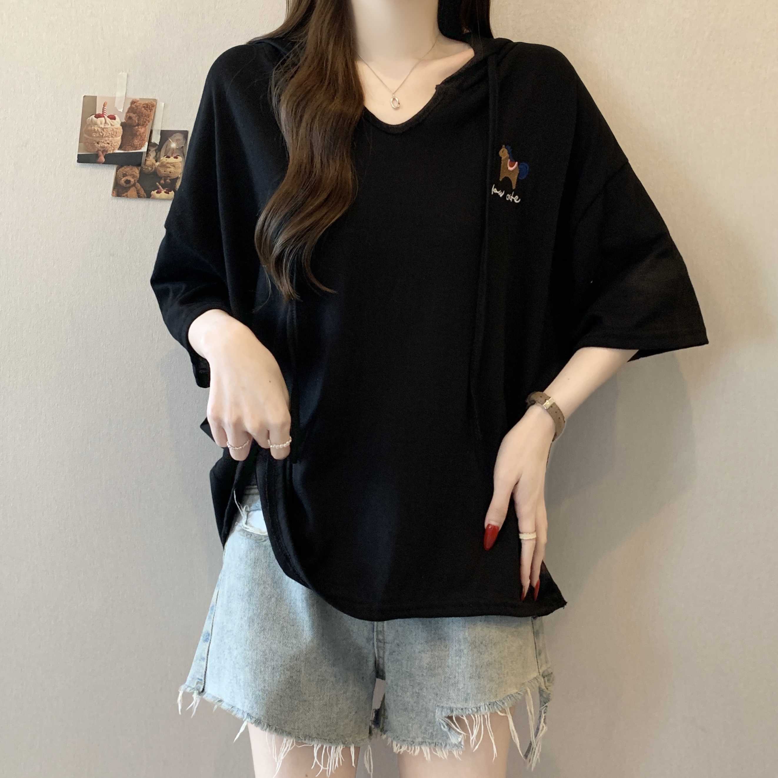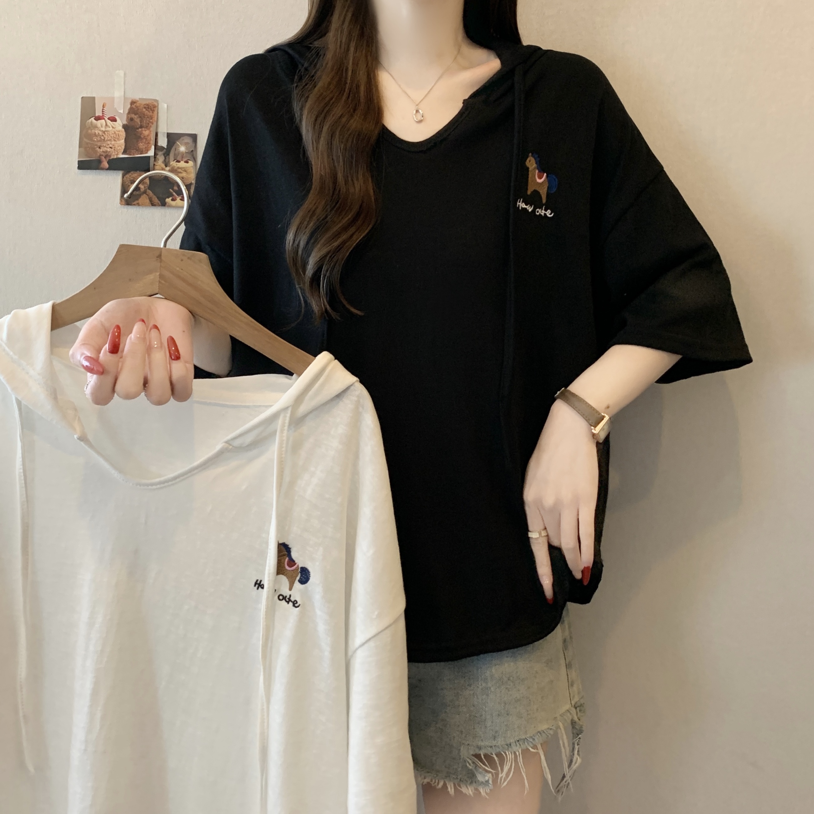 실사 2800# 빅 사이즈 지방 mm 느긋한 바람 디자인 센스 후드 자수 반팔 티셔츠 루즈핏 슬림해 보이는 다용도 맨위