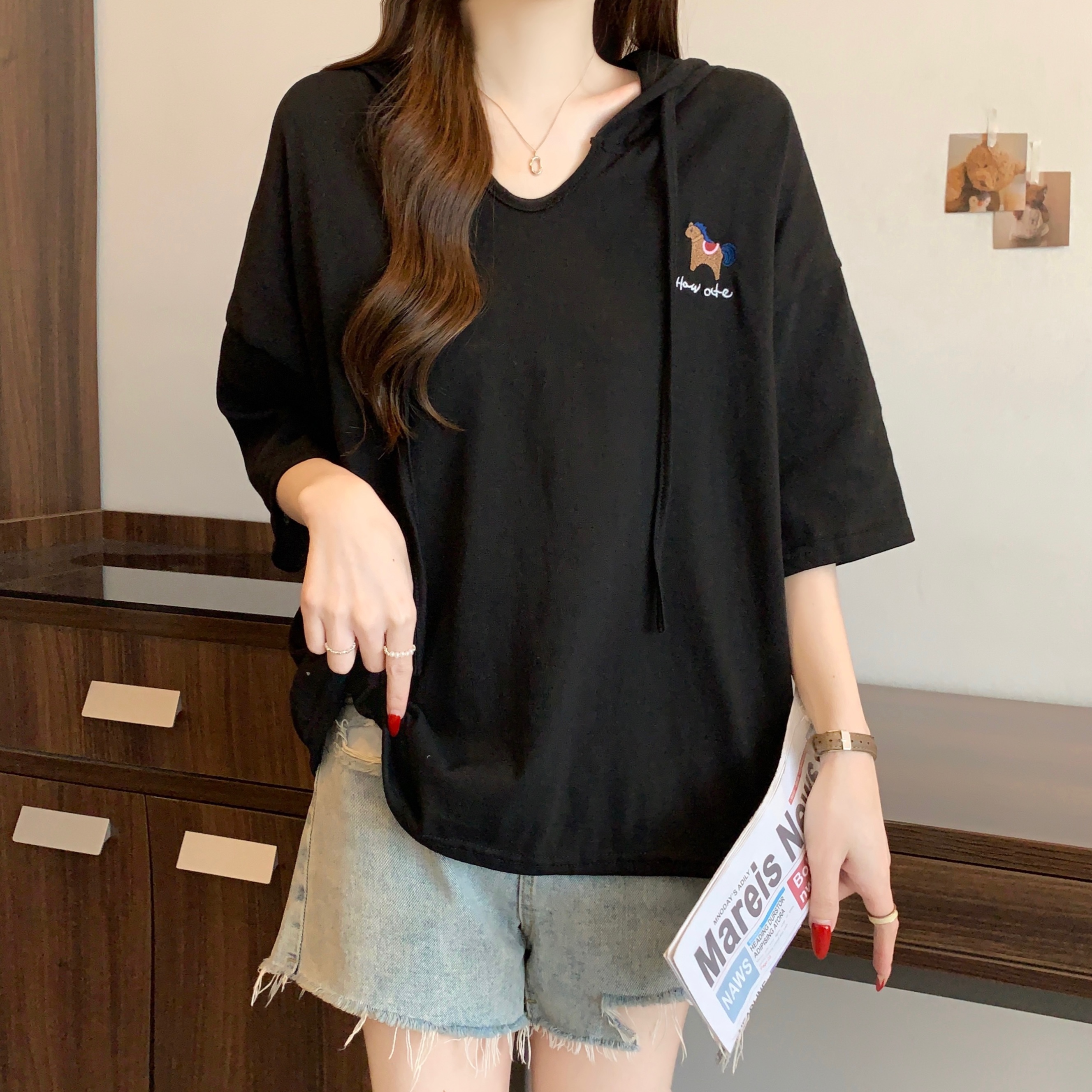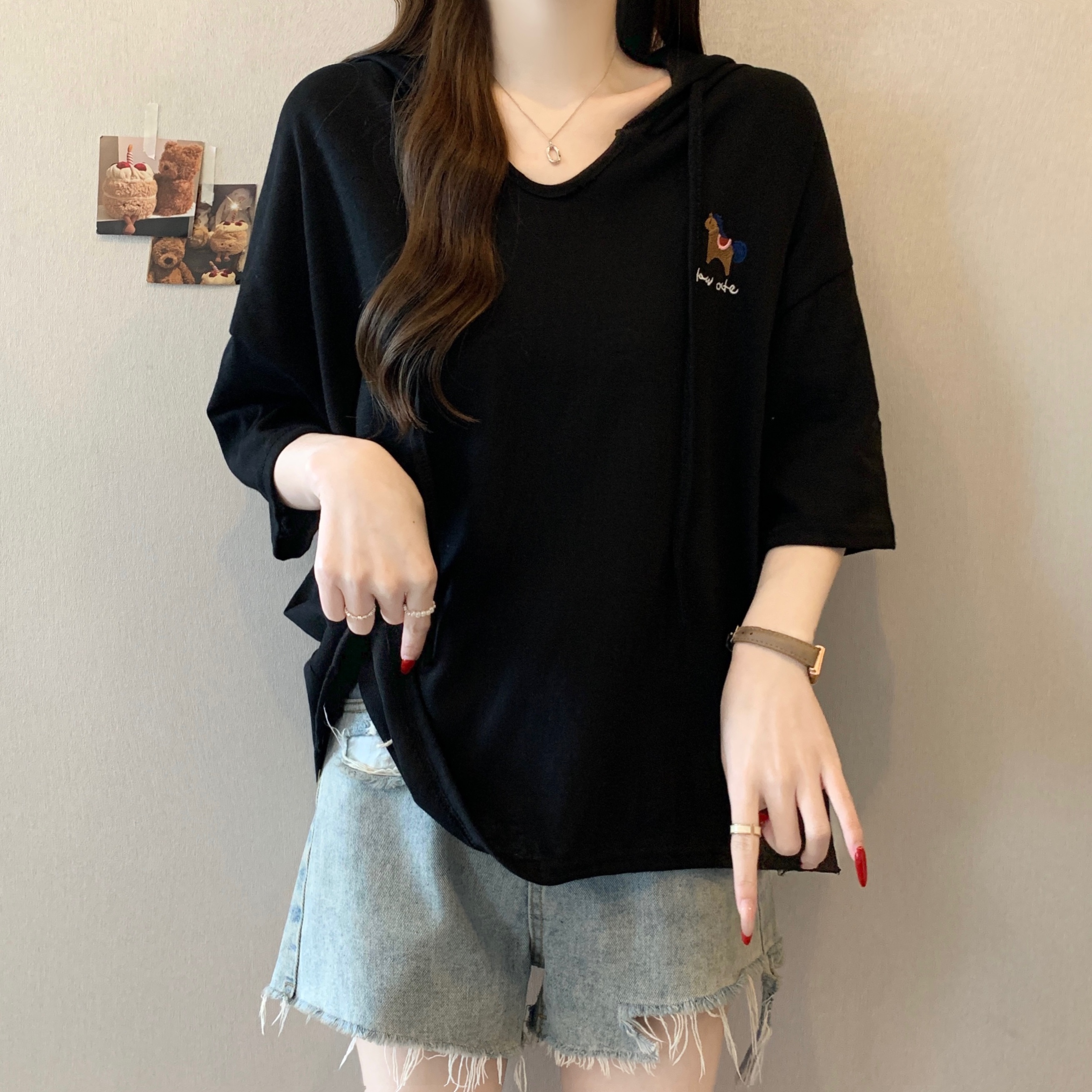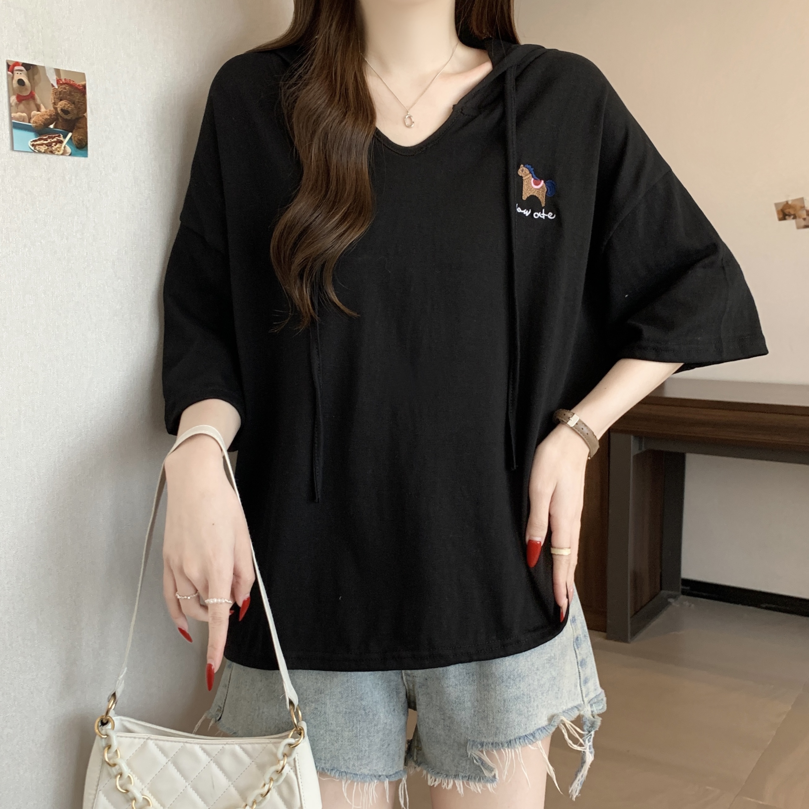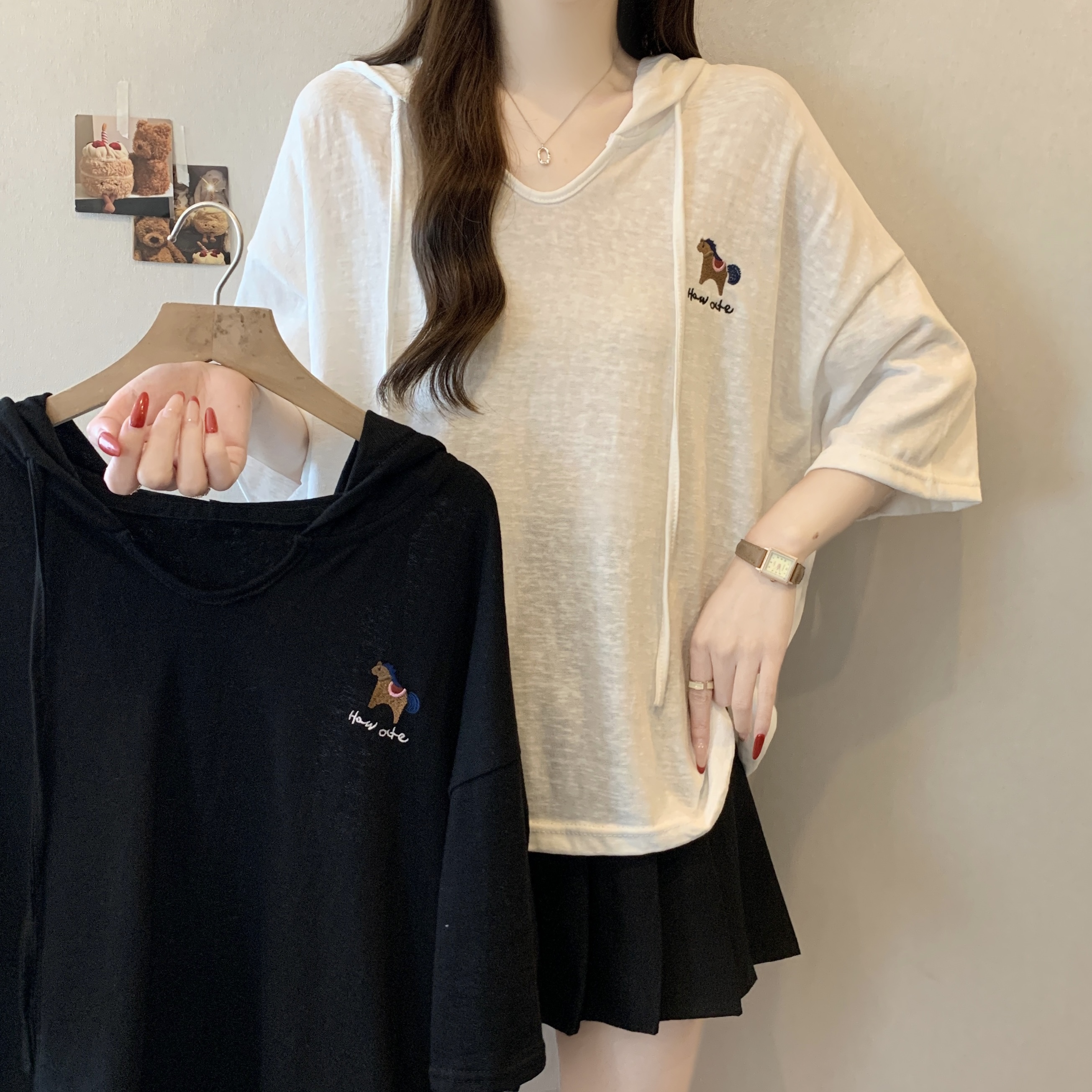 실사 2800# 빅 사이즈 지방 mm 느긋한 바람 디자인 센스 후드 자수 반팔 티셔츠 루즈핏 슬림해 보이는 다용도 맨위