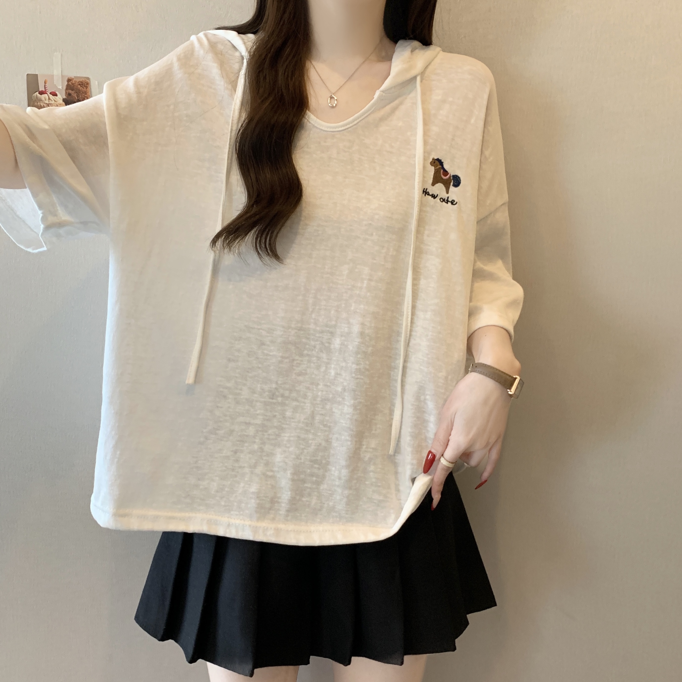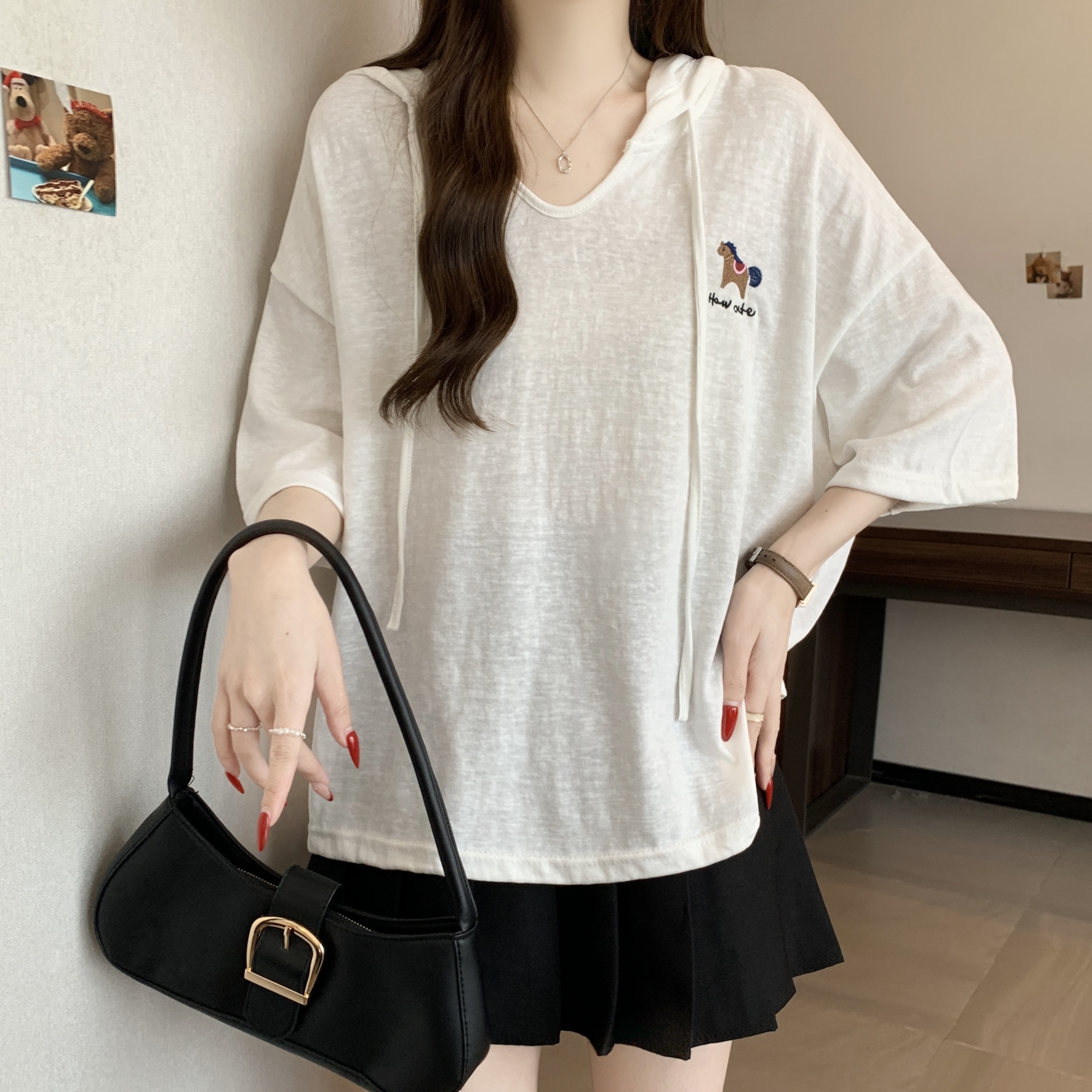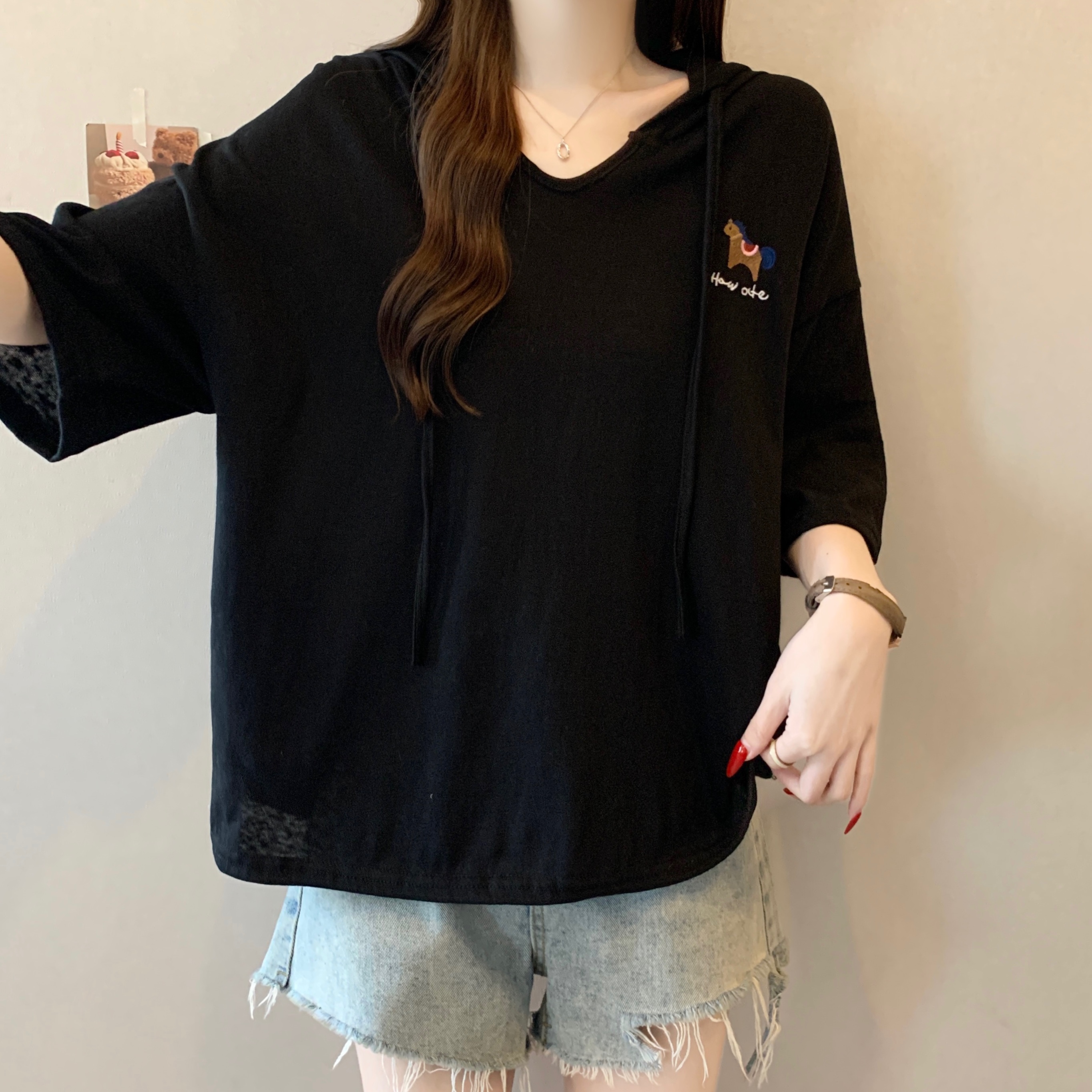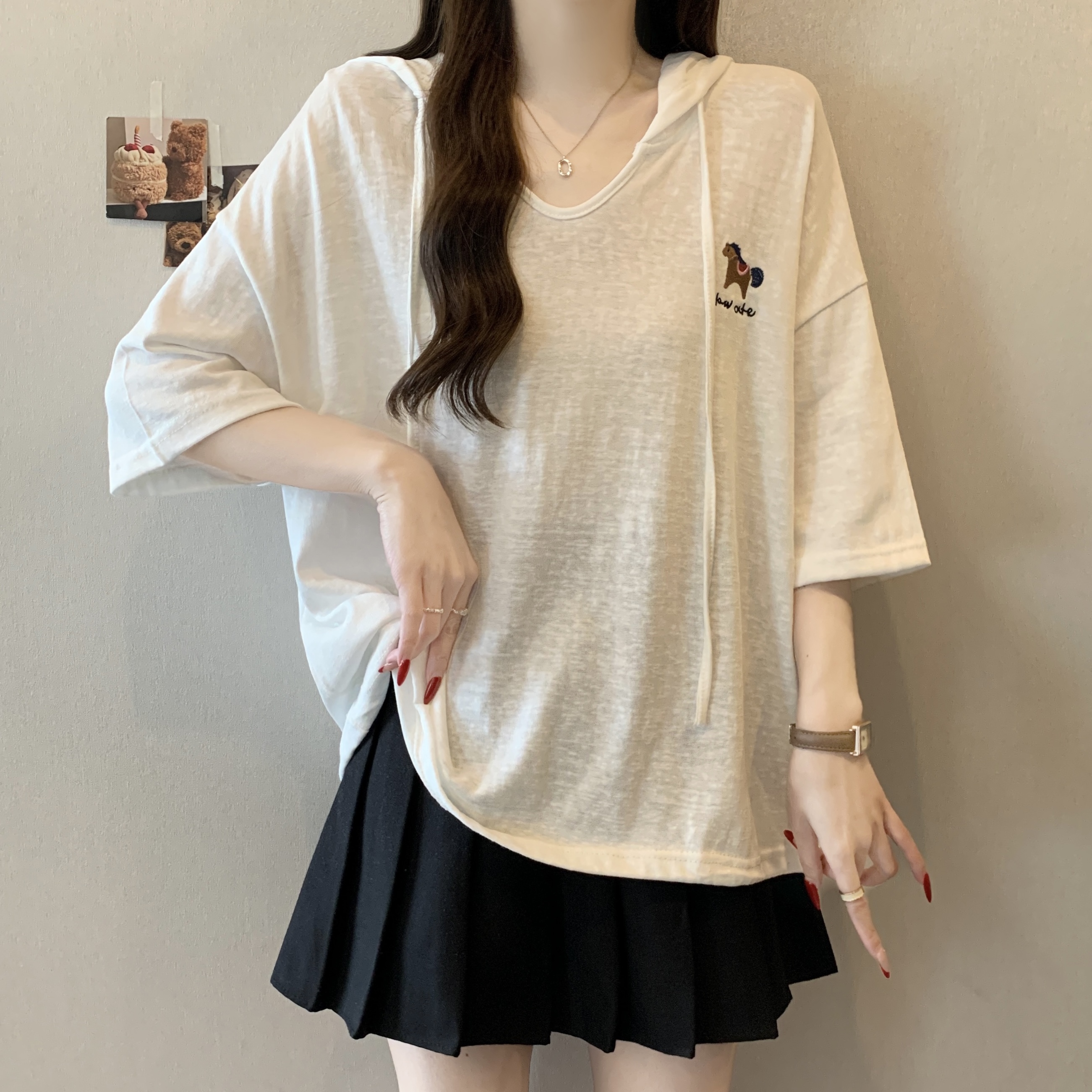 실사 2800# 빅 사이즈 지방 mm 느긋한 바람 디자인 센스 후드 자수 반팔 티셔츠 루즈핏 슬림해 보이는 다용도 맨위
