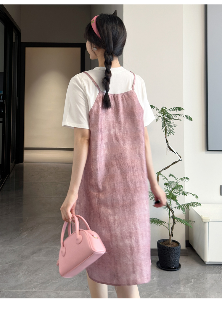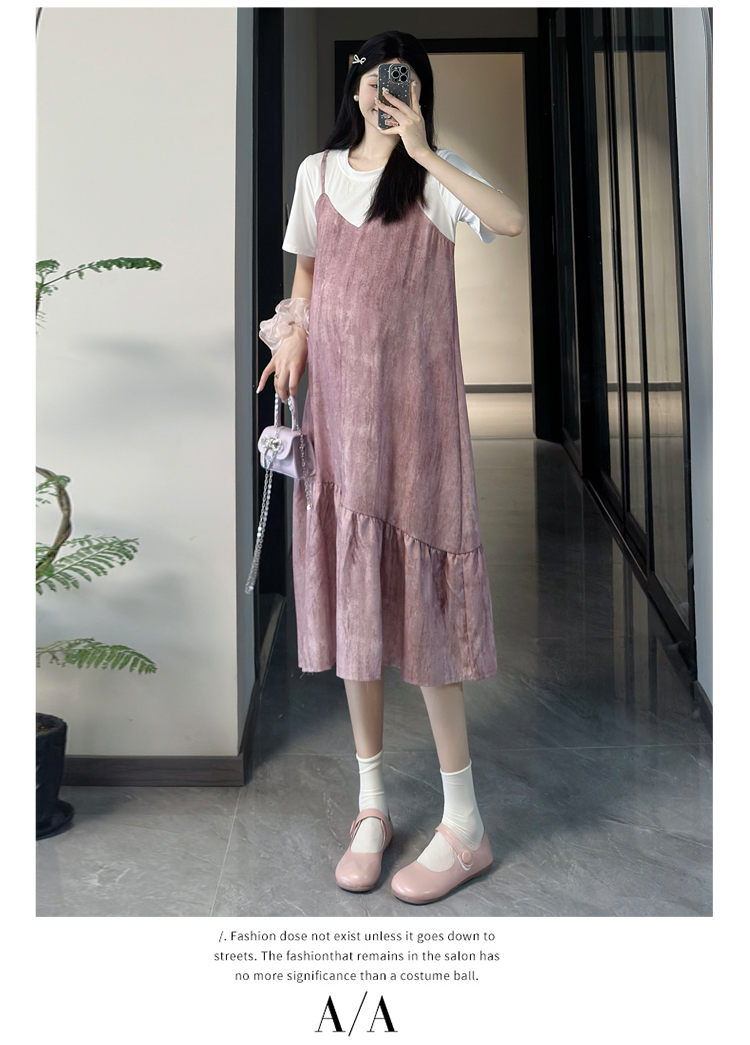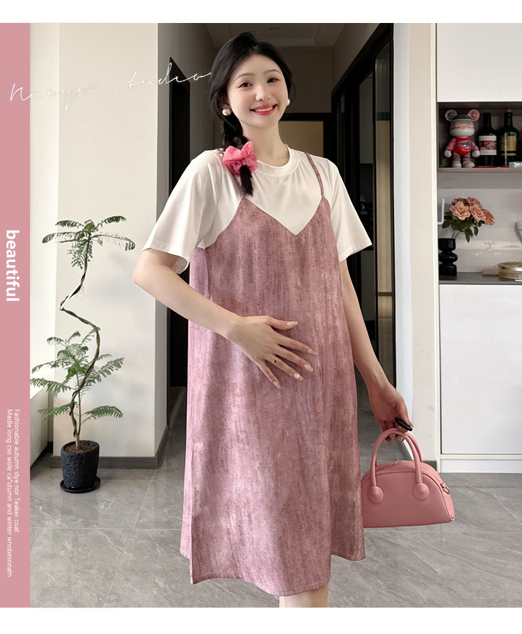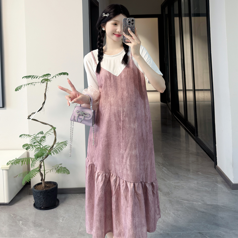실사 출산 착용 여름 드레스 패션 임산부 드레스 루즈핏 중간 길이 멜빵 치마 세트 외국 가스 트렌디 엄마 반팔