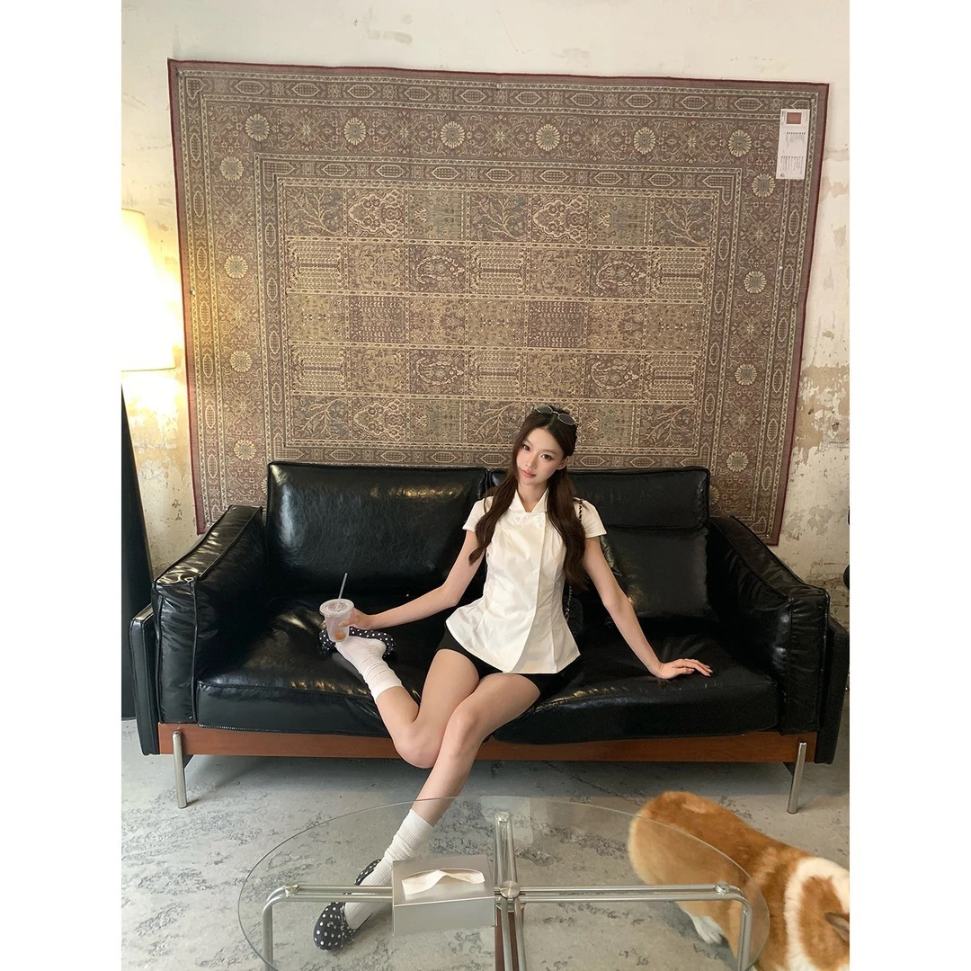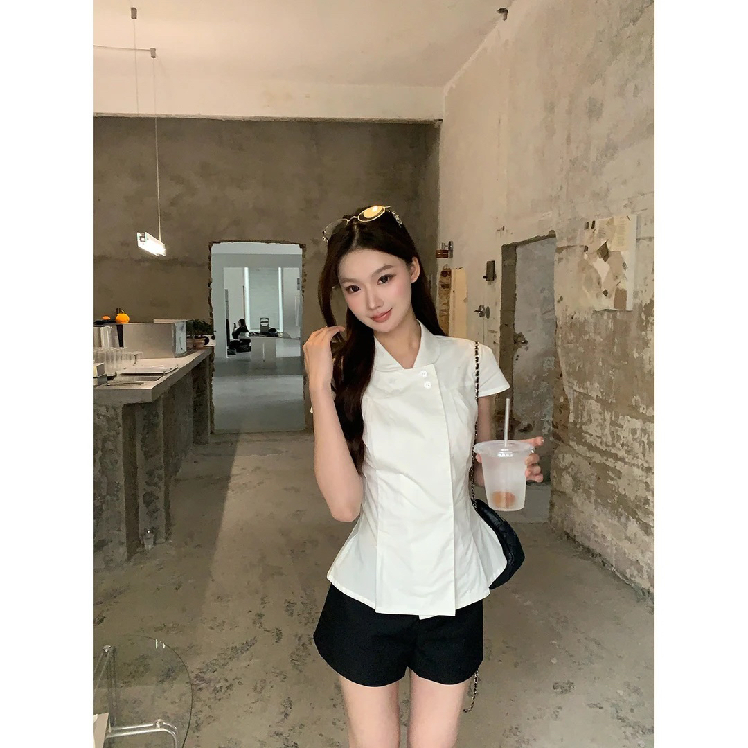 스와 리 달콤한 차 셔츠 봄 여름 프랑스식 순수한 욕망 바람 비스듬한 襟 허리 수축 화이트 반팔 bd 셔츠
