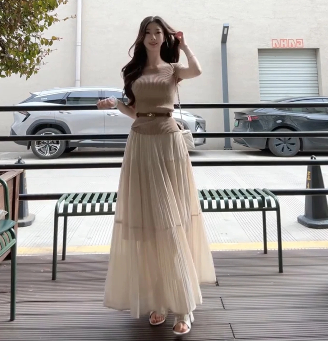 고급 분위기 센스 커피 색상 프랑스식 레트로 맨위 반신 치마 세트 봄 여름 새로운 오프숄더 망사 롱 스커트