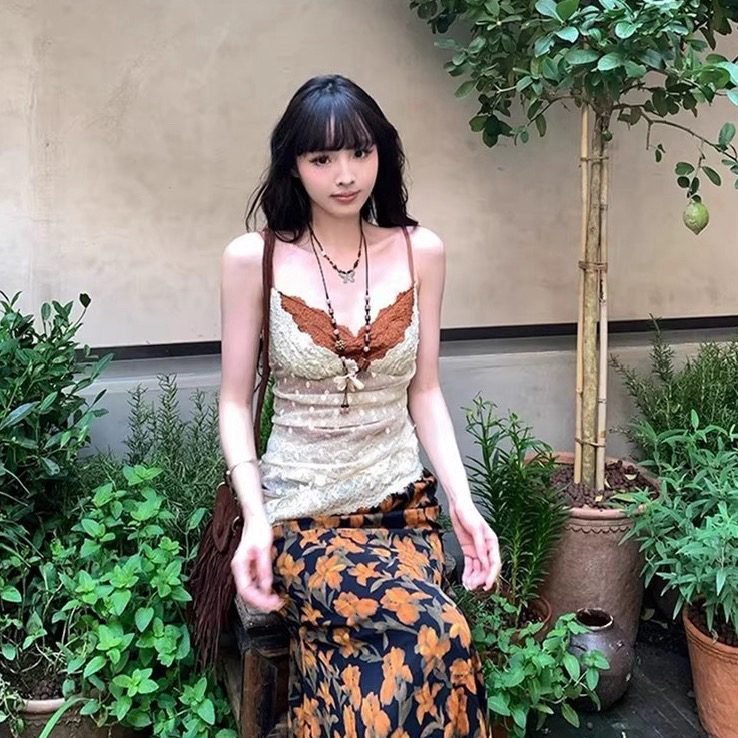 2026 새로운 차 휴식 프랑스식 쉬폰 작은 어린이 길이 치마 검정색 꽃무늬 슬립 드레스 투피스 슈트 여성 여름