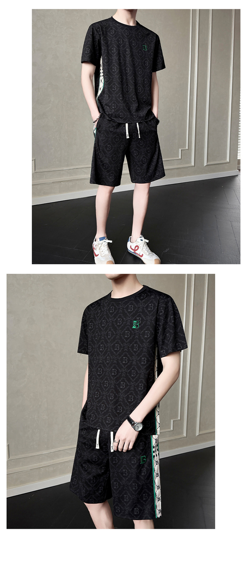 세트 반팔 반바지 두 조각 캐주얼 새로운 산소 면 운동 조수 브랜드 두 바 삽입 어깨 소매 패치워크 색상 루즈핏 세트