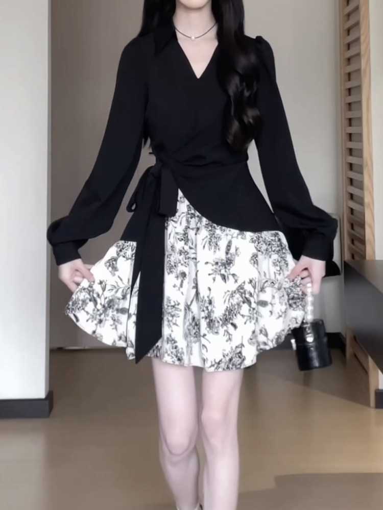 디자인 센스 불규칙 패치워크 수묵화 꽃무늬 여성 드레스 가을 작은 키 하나 슬라이스 허리 수축 V넥 롱 스커트