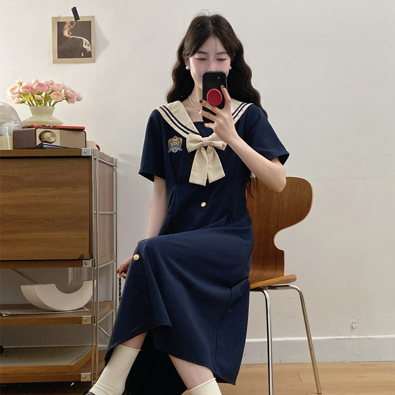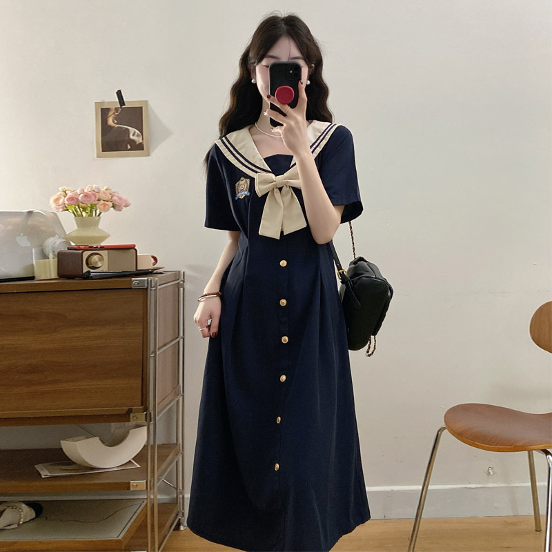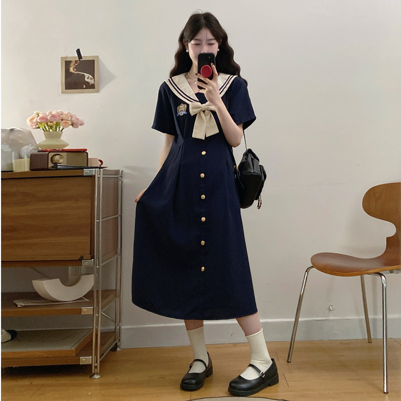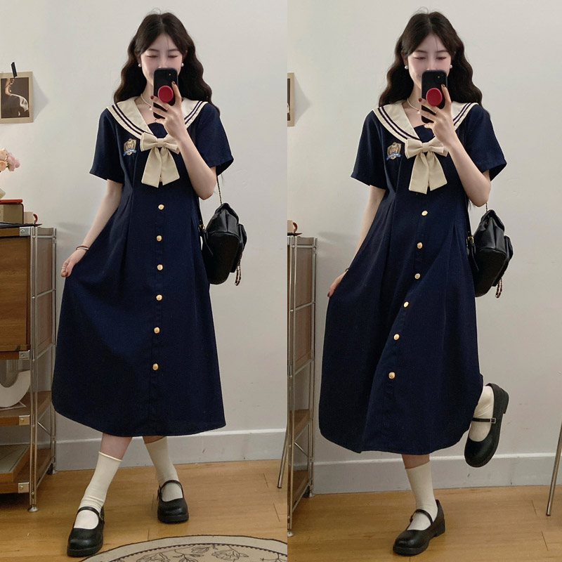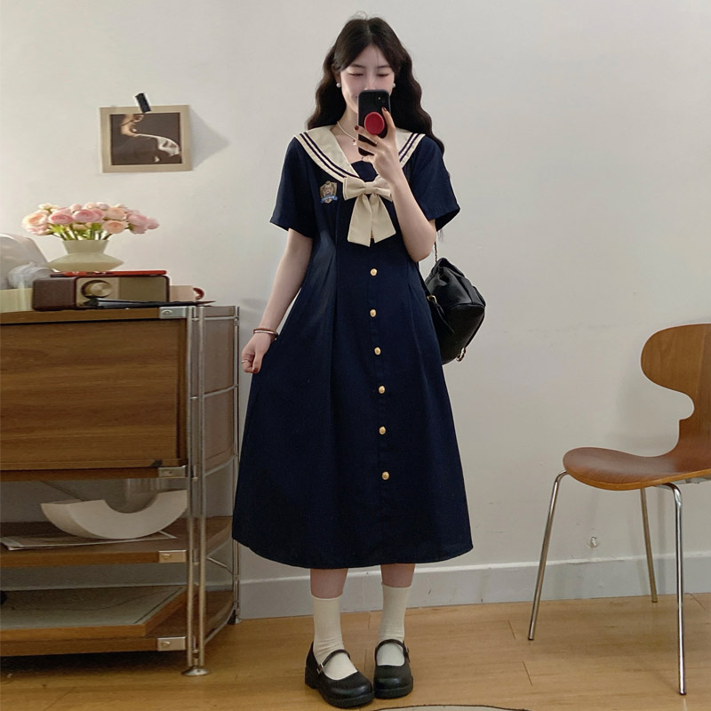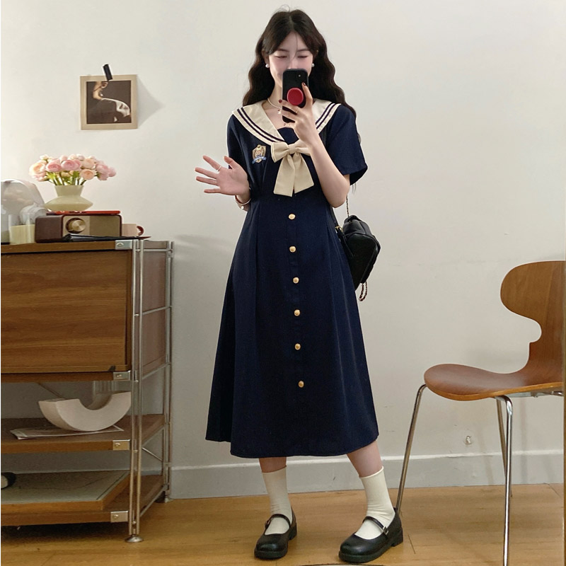 실사 여름 새로운 빅 사이즈 마이크로 지방 해군 칼라 여성 드레스 자수 연령 감소 허리 수축 지방 mm A라인 스커트