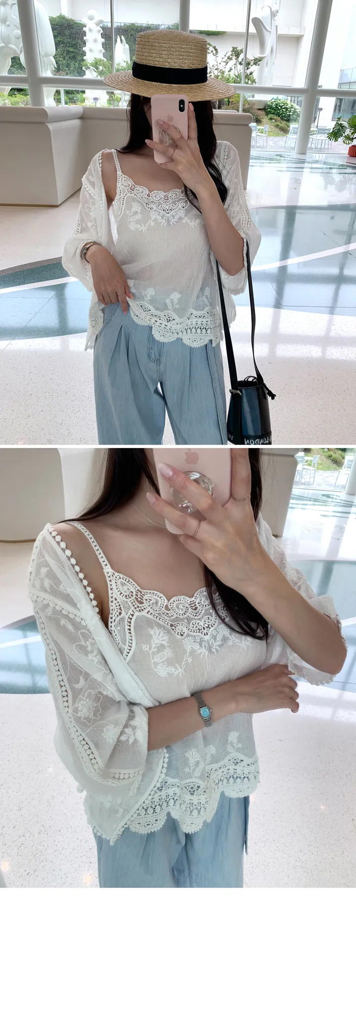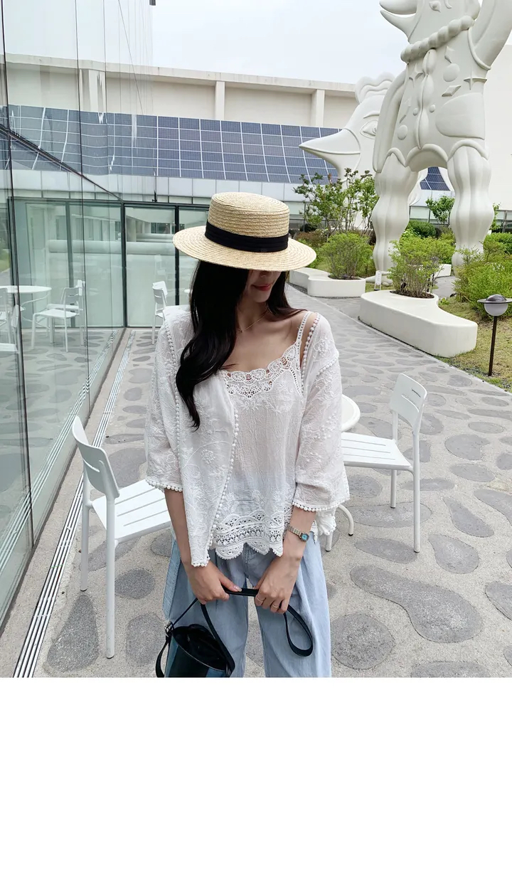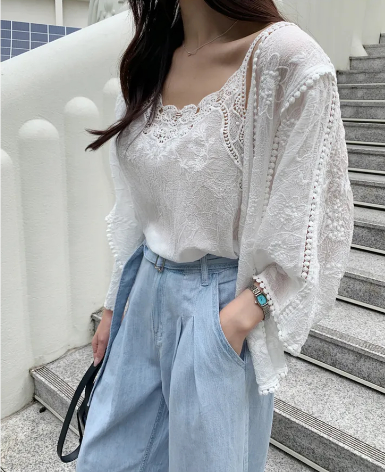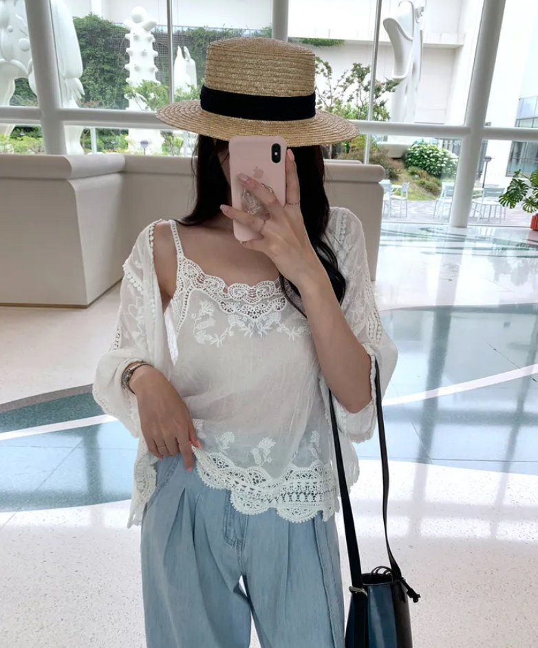 2026 년 조기 봄 한 부서 패션 새로운 고급 센스 물 용해 자수 자외선 차단 작은 셔츠 캐미솔 세트 여성
