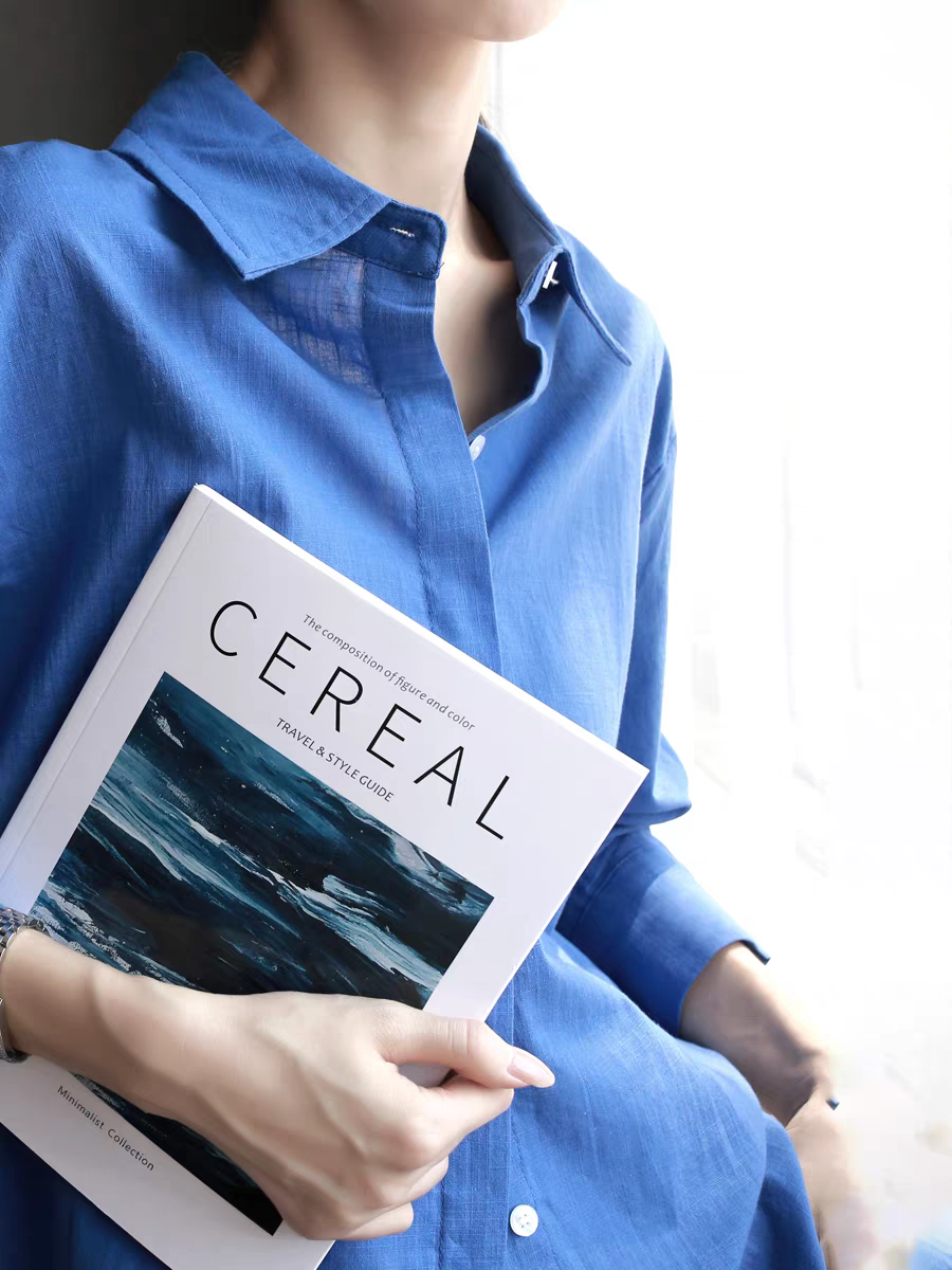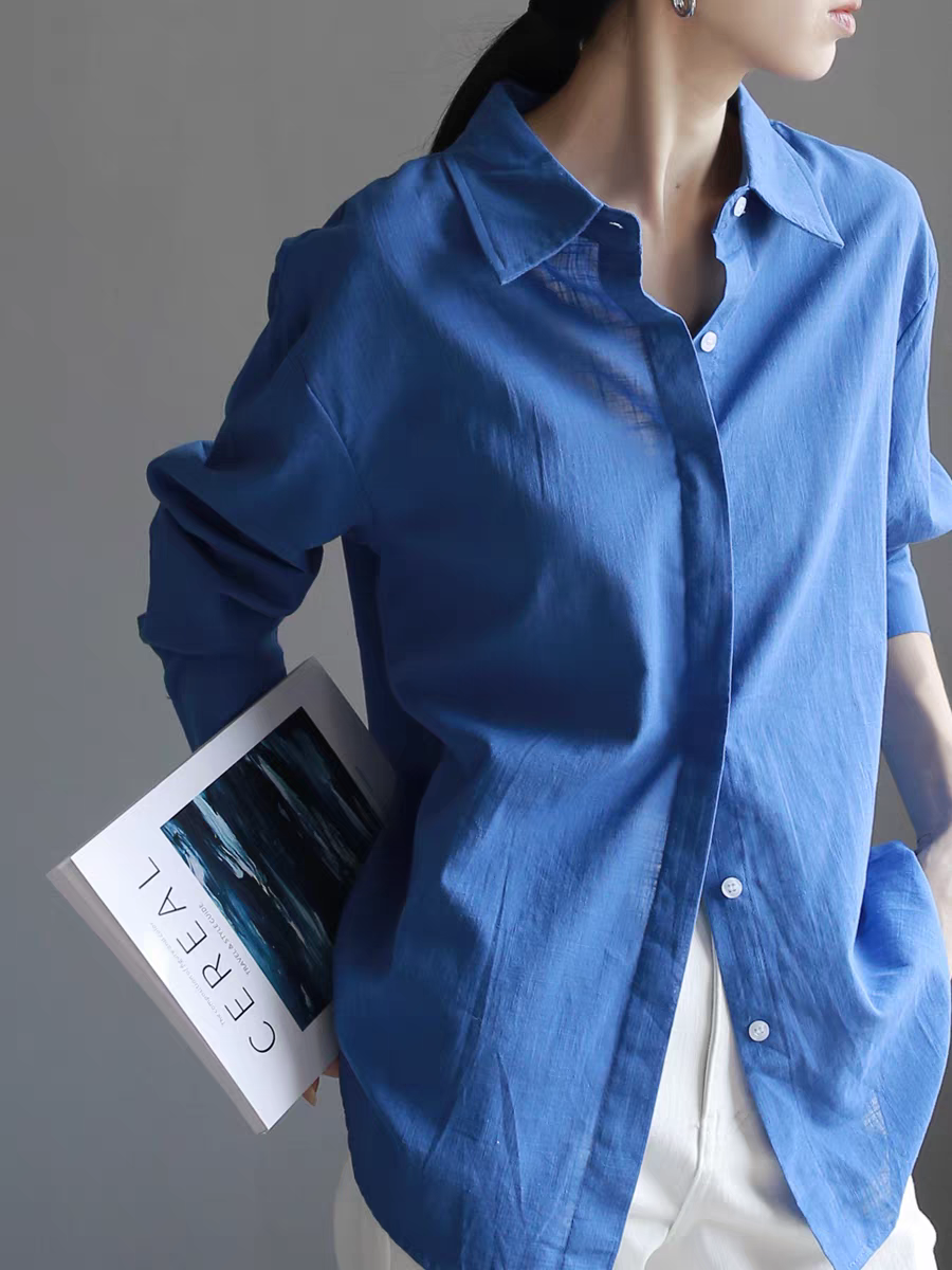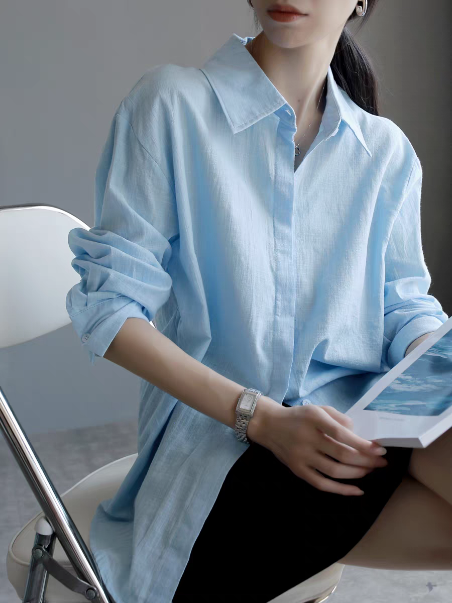 codenam 파란색 아마 봄 긴팔 셔츠 여성 다용도 출퇴근 면 린넨 루즈핏 자외선 차단 셔츠 맨위