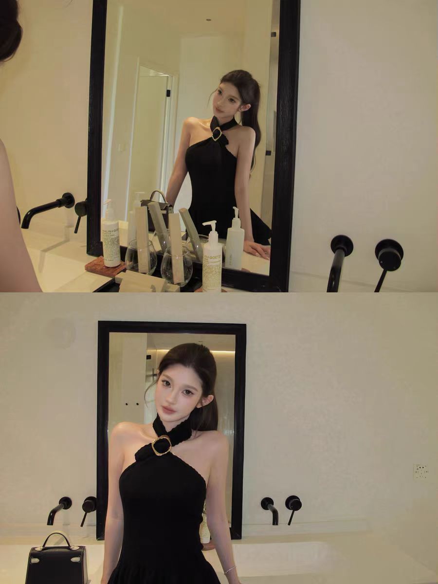 chicyou 하트 비트 샤오시엔 행침 목 금반지 버클 장식 연꽃 잎 밑단 허리 수축 커브 니트 슬립