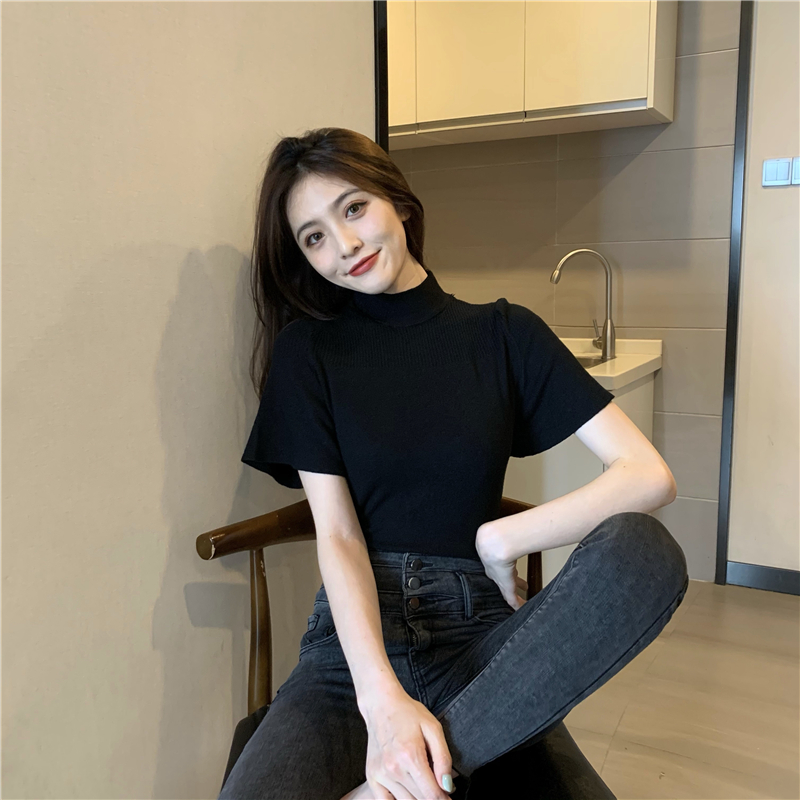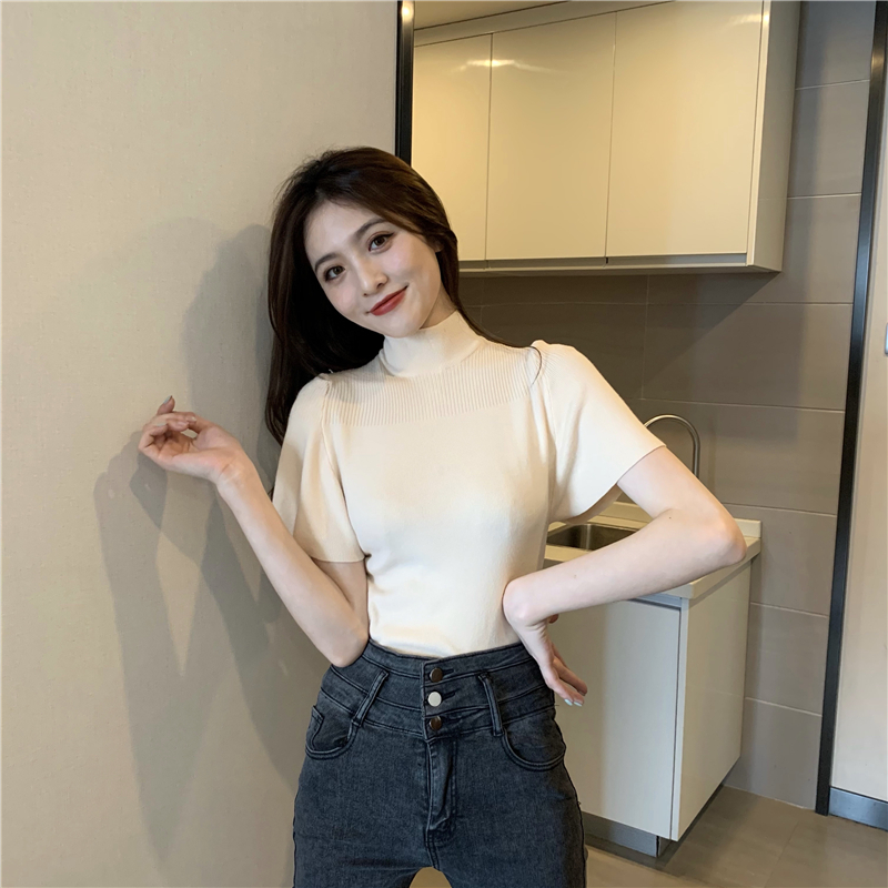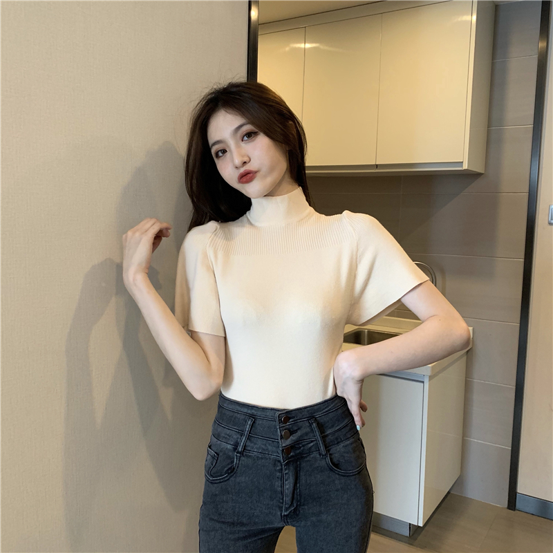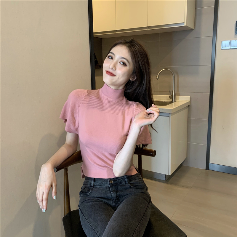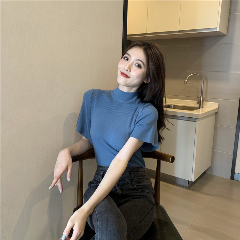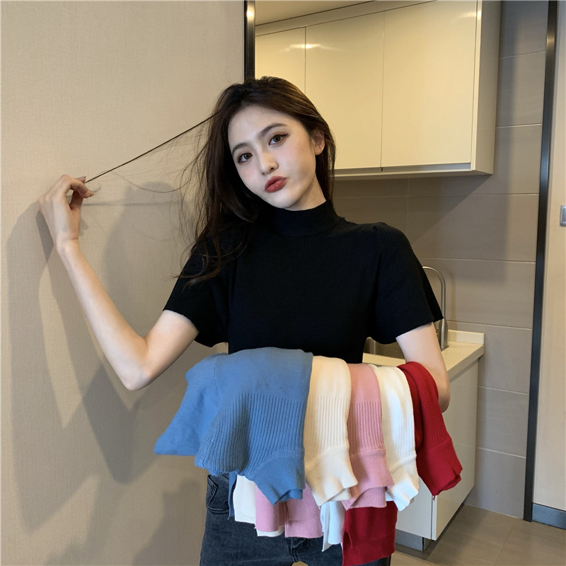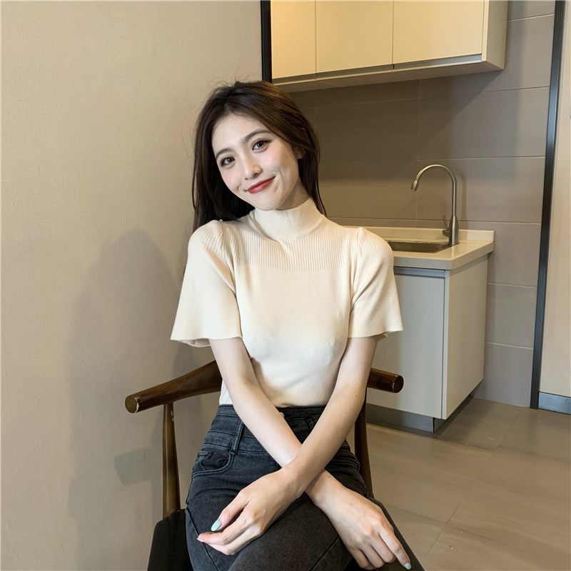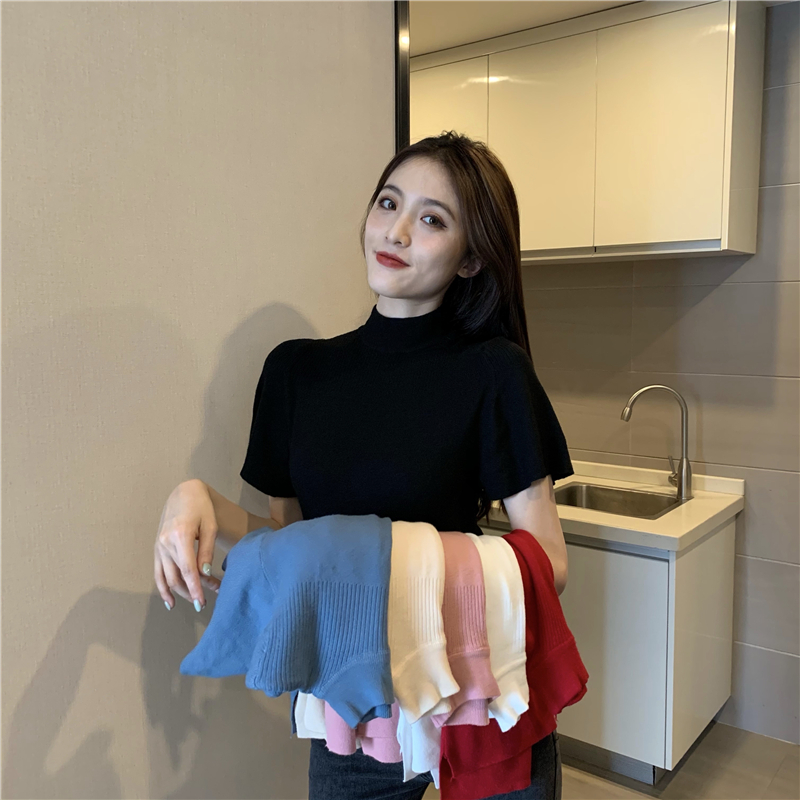 실사 정가 레트로 하프 칼라 Feifei 소매 니트 슬림해 보이는 기본 셔츠 반팔 니트 맨위