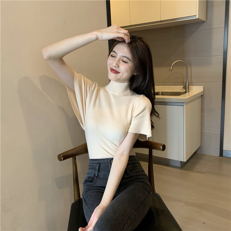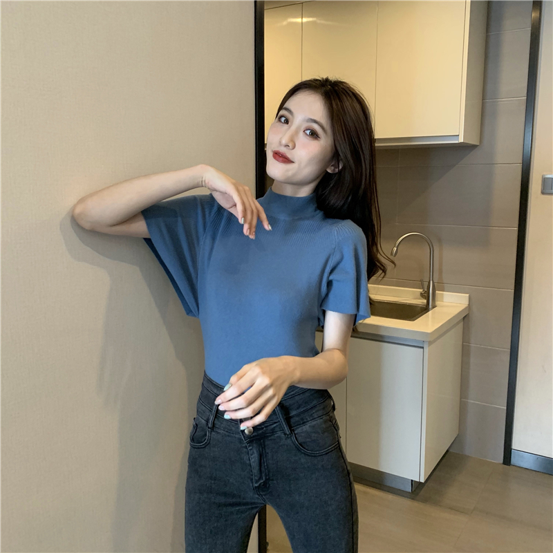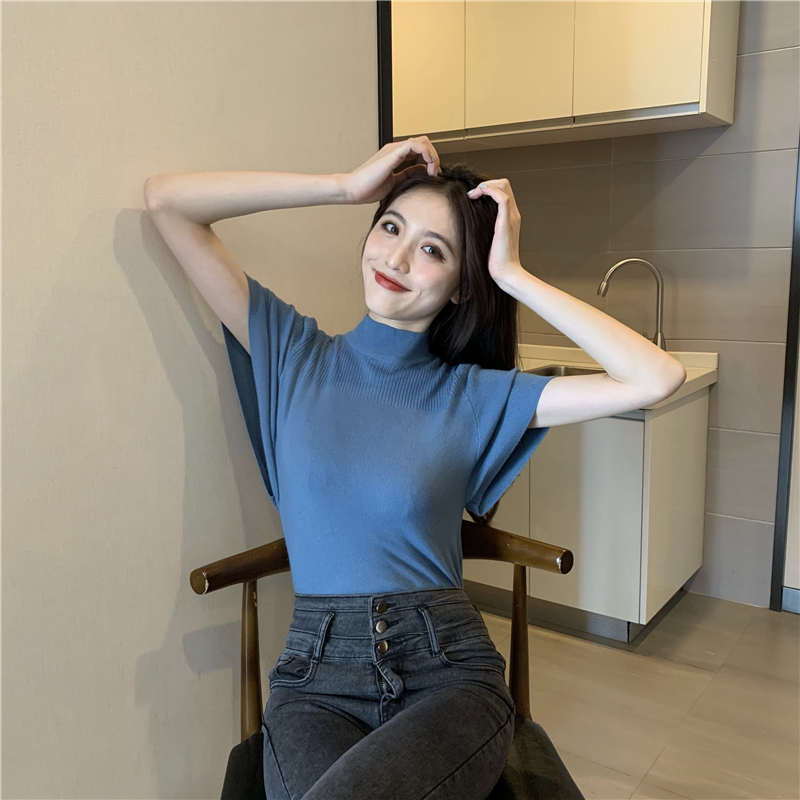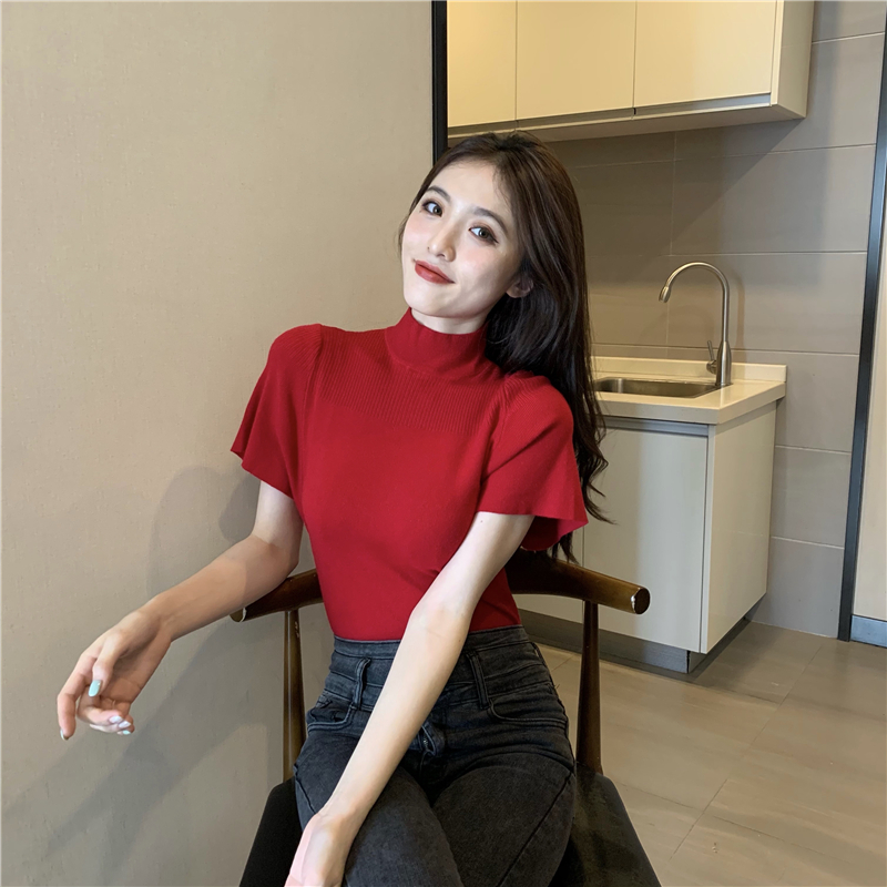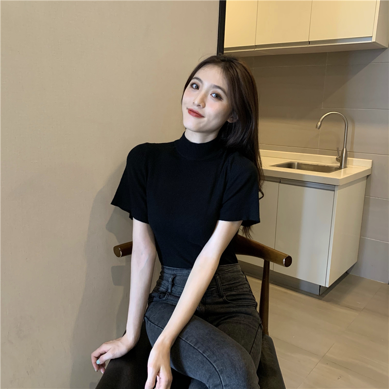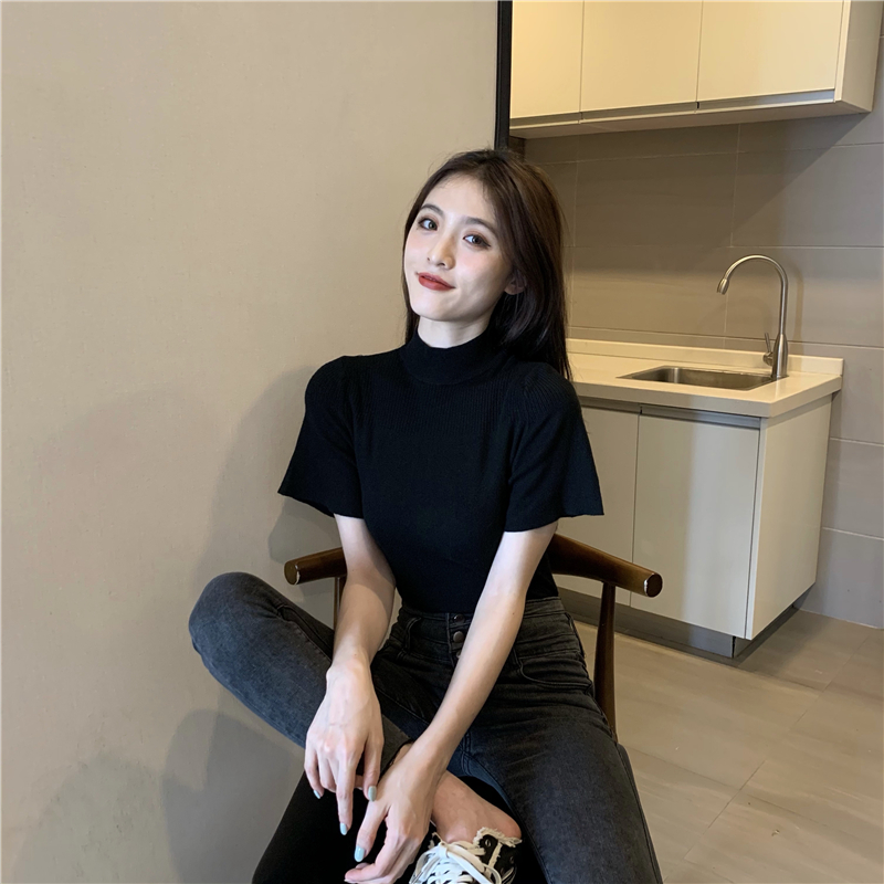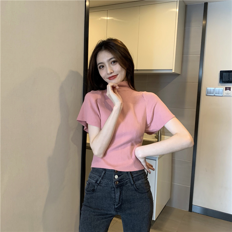 실사 정가 레트로 하프 칼라 Feifei 소매 니트 슬림해 보이는 기본 셔츠 반팔 니트 맨위