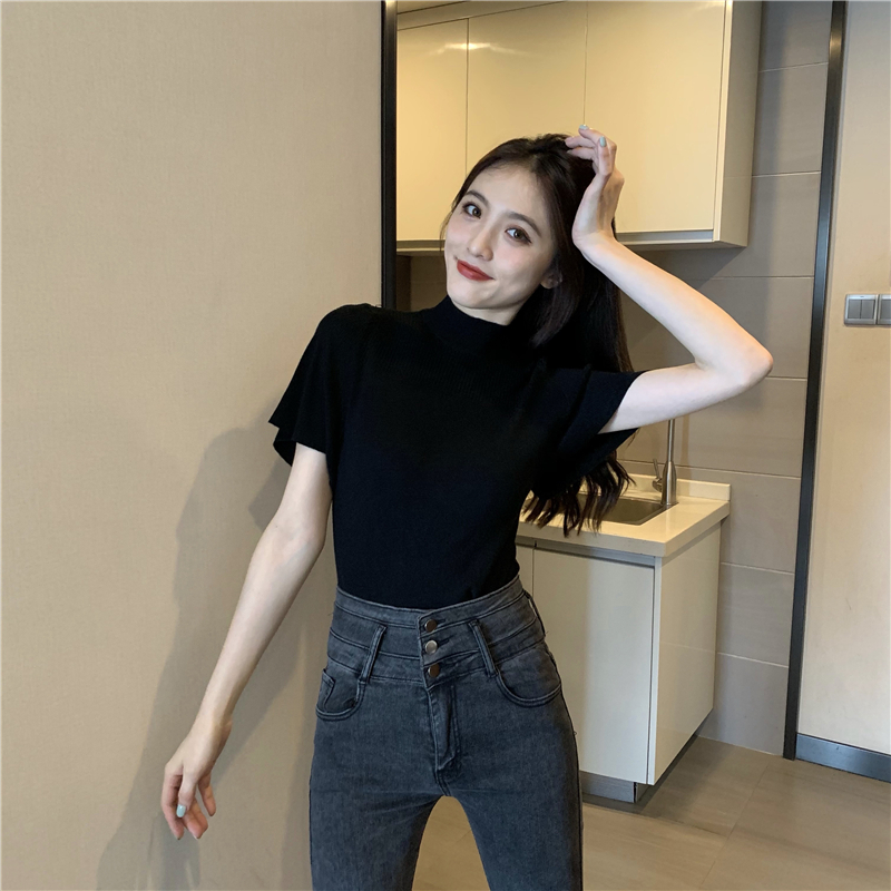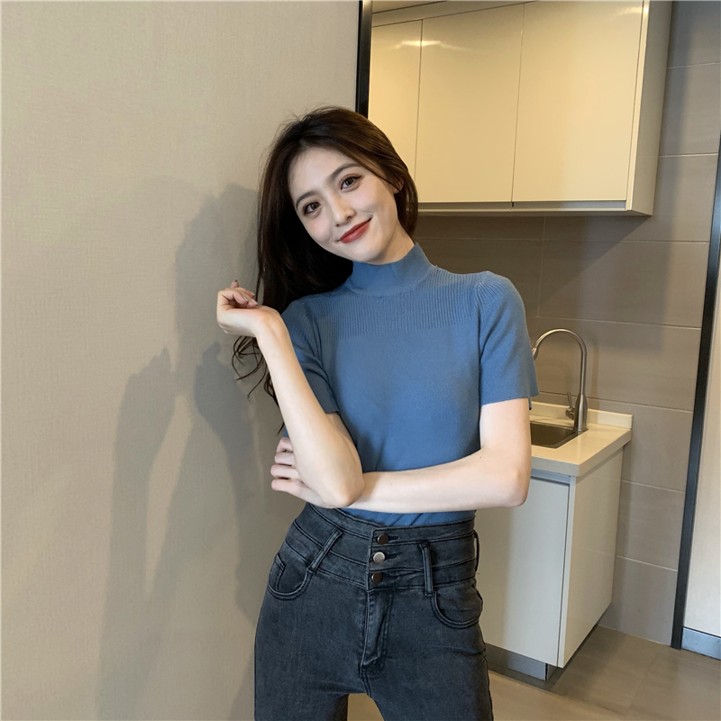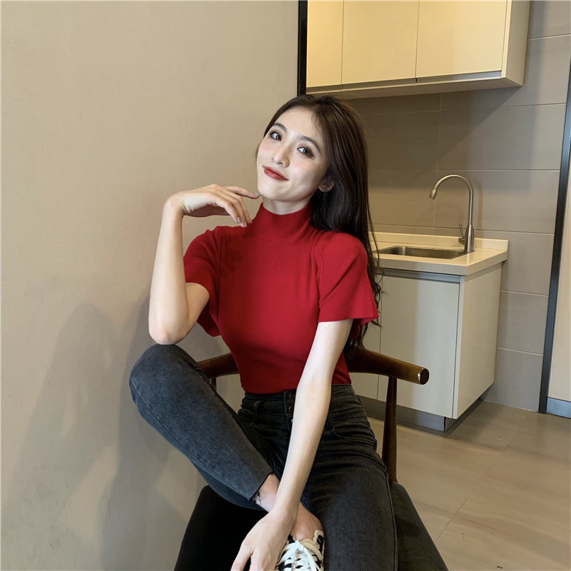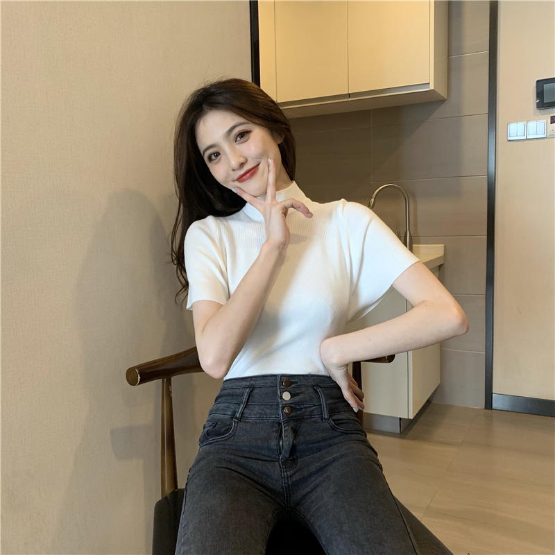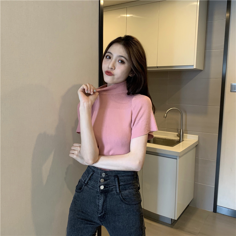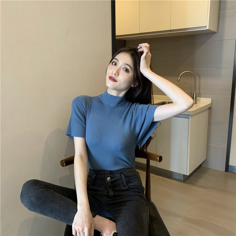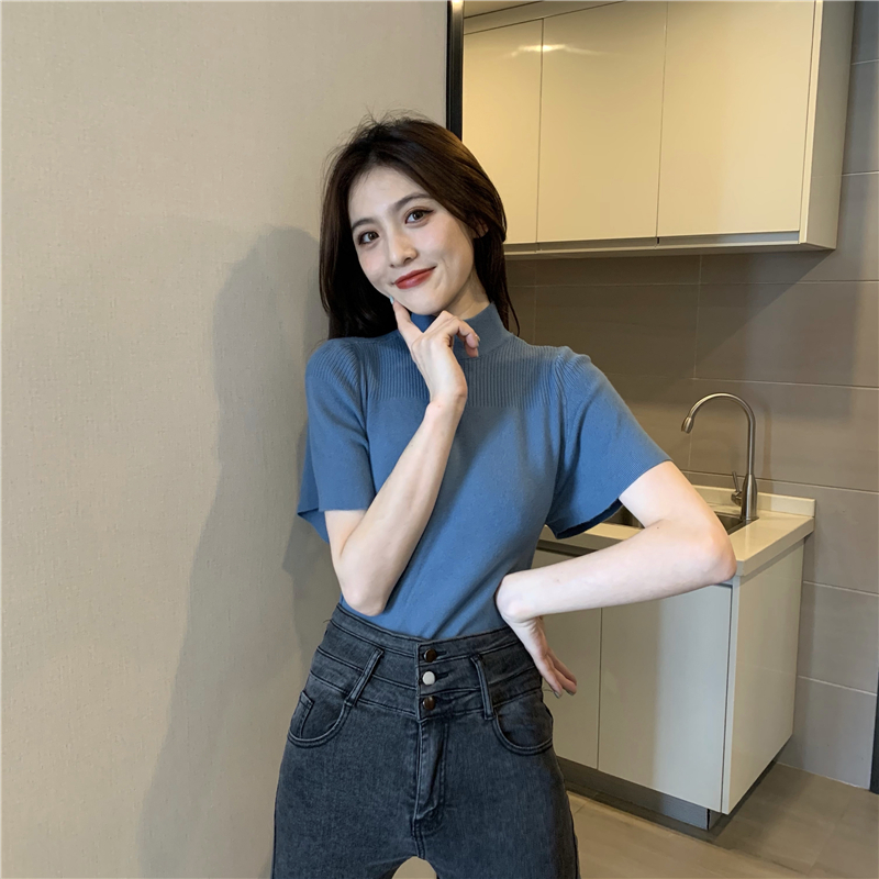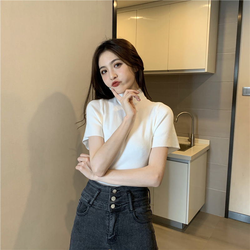실사 정가 레트로 하프 칼라 Feifei 소매 니트 슬림해 보이는 기본 셔츠 반팔 니트 맨위