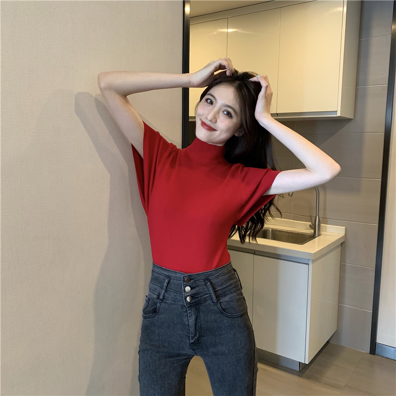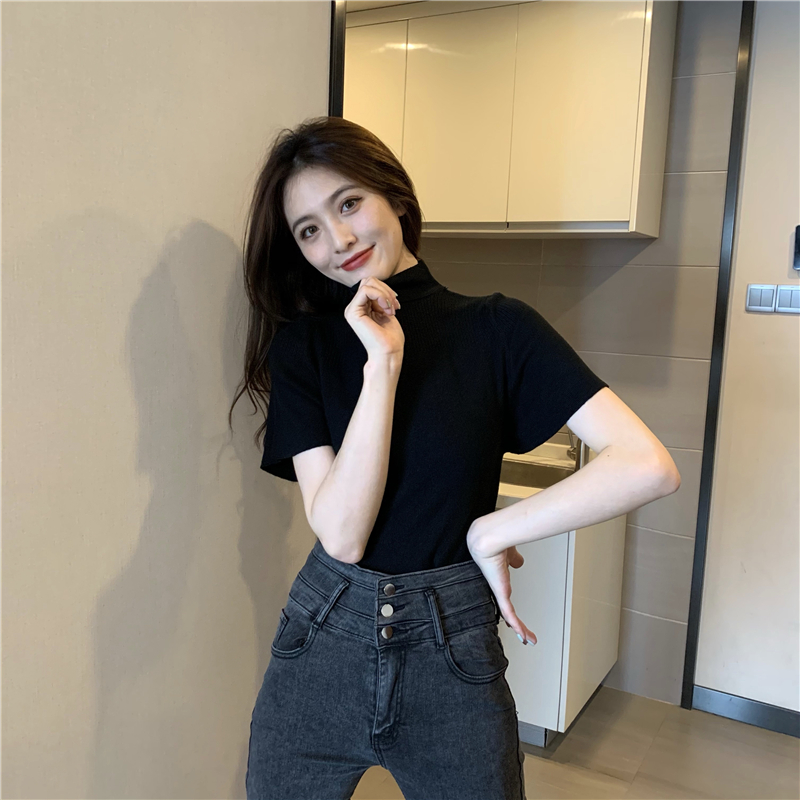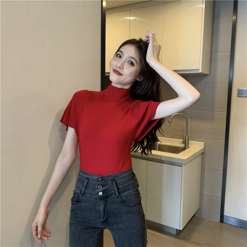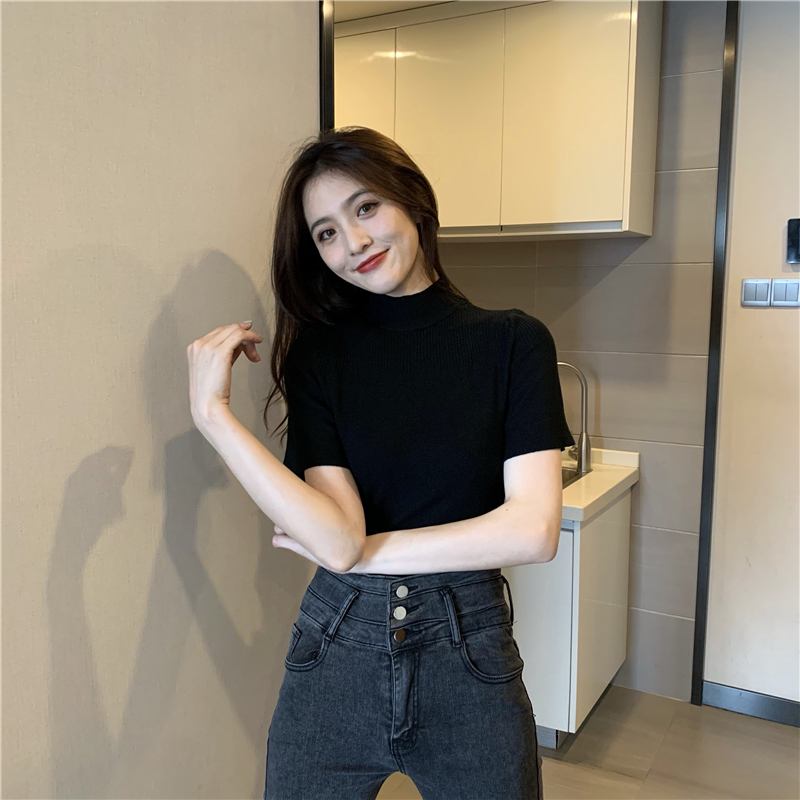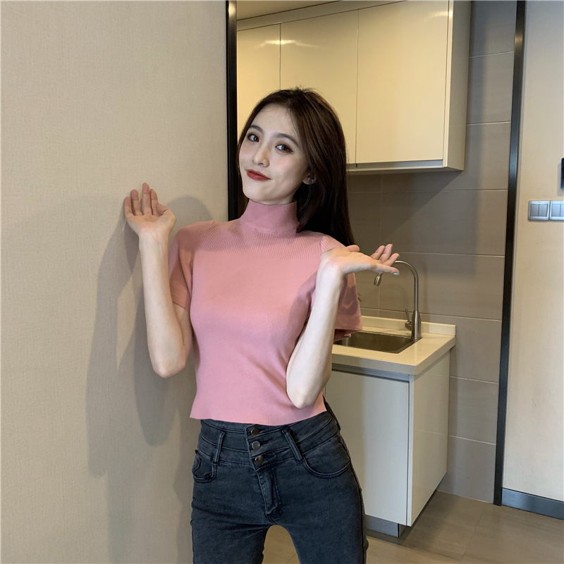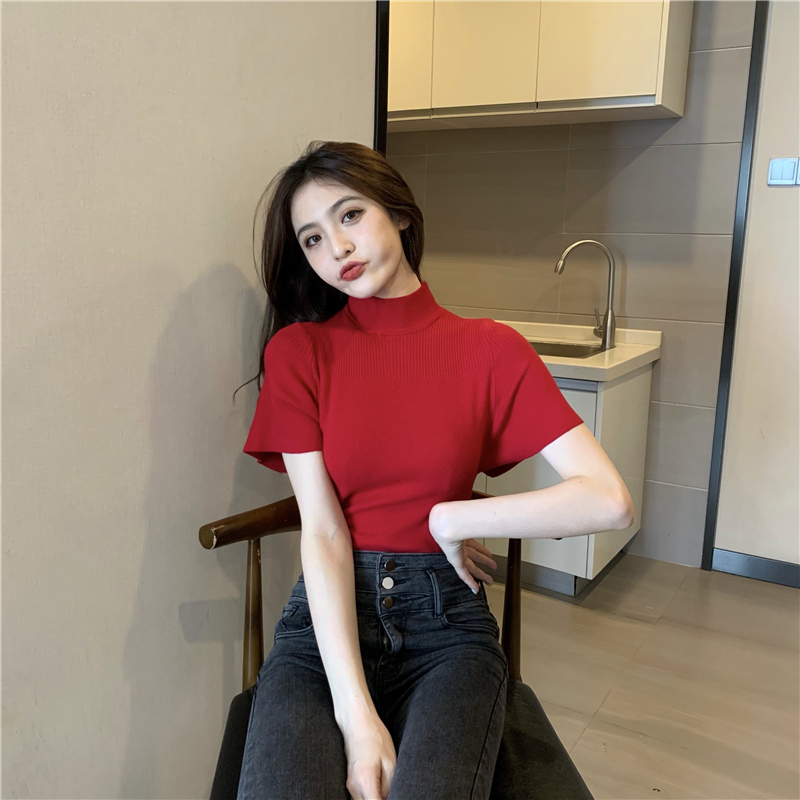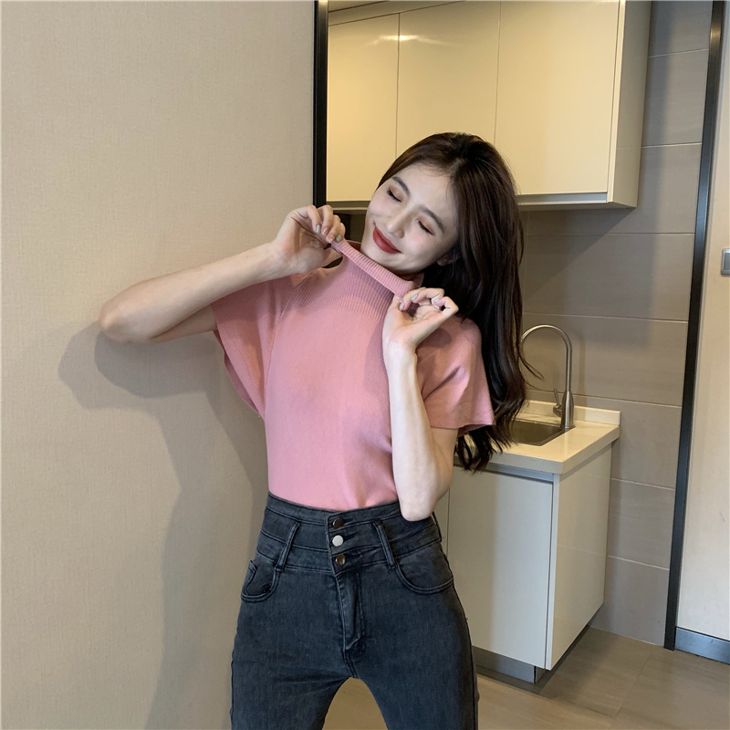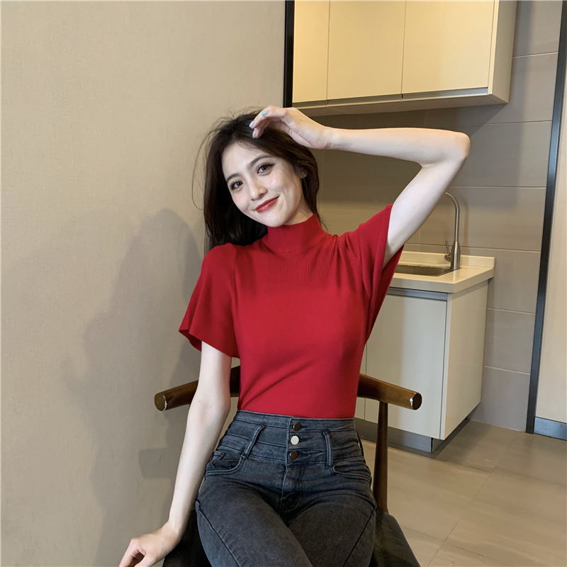 실사 정가 레트로 하프 칼라 Feifei 소매 니트 슬림해 보이는 기본 셔츠 반팔 니트 맨위