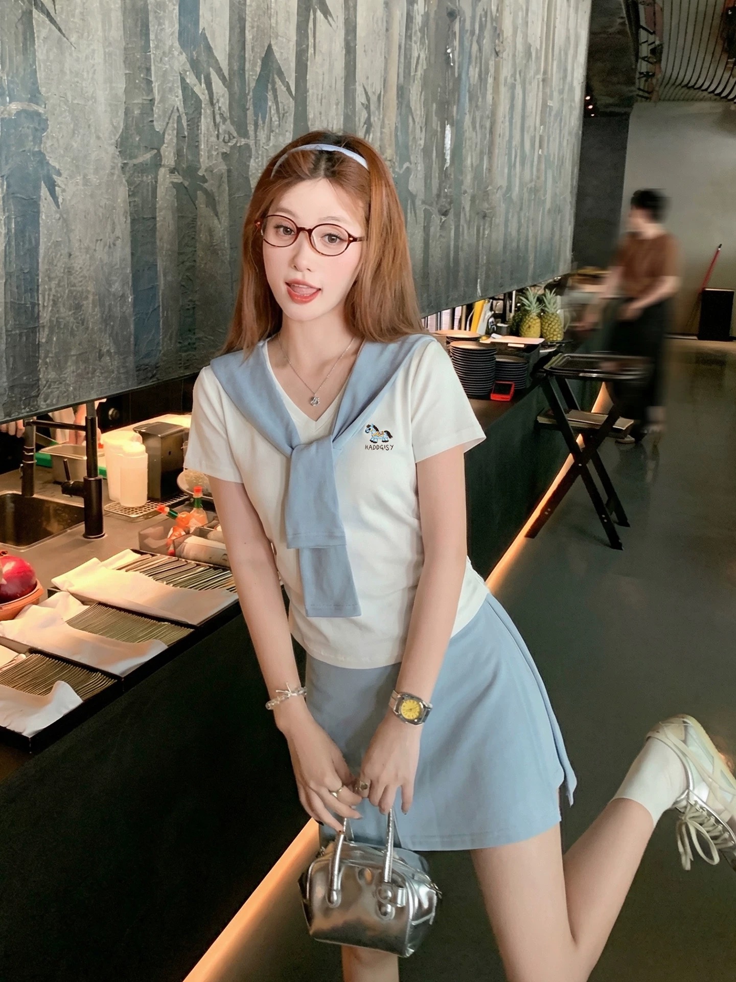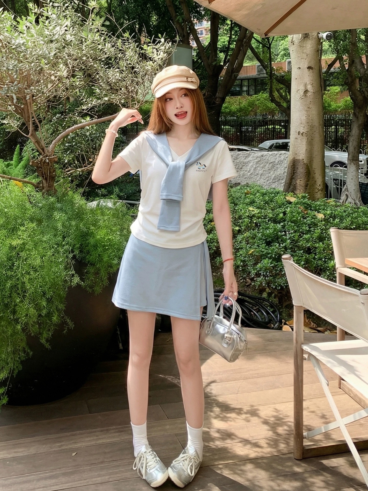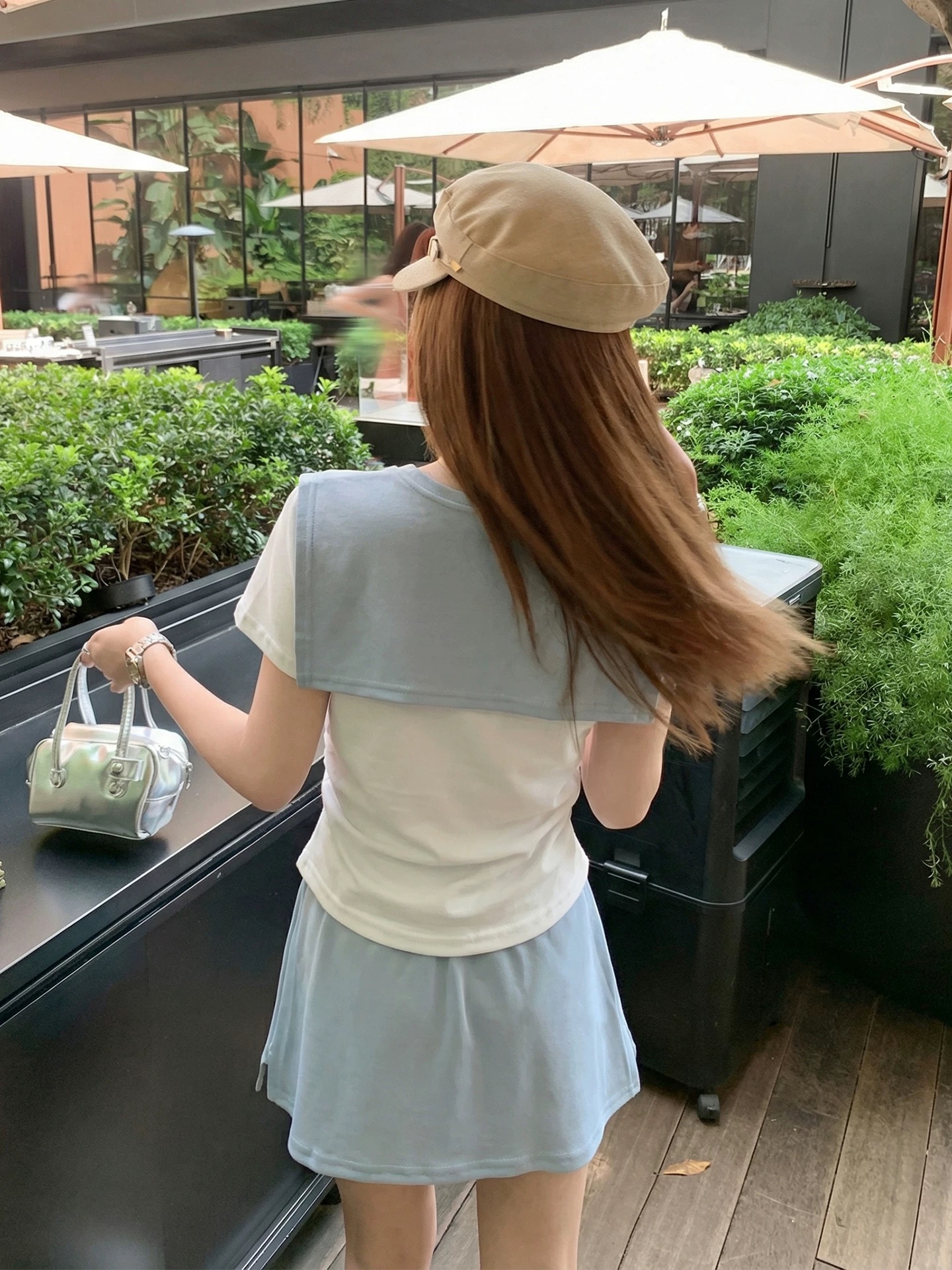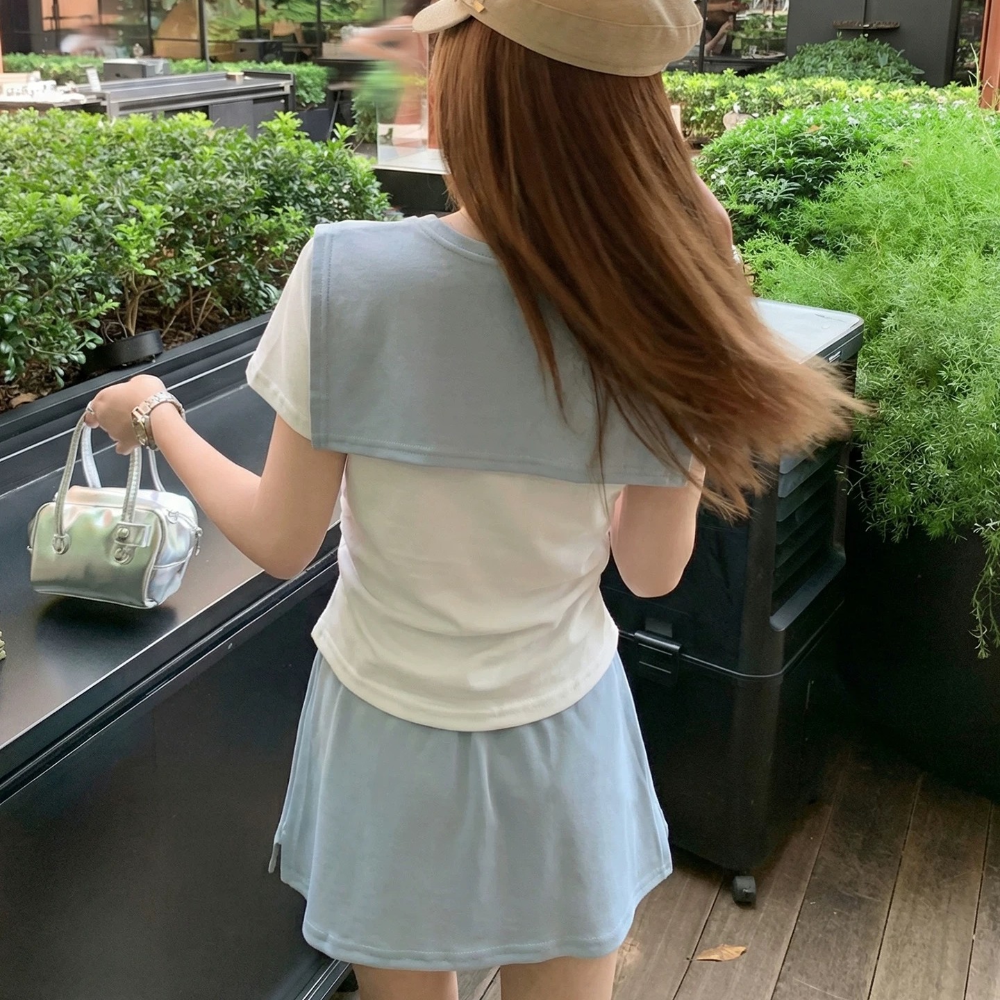 배색 숄 칼라 반팔 티셔츠 불규칙 반신 미니 스커트 달콤한 자매 연령 감소 캐주얼 투피스 세트